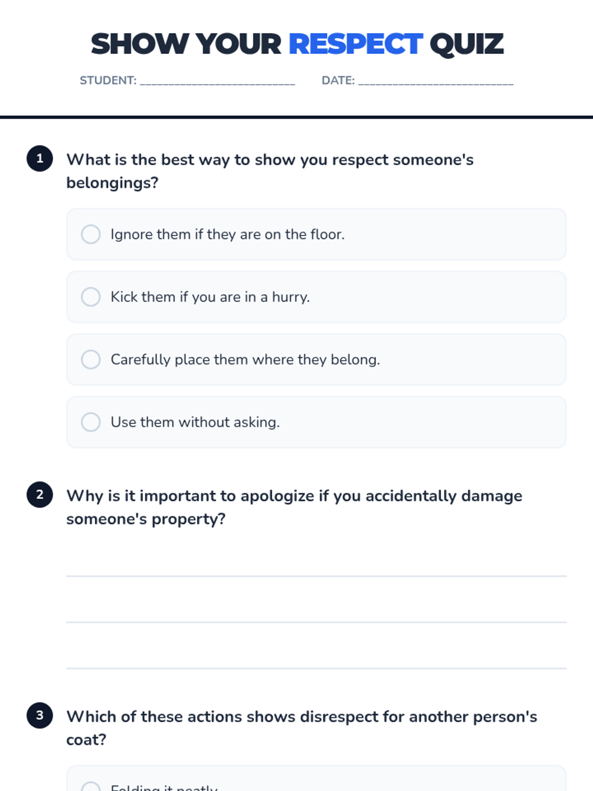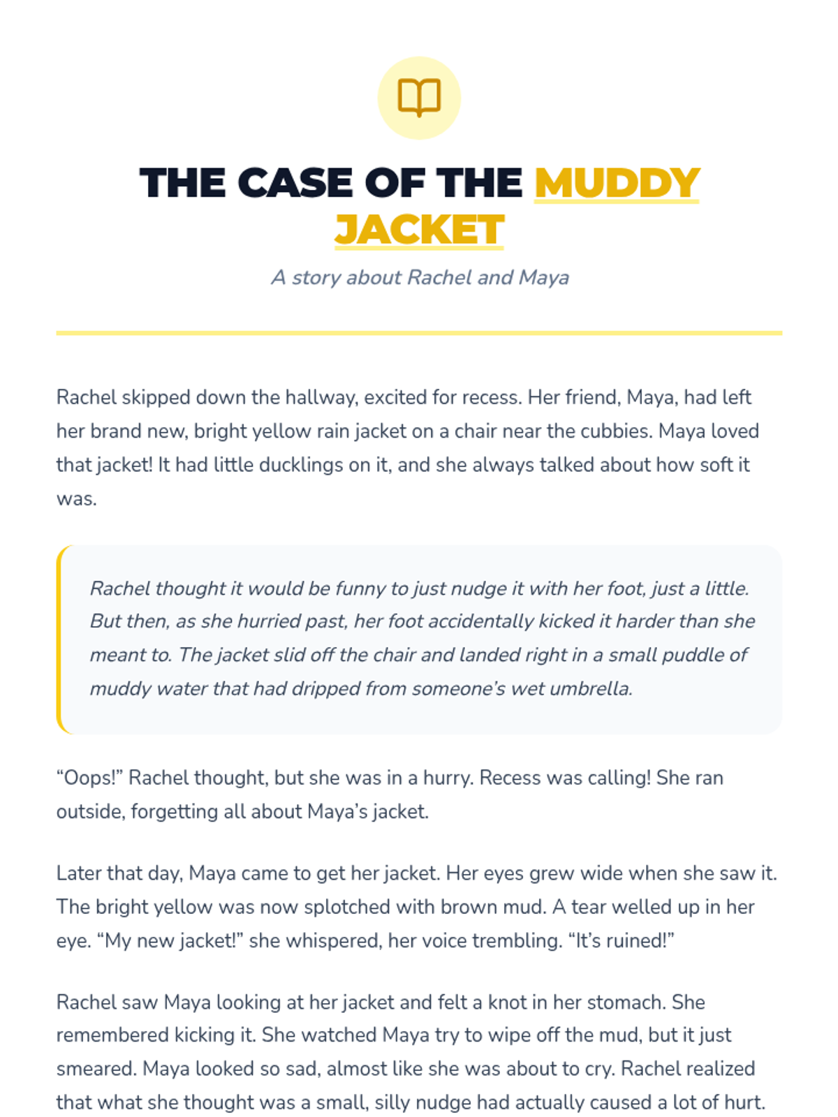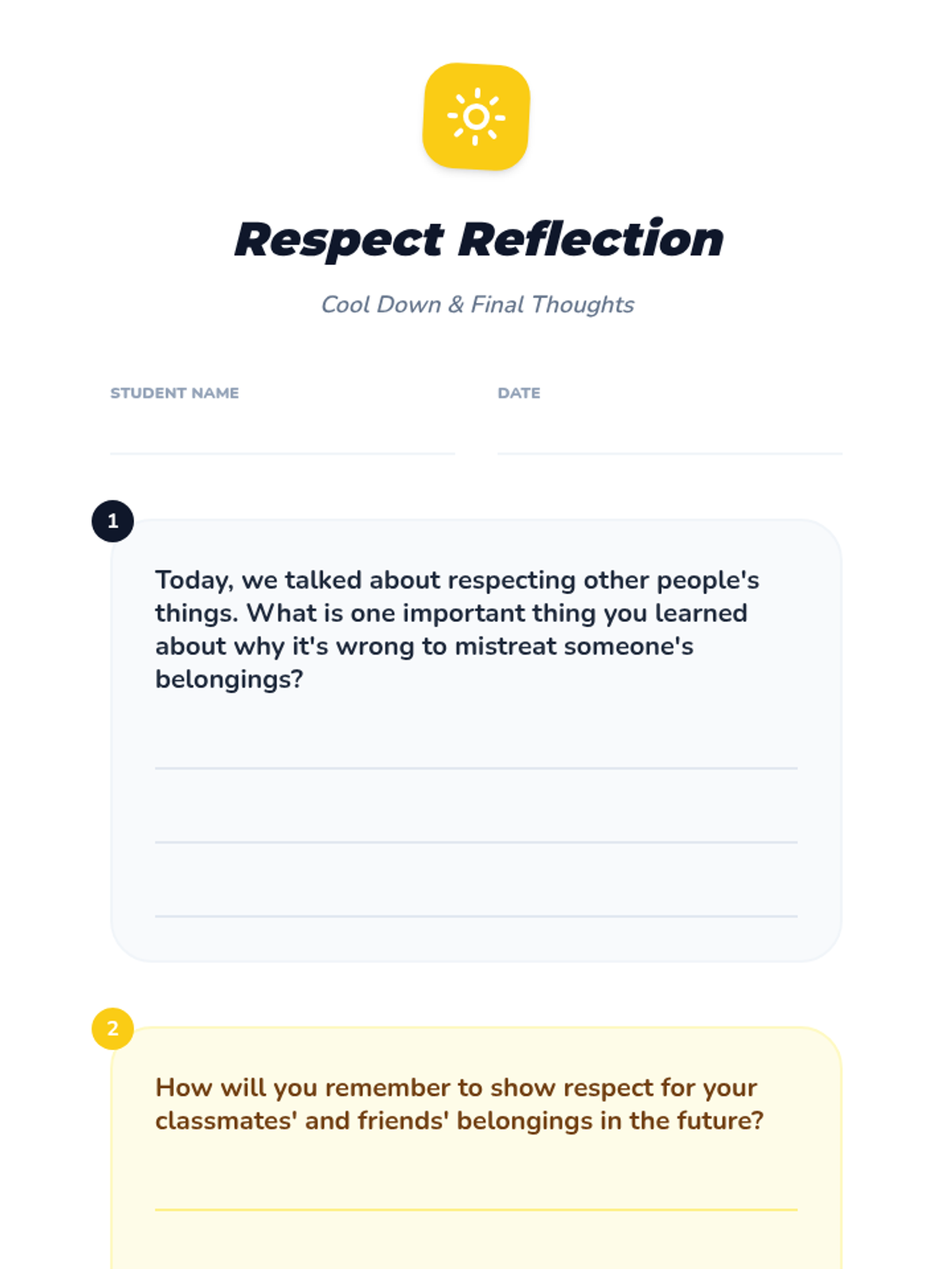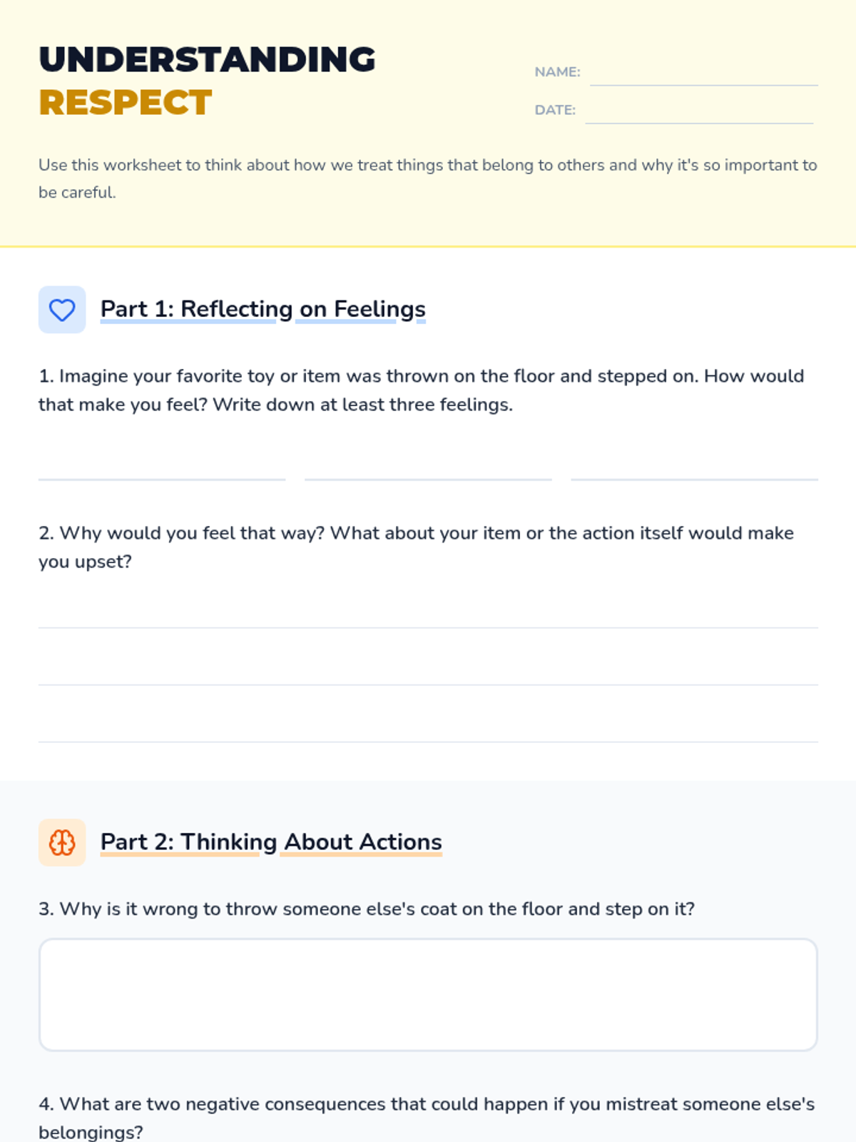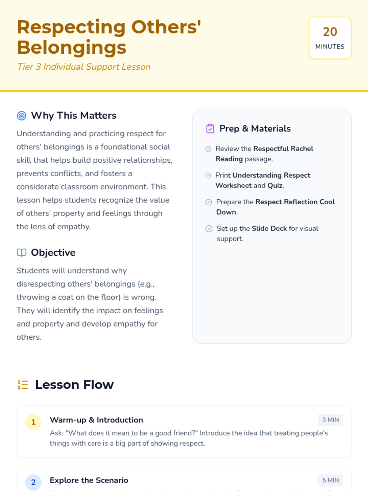 A 20-minute, Tier 3 individual lesson for a 4th-grade girl focused on empathy and the importance of treating others' property with care. Through a relatable story and reflection, the student explores the emotional and physical impact of disrespecting belongings.