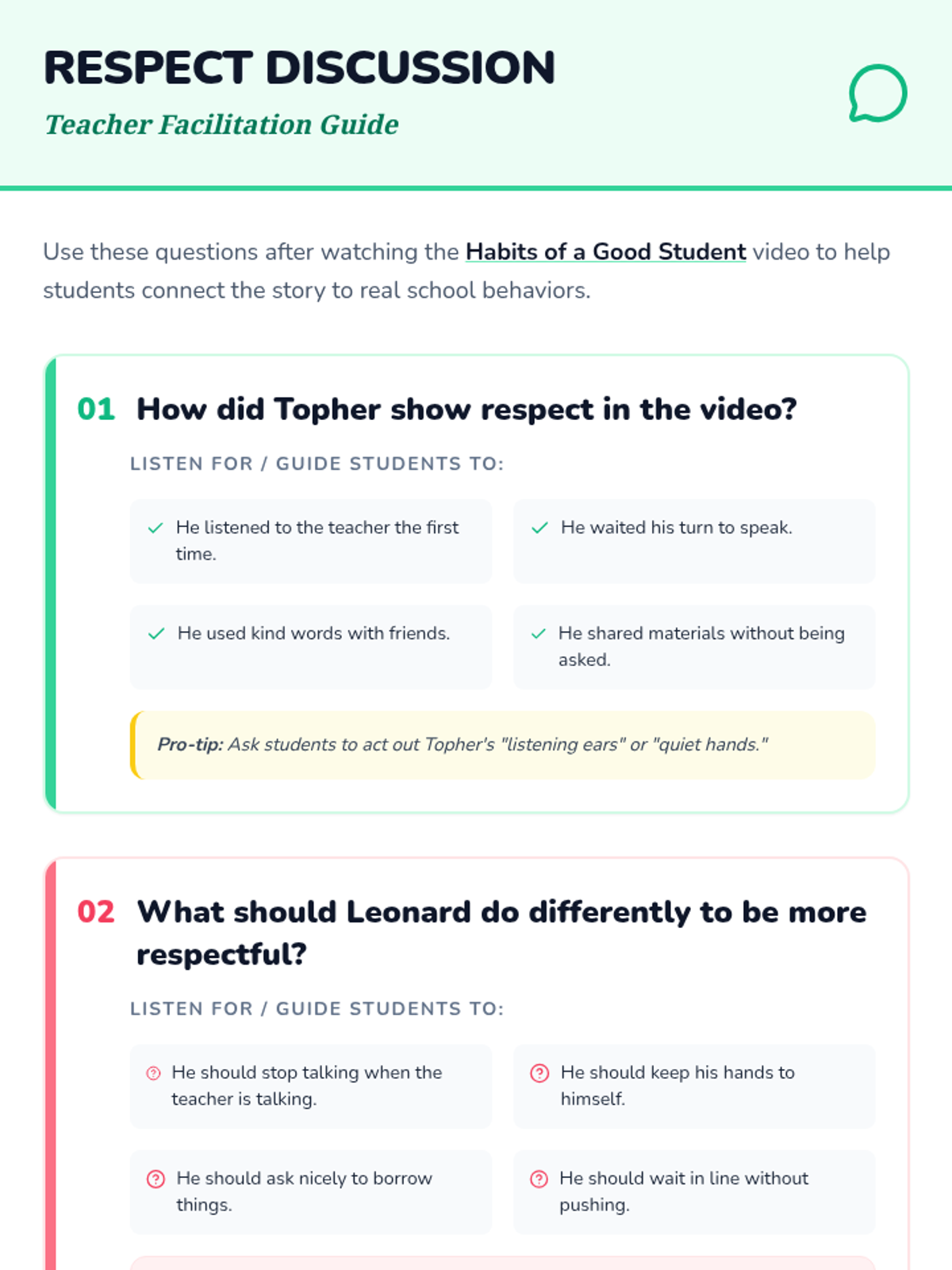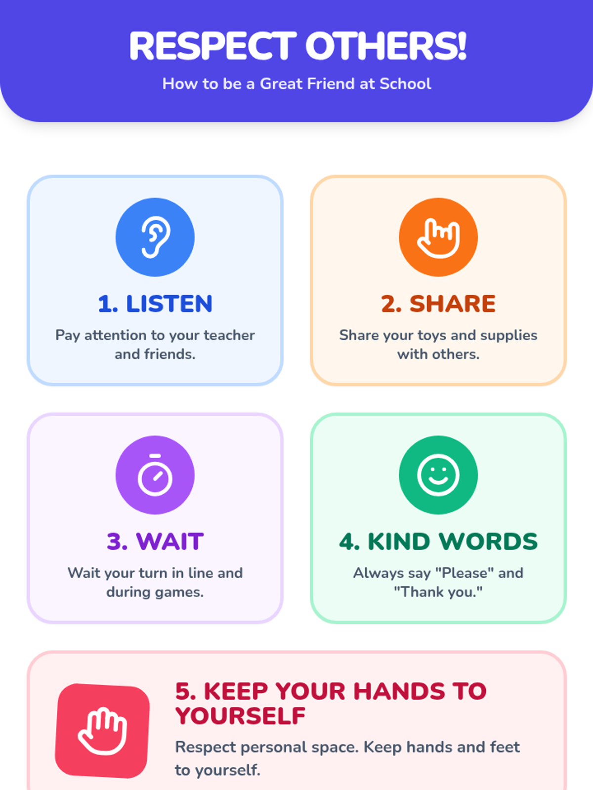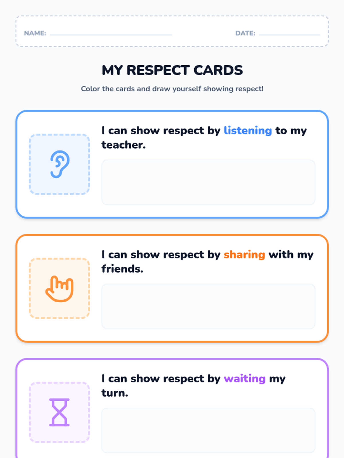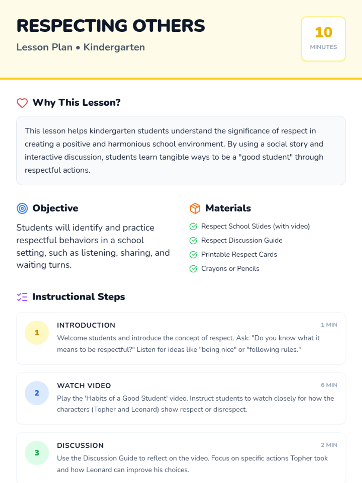 A kindergarten lesson focused on teaching respect through a social story, interactive discussion, and creative activity. Students learn to define respect and identify specific behaviors like listening, sharing, and waiting turns.