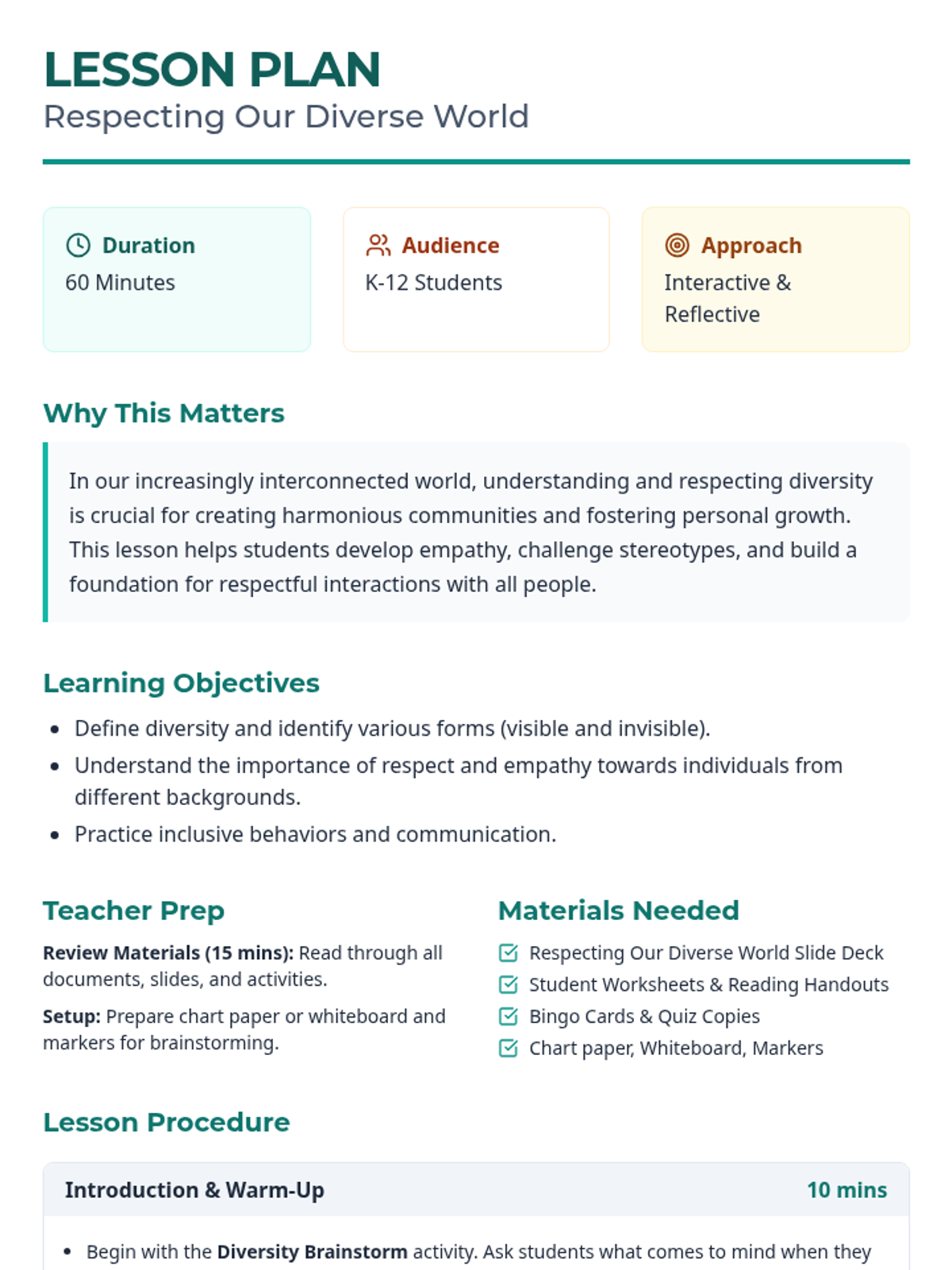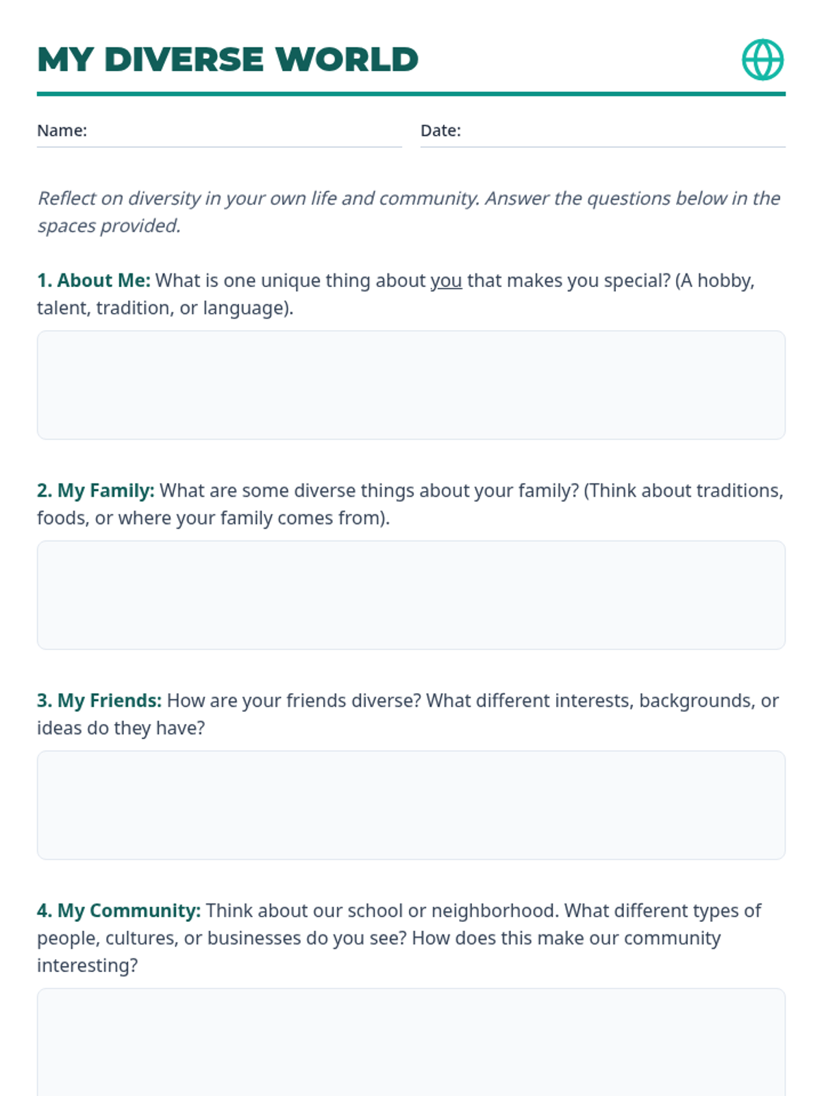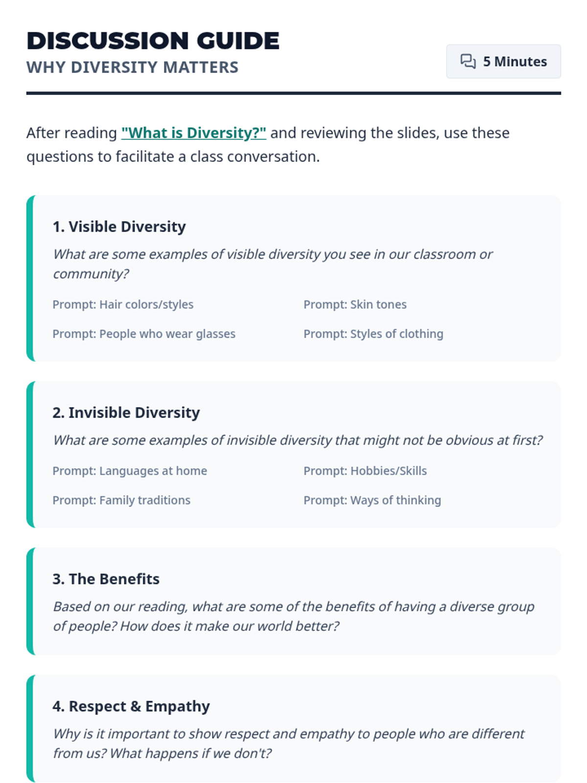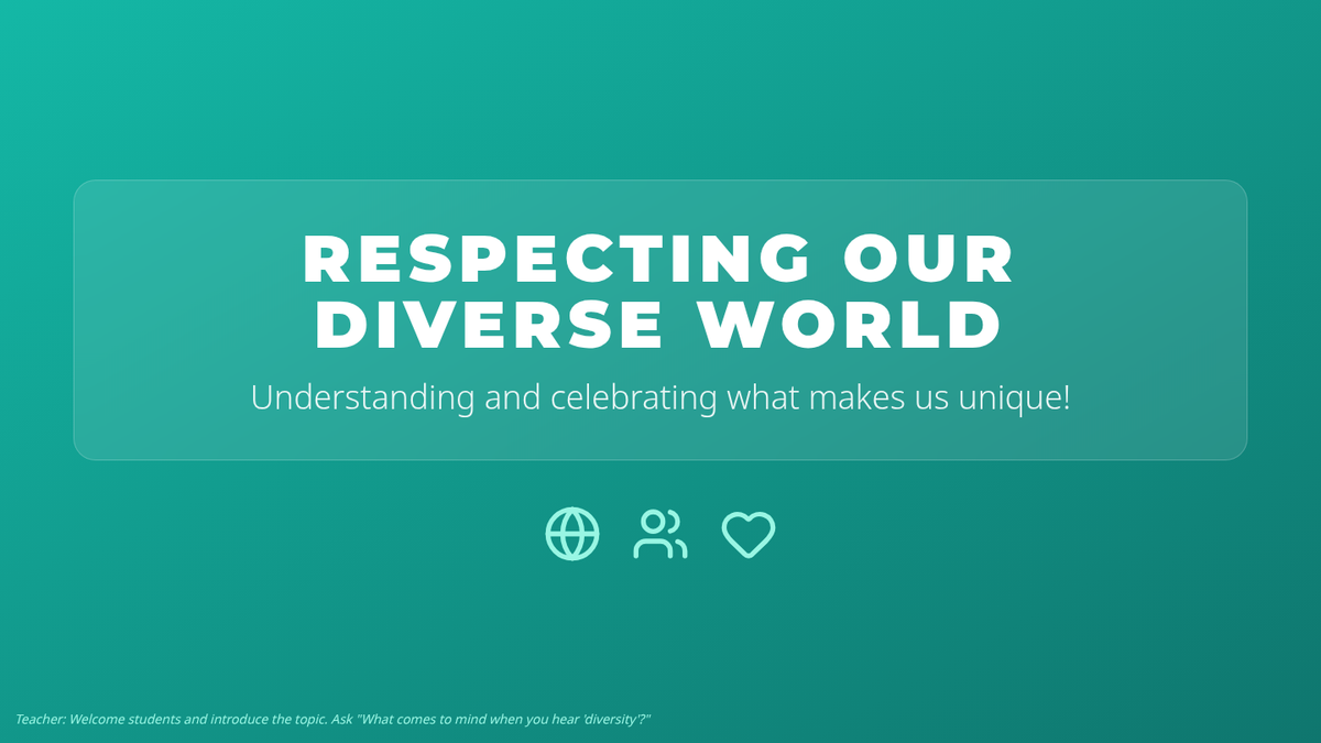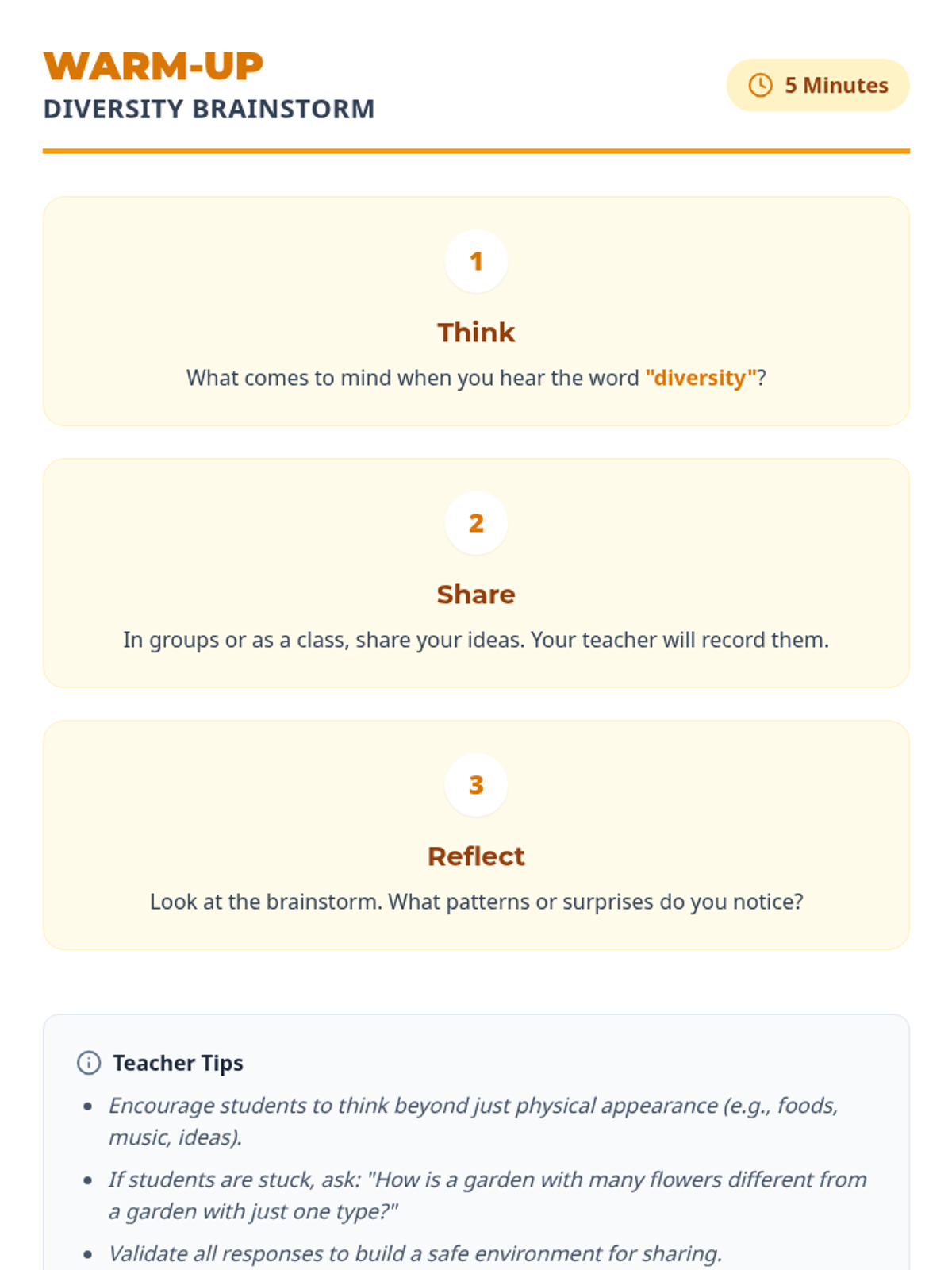 This lesson helps students explore the meaning of diversity, celebrate unique backgrounds, and develop empathy and respect for all people through interactive activities and reflection.