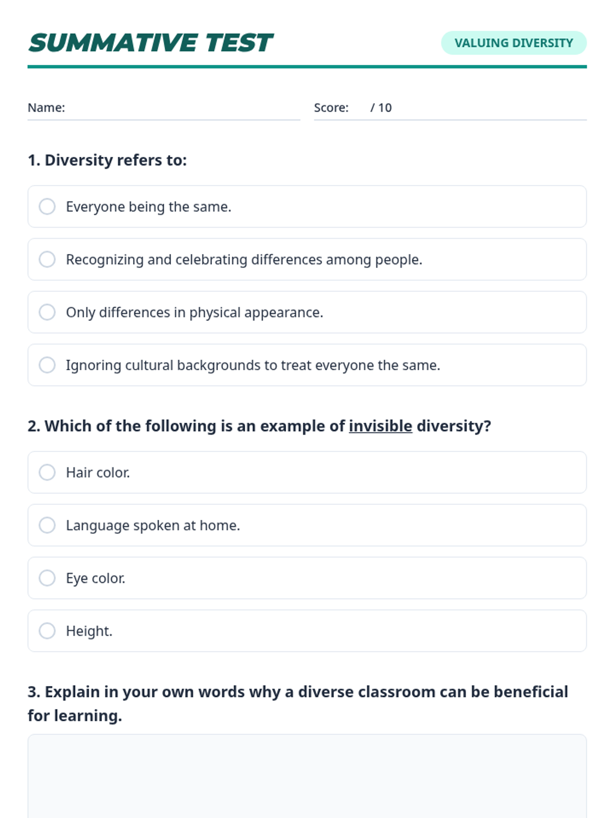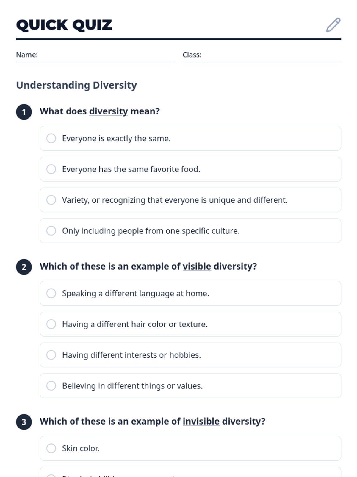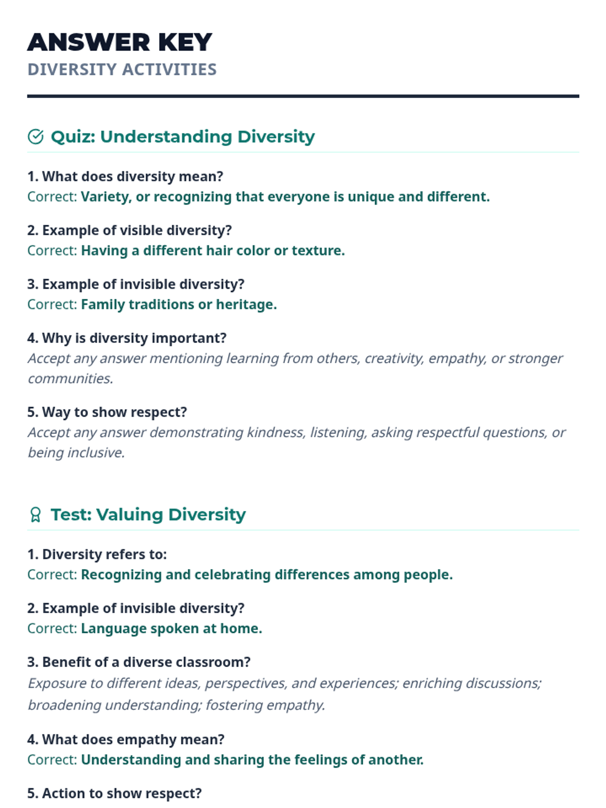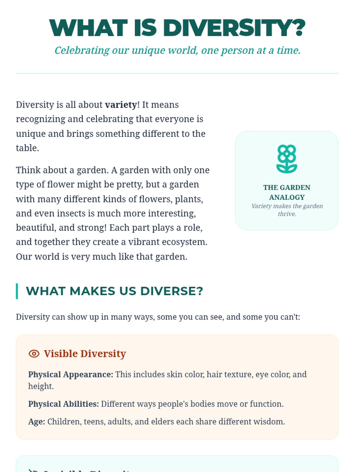 This lesson helps students explore the meaning of diversity, celebrate unique backgrounds, and develop empathy and respect for all people through interactive activities and reflection.