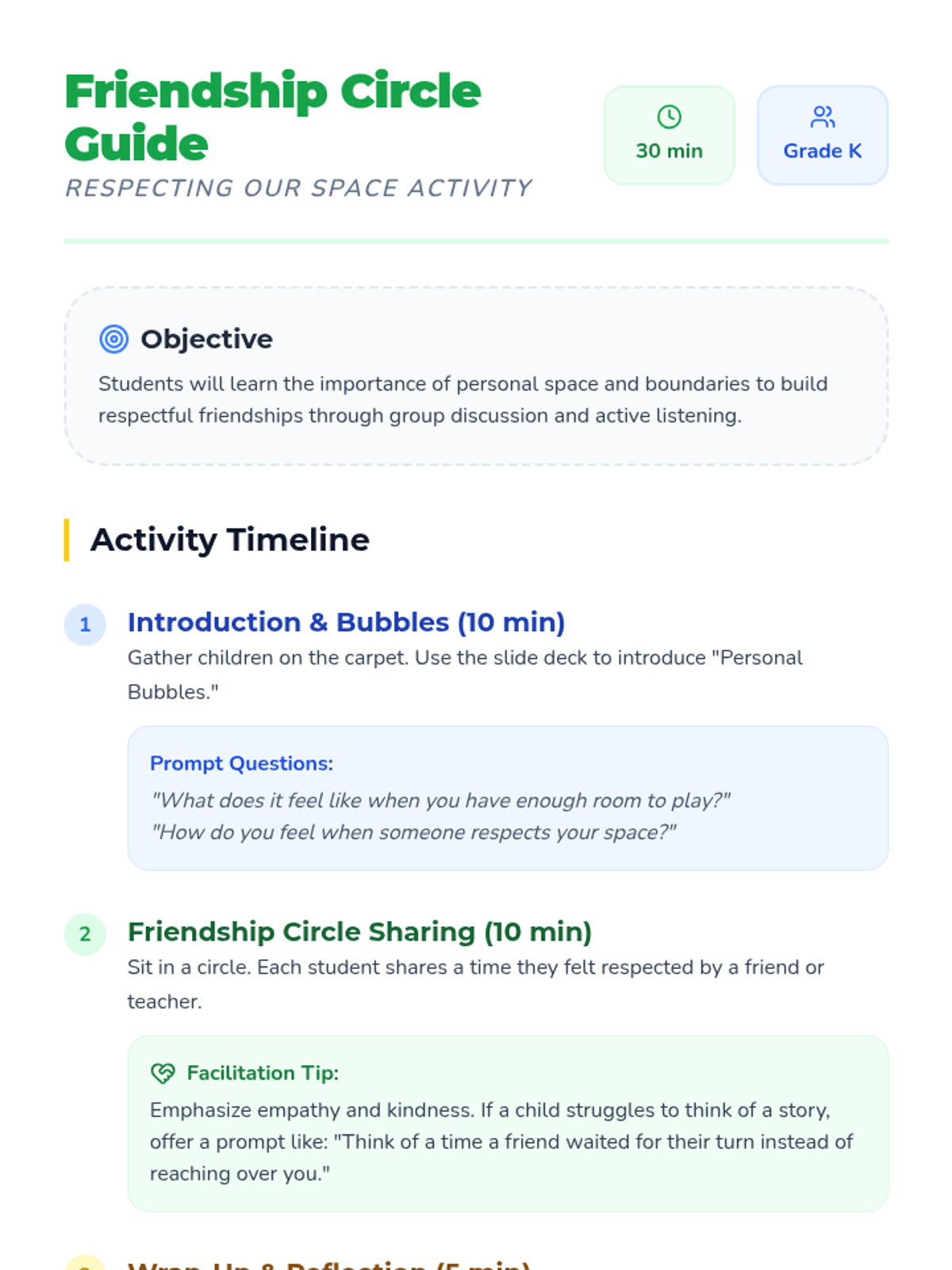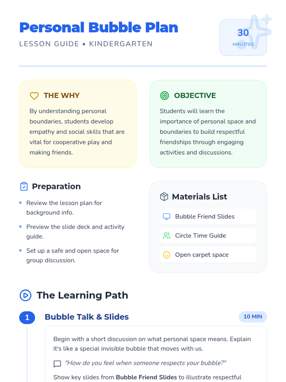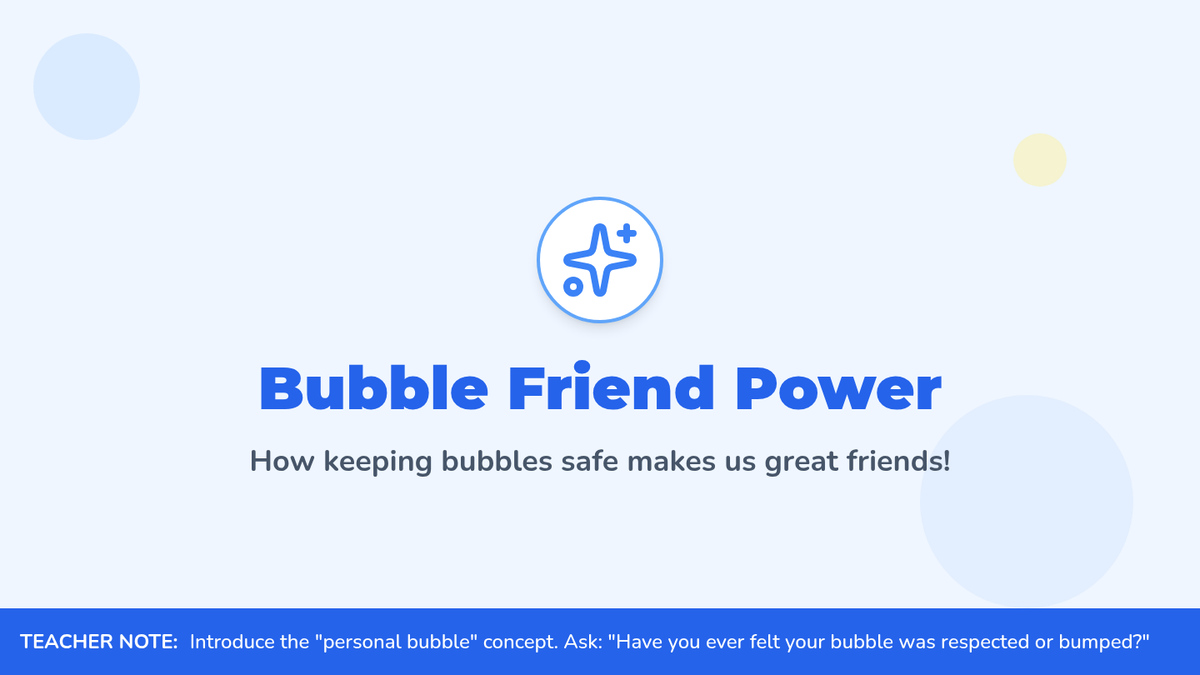 A 30-minute Kindergarten lesson focused on teaching personal boundaries and respect as a foundation for building strong friendships. Students explore the concept of 'personal bubbles' through slides, discussion, and interactive circle time activities.