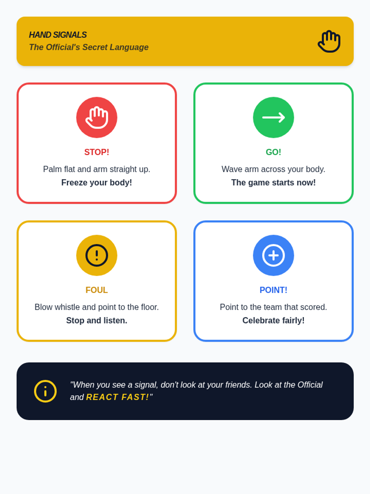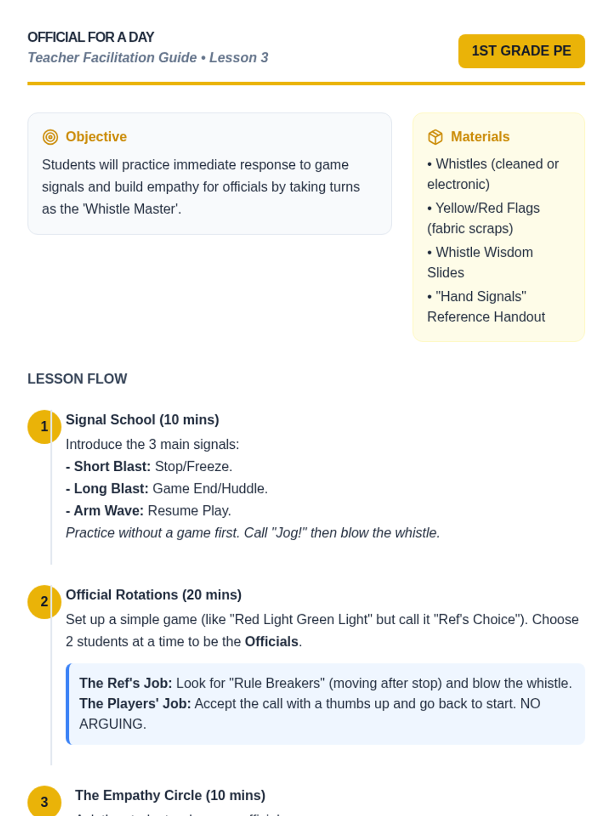 Students practice respecting the authority of officials by taking turns as referees and responding to game signals.