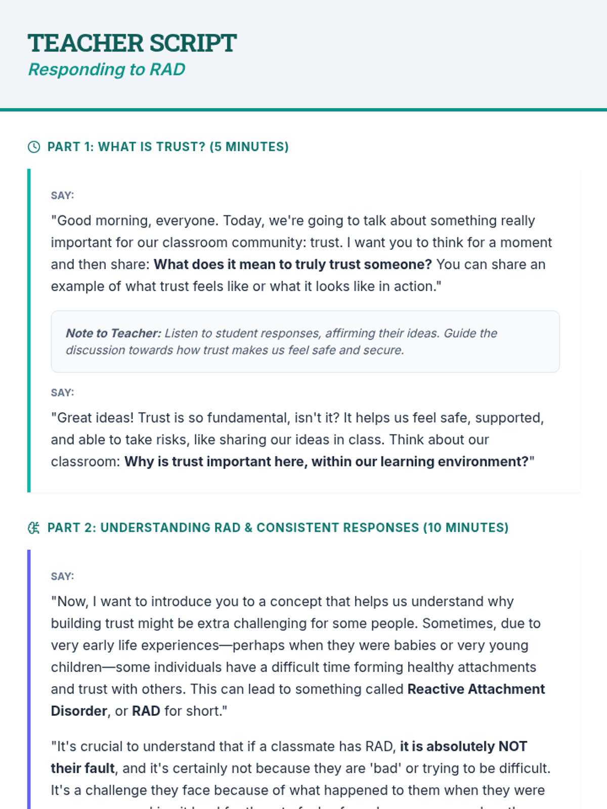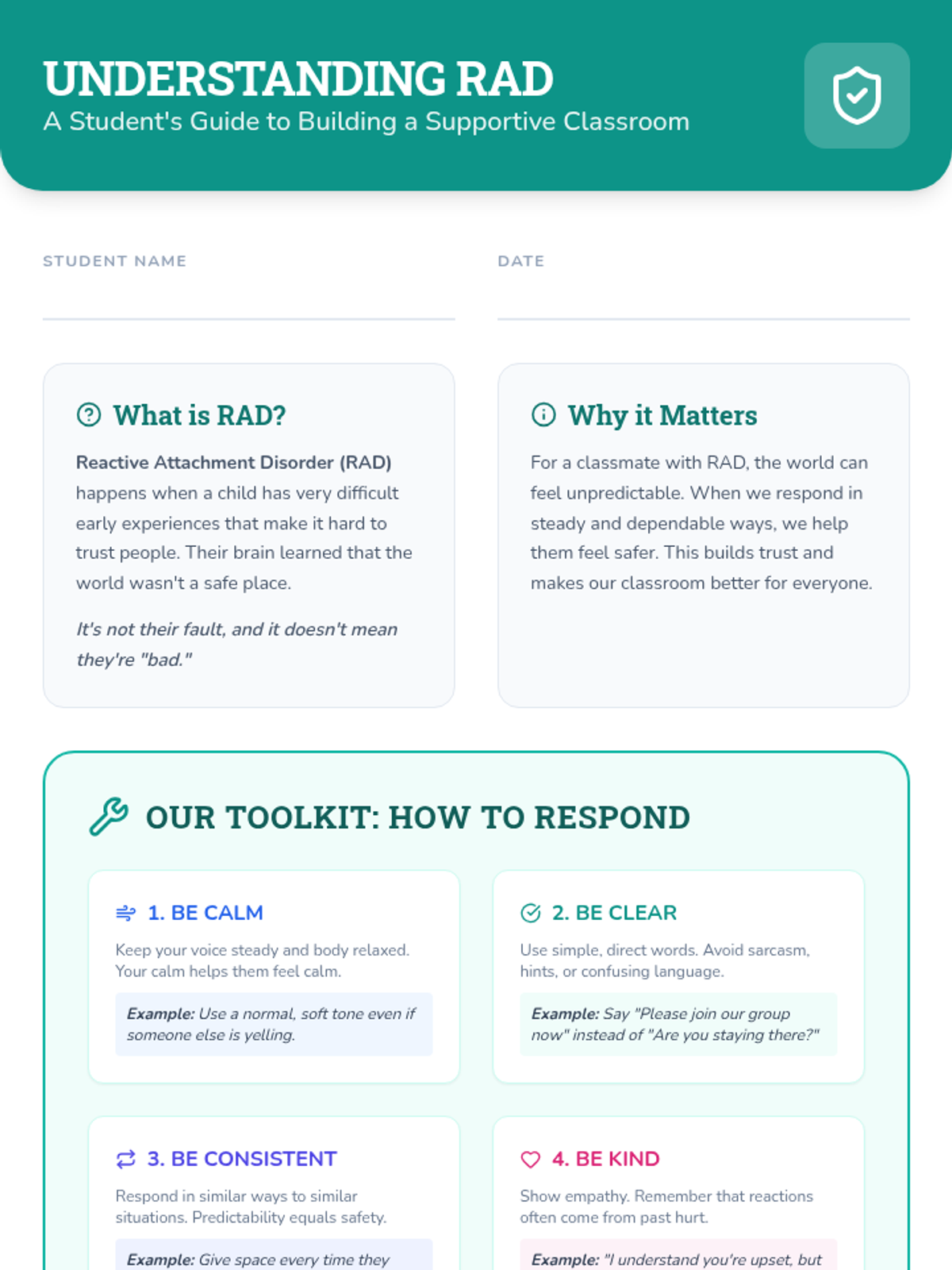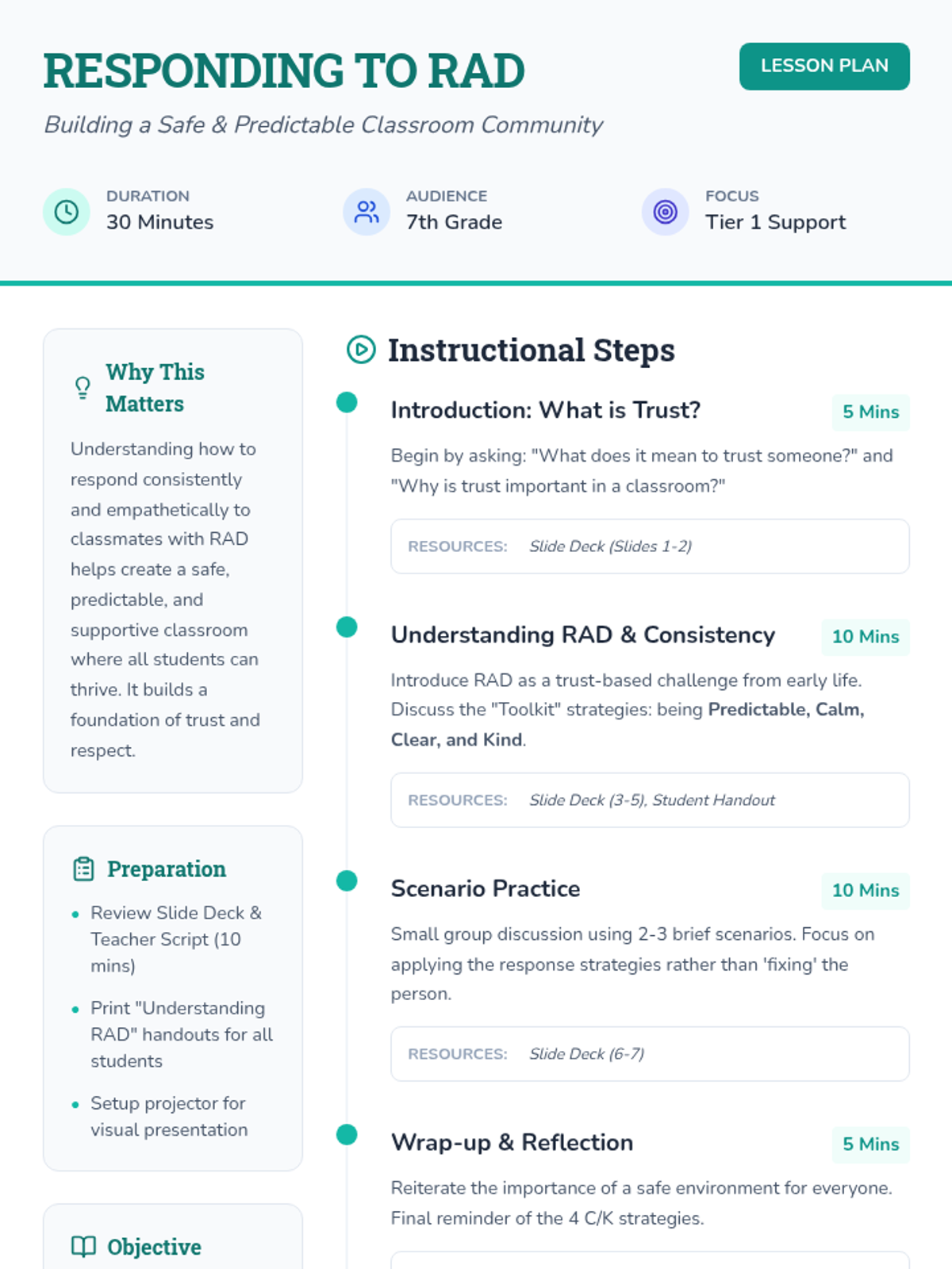 This lesson provides 7th-grade students with practical strategies (Calm, Clear, Consistent, Kind) to respond empathetically to peers with Reactive Attachment Disorder (RAD), fostering a safer and more predictable classroom environment.