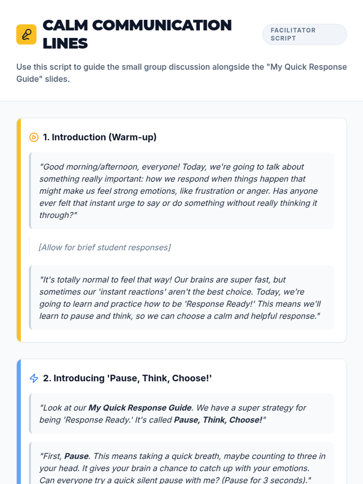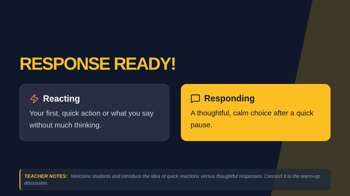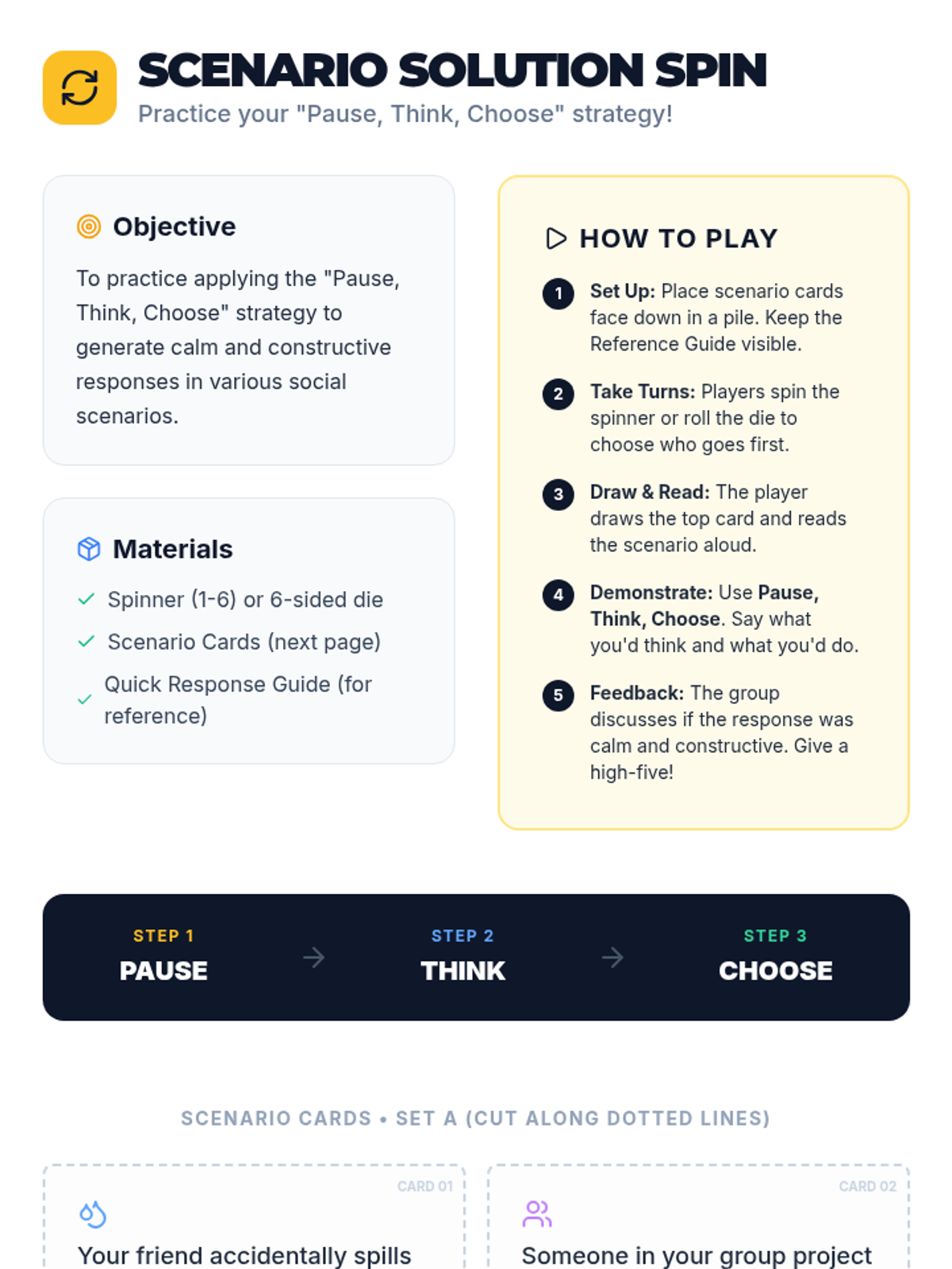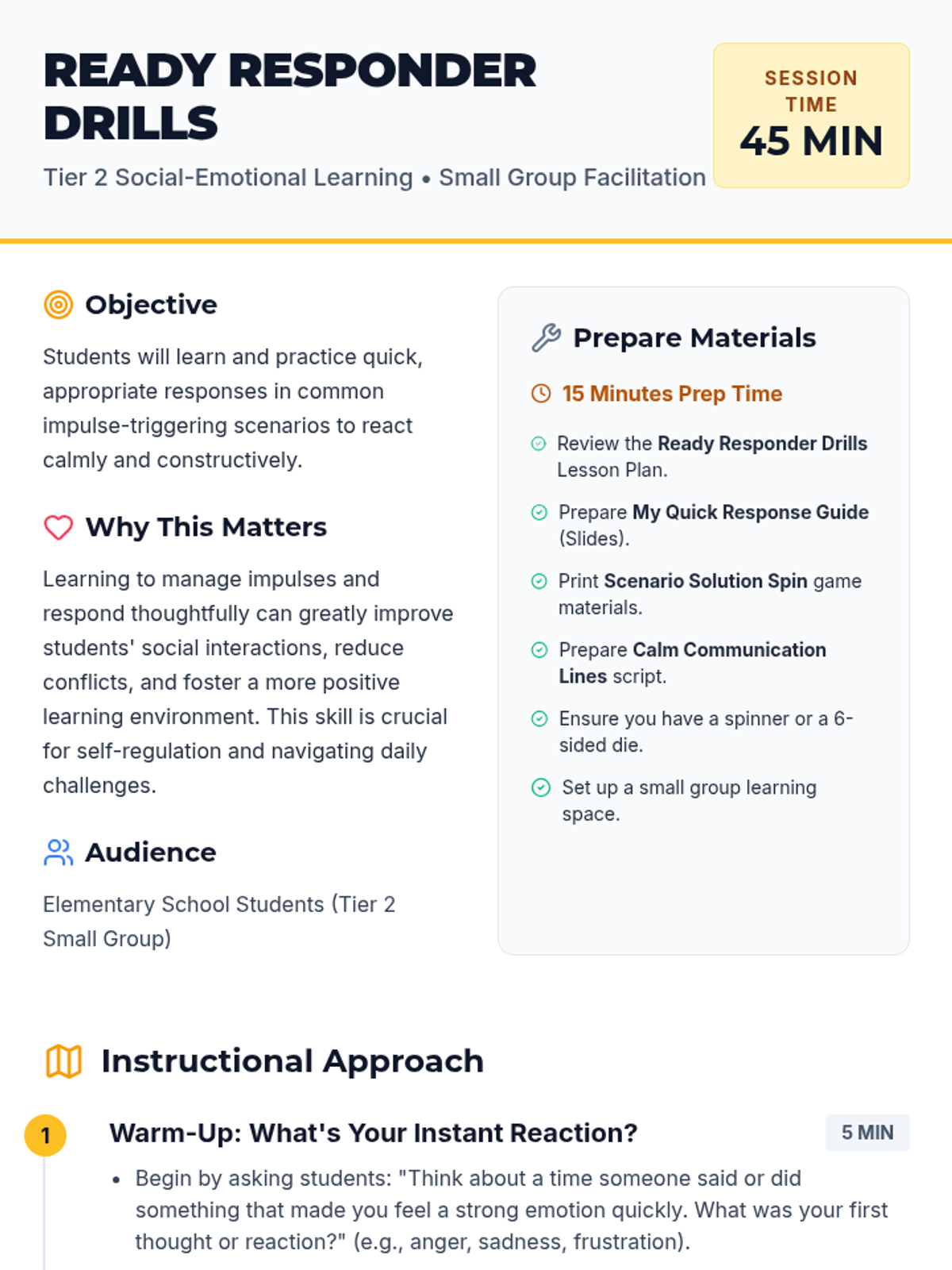A small-group MTSS Tier 2 lesson focused on helping students develop rehearsed strategies to react calmly to impulse-triggering scenarios through the 'Pause, Think, Choose' method.