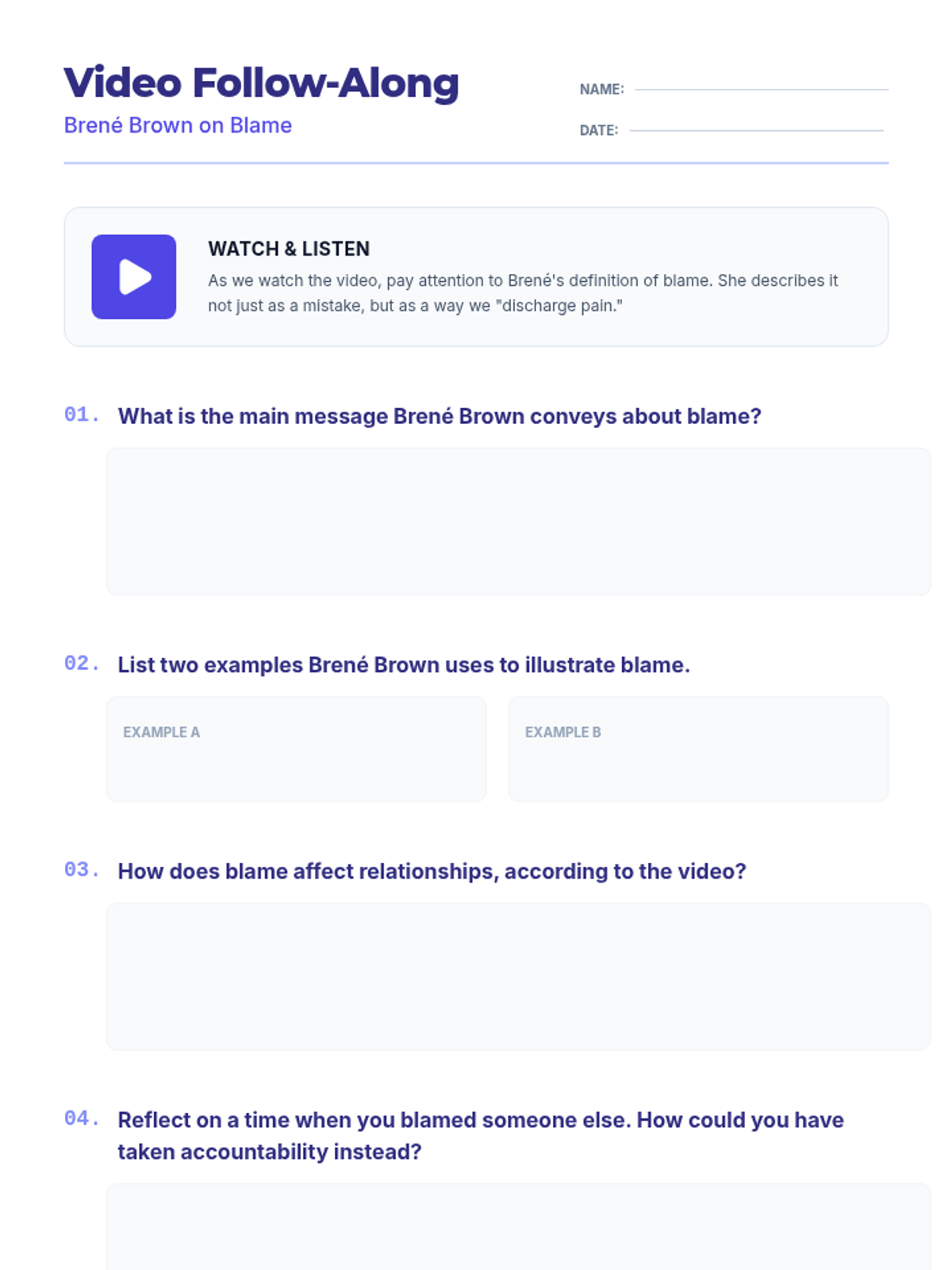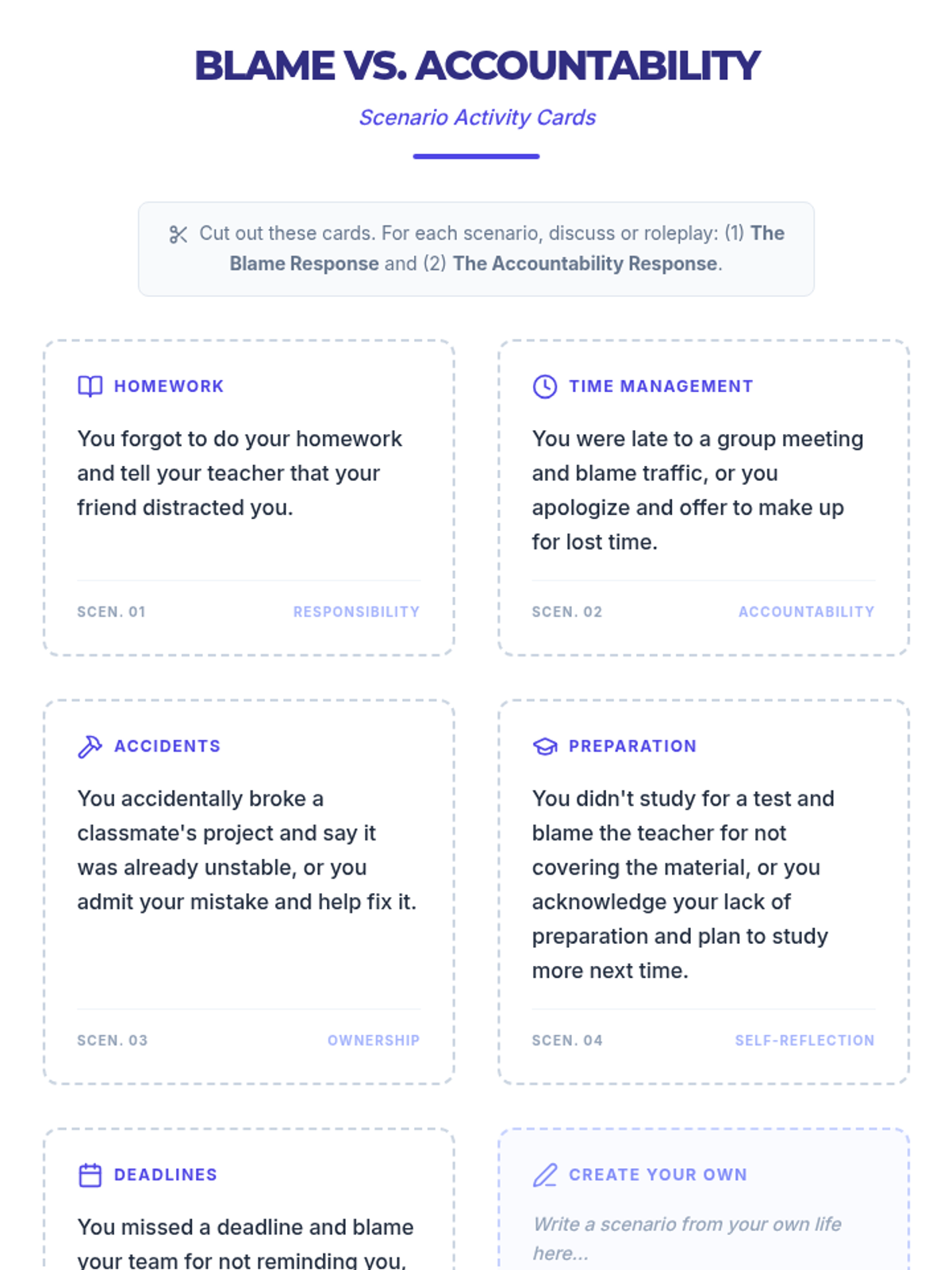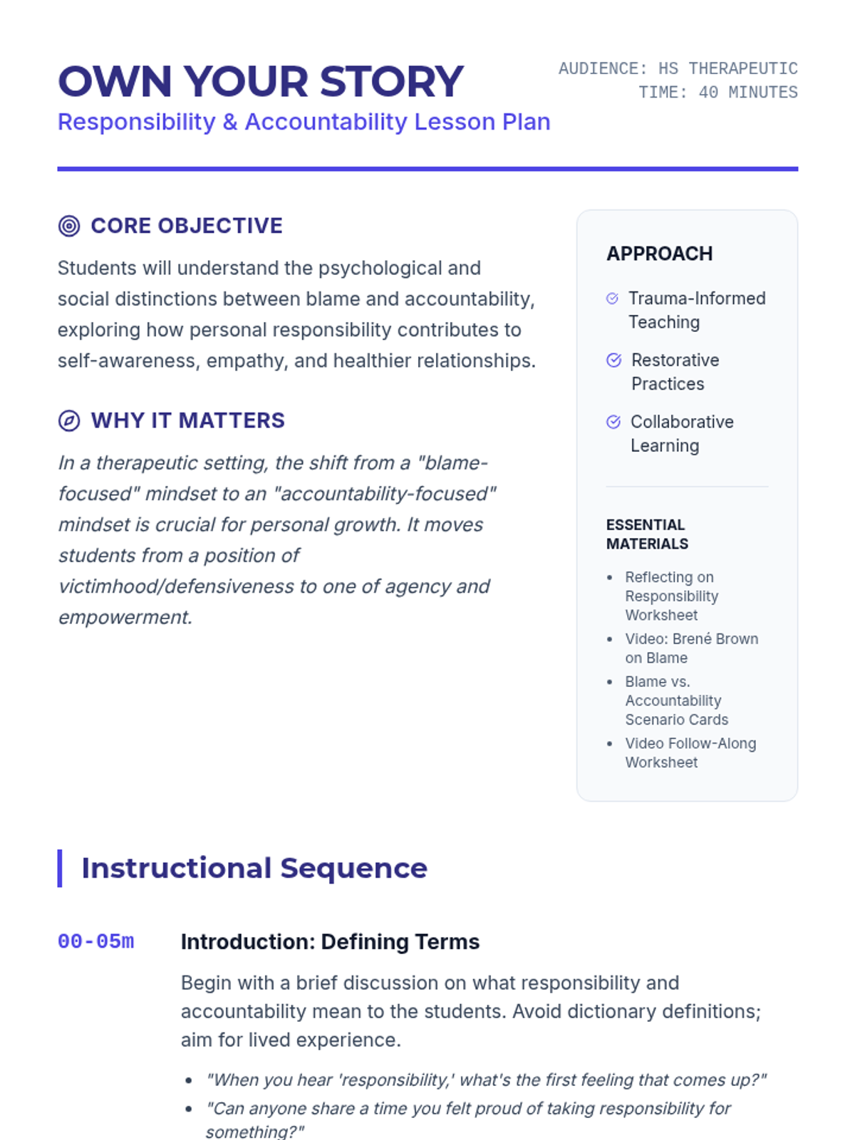 A 40-minute lesson designed for high school therapeutic classrooms to help students differentiate between blame and accountability, fostering self-awareness and healthier interpersonal dynamics.