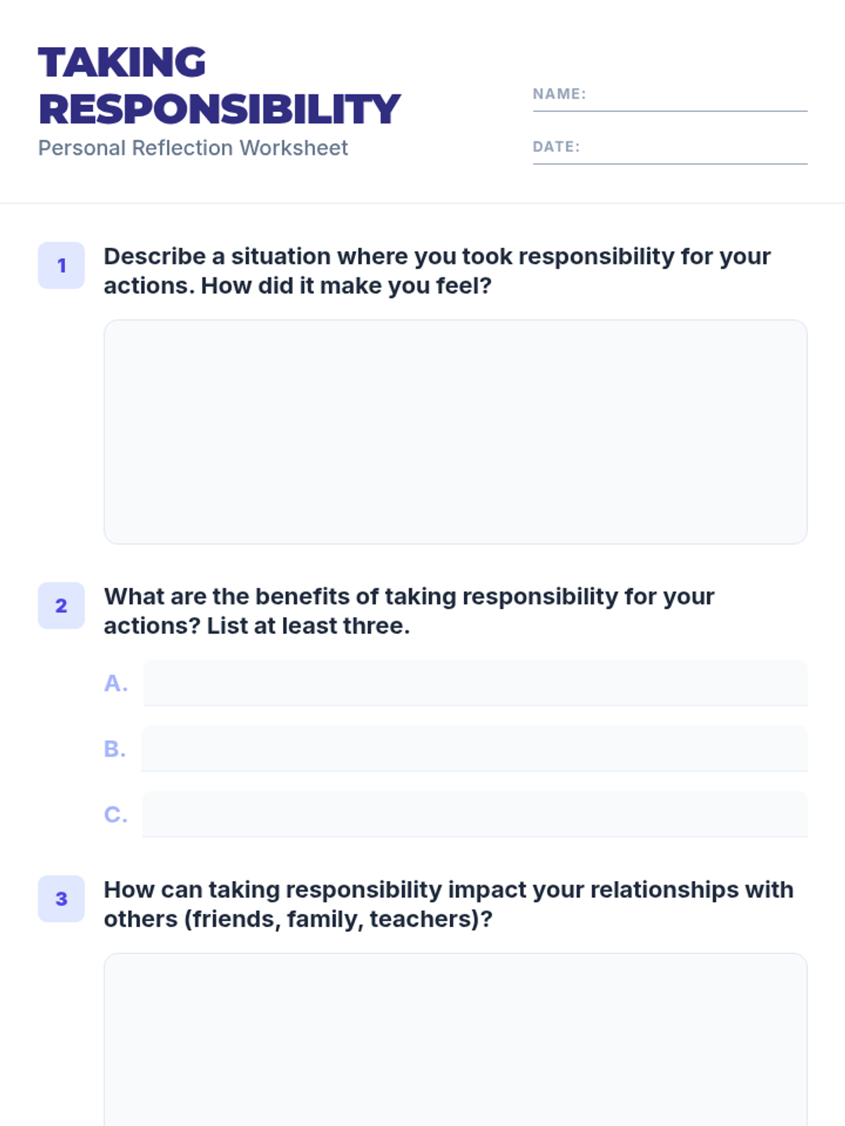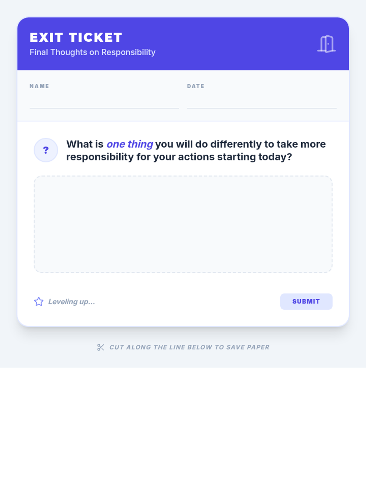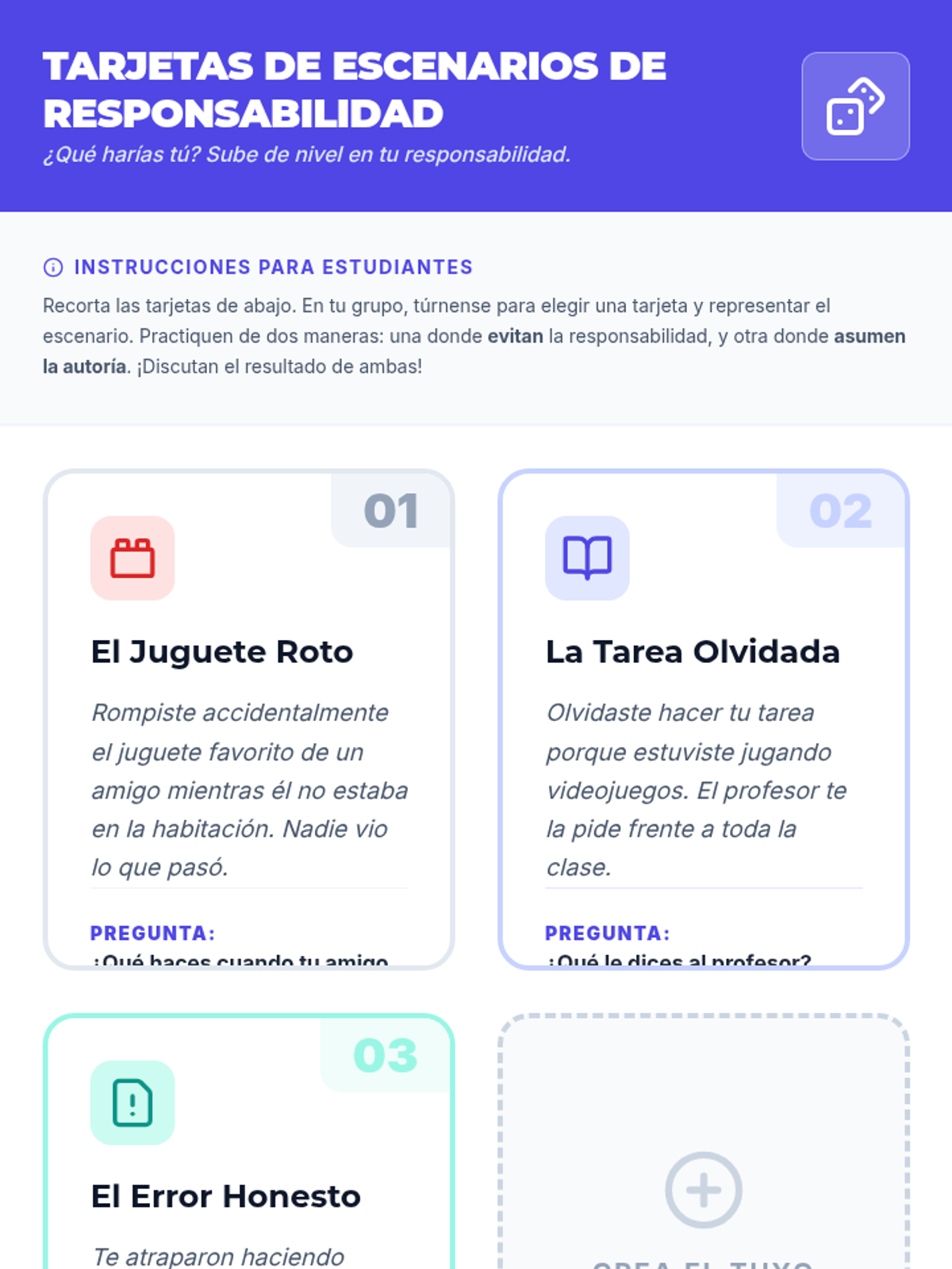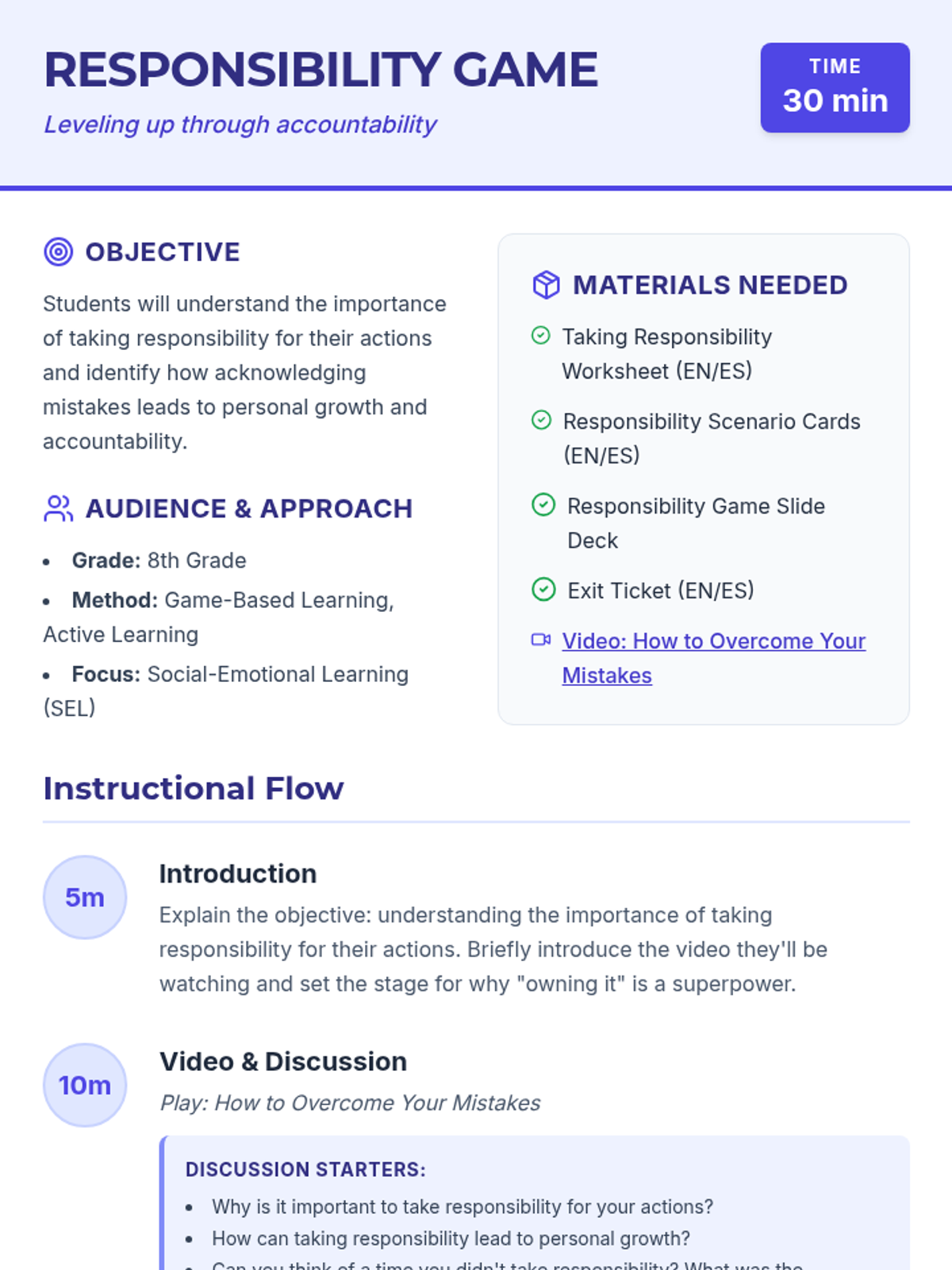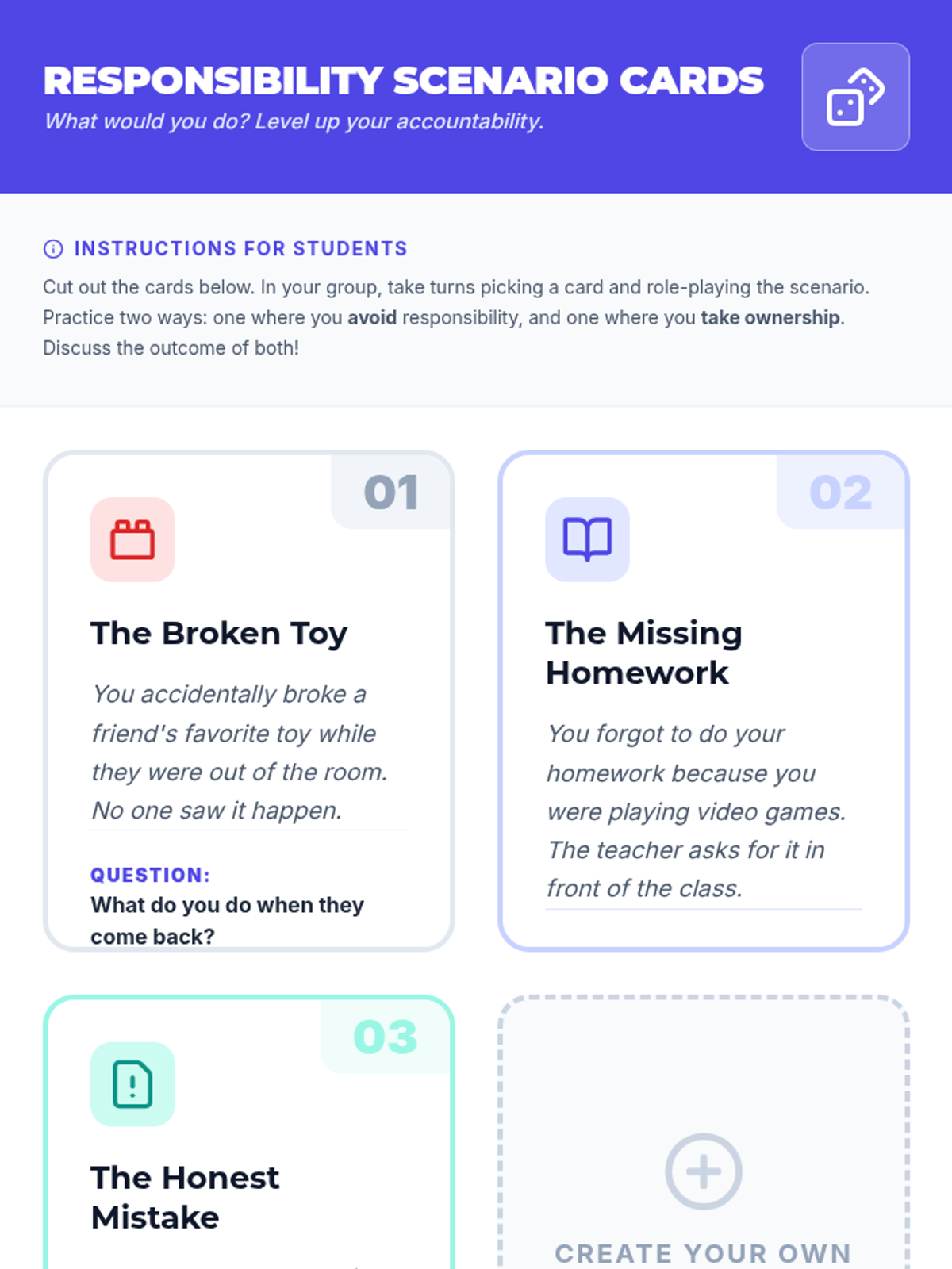 This lesson introduces 8th-grade students to the concept of taking responsibility for their actions. Through engaging scenario role-plays, reflective writing, and discussion, students will understand how acknowledging mistakes fosters personal growth and stronger relationships.