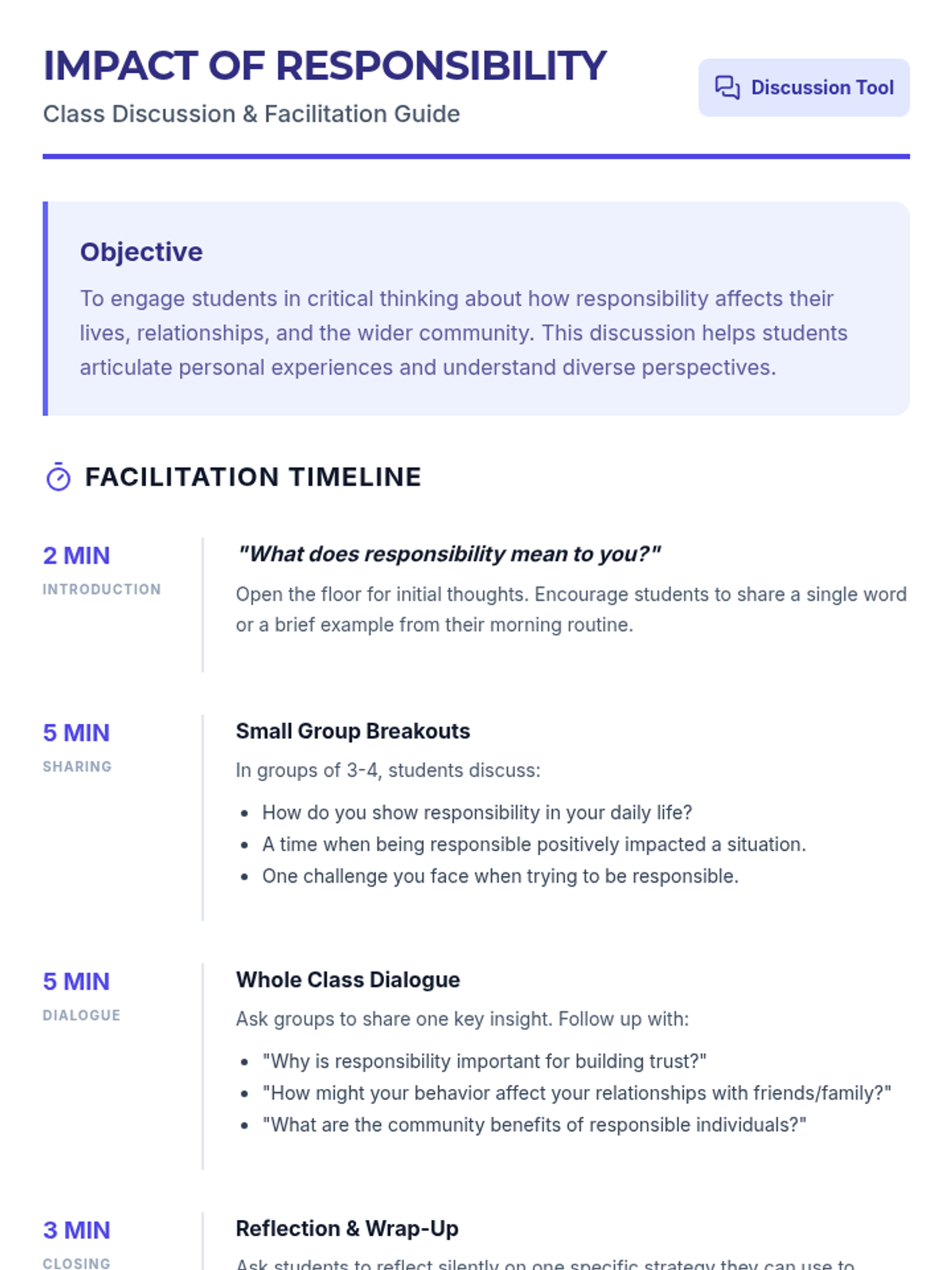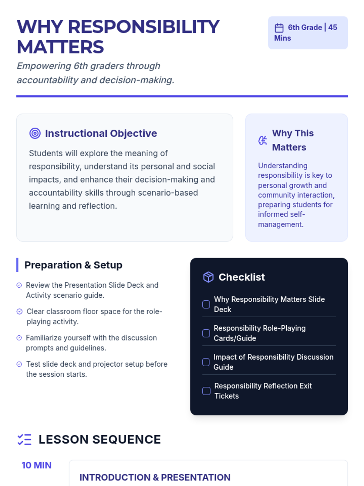 Students will explore the concept of responsibility, its personal and social impacts, and how it shapes their decision-making and accountability skills through interactive activities and reflection.