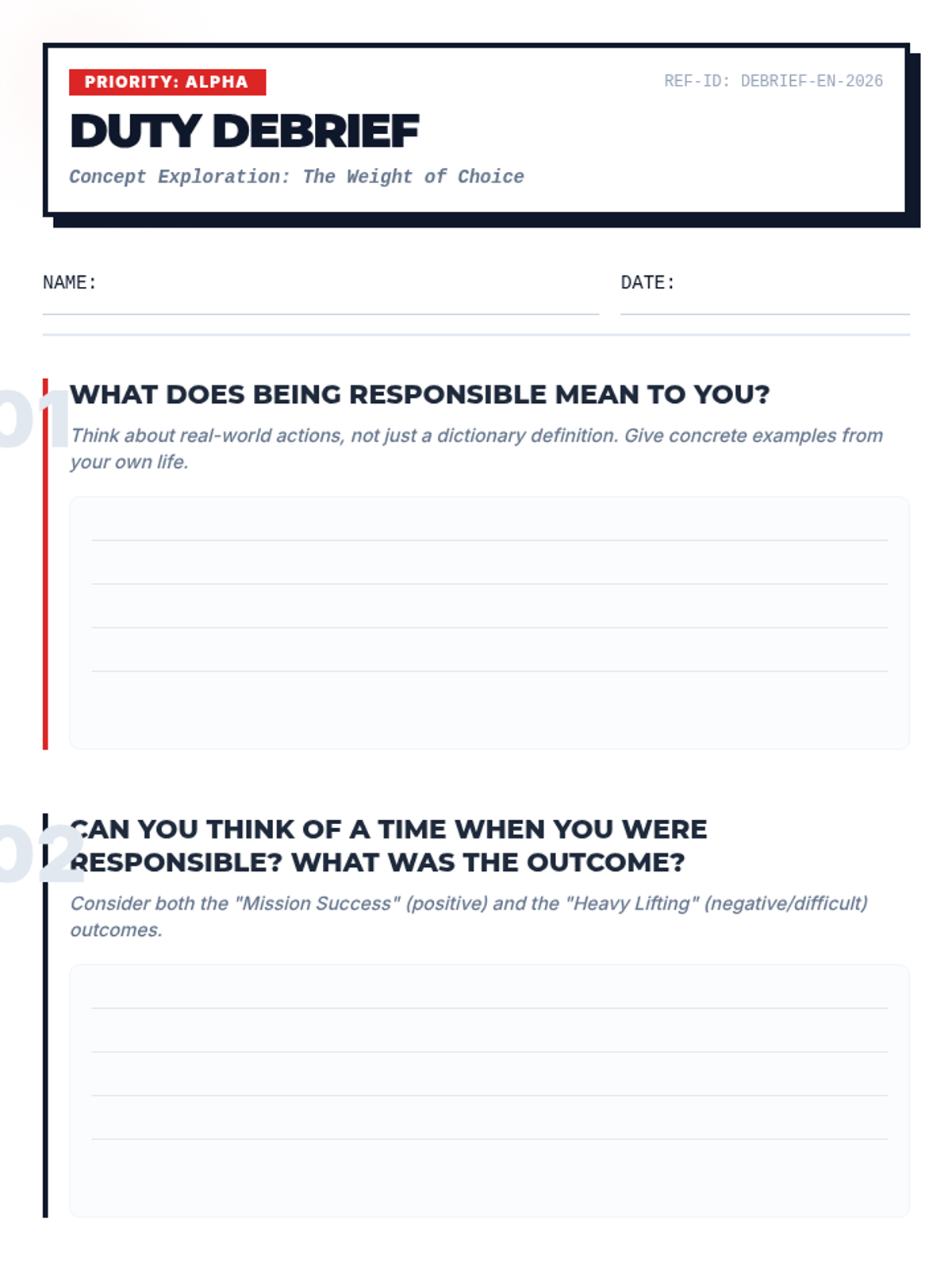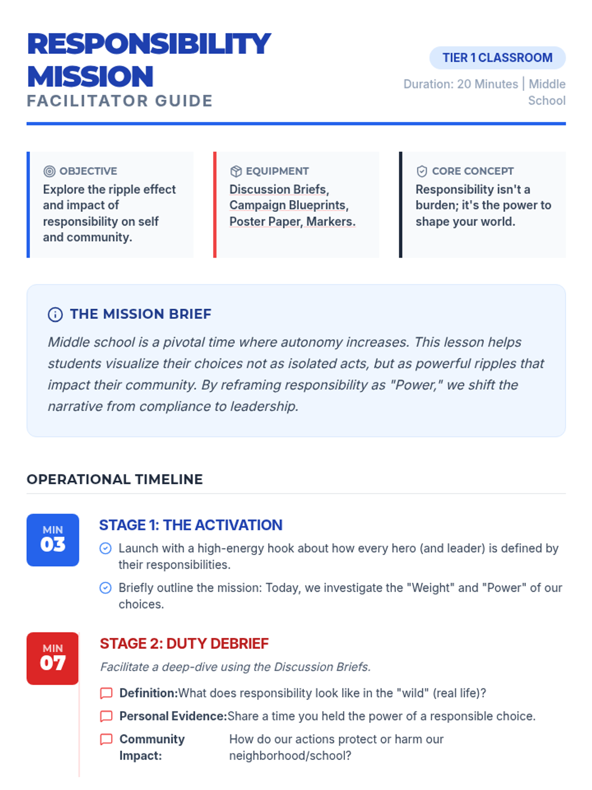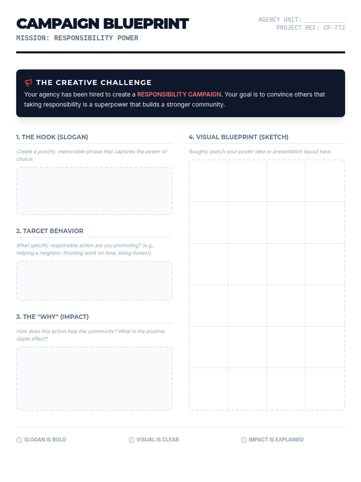 A high-energy lesson for middle schoolers to explore the ripple effects of their choices and the weight of responsibility through interactive discussion and a creative campaign project.