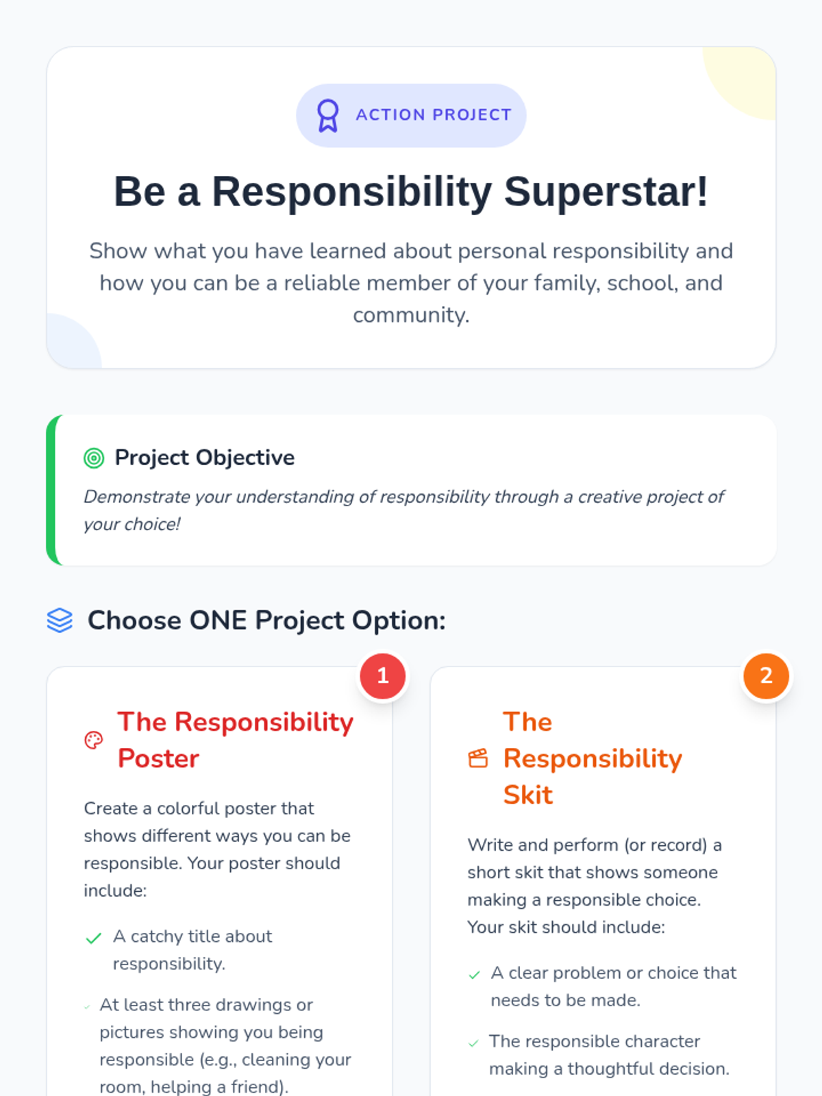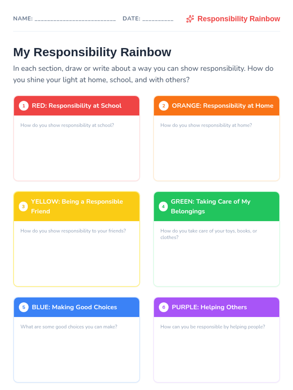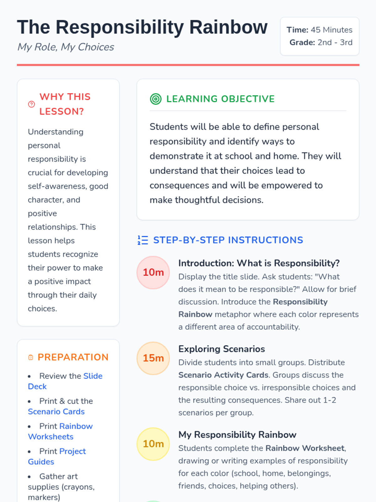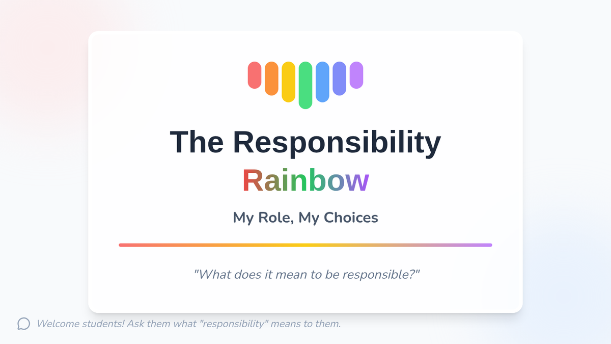 This lesson teaches 2nd and 3rd graders about personal responsibility and accountability through the metaphor of a 'Responsibility Rainbow,' covering school, home, and friendships.