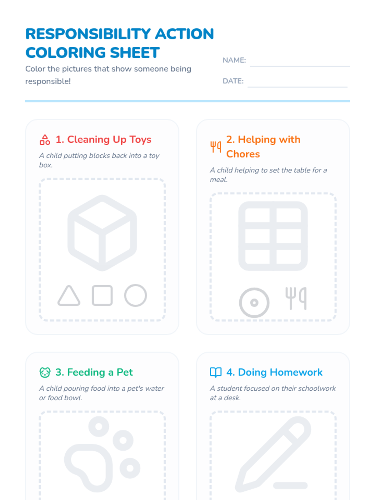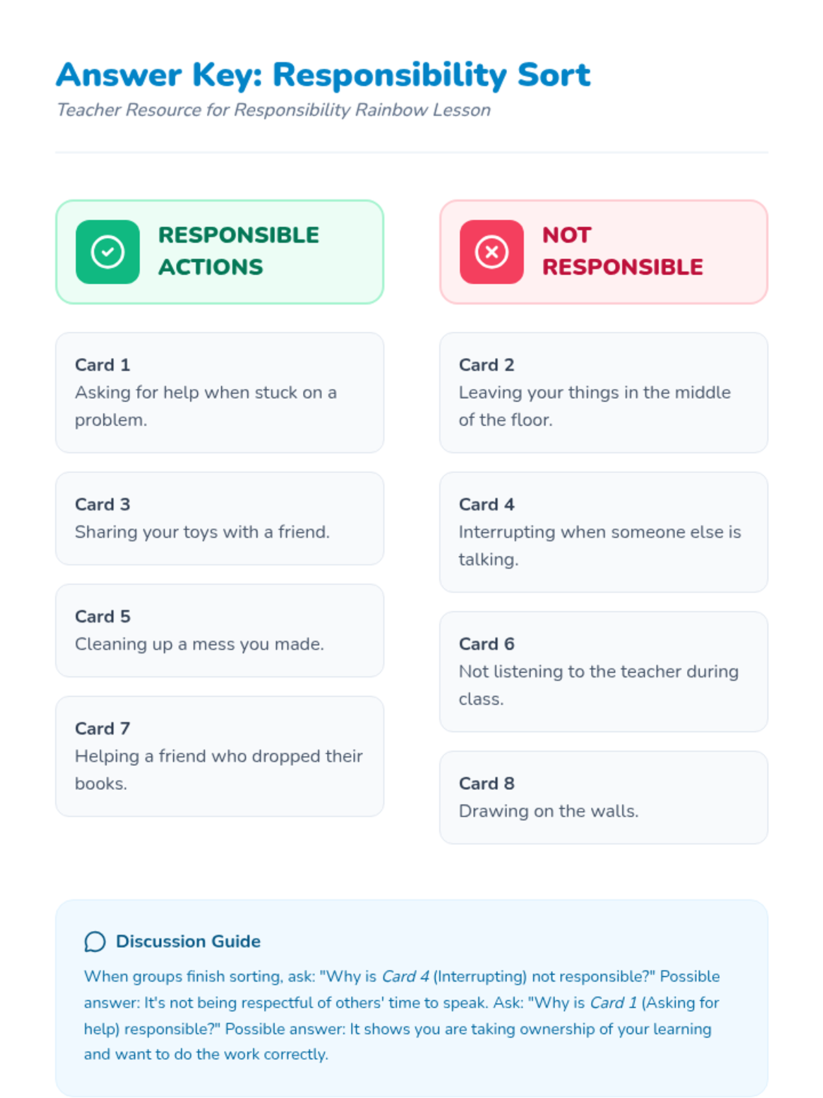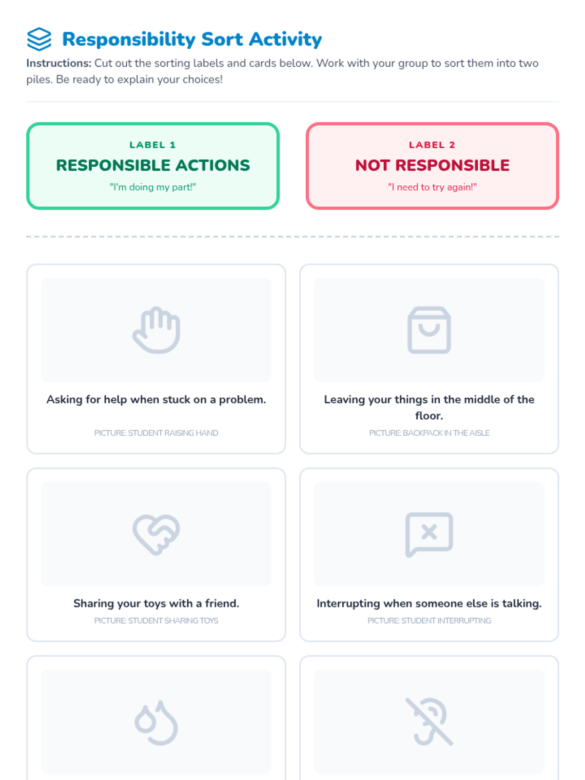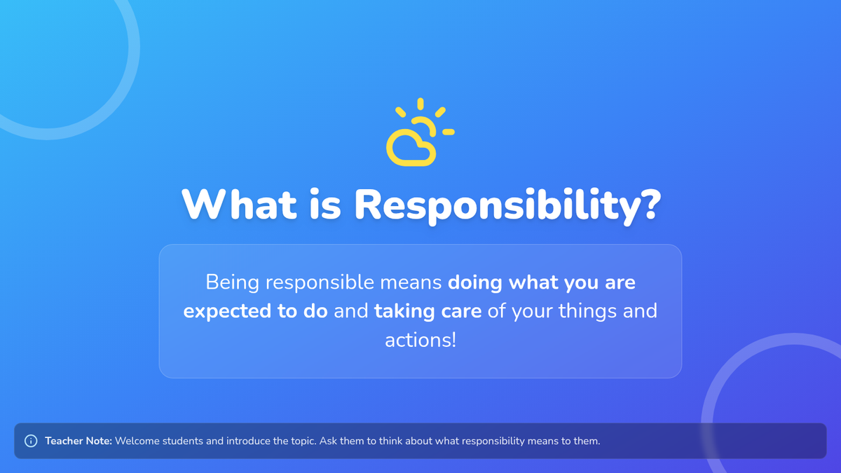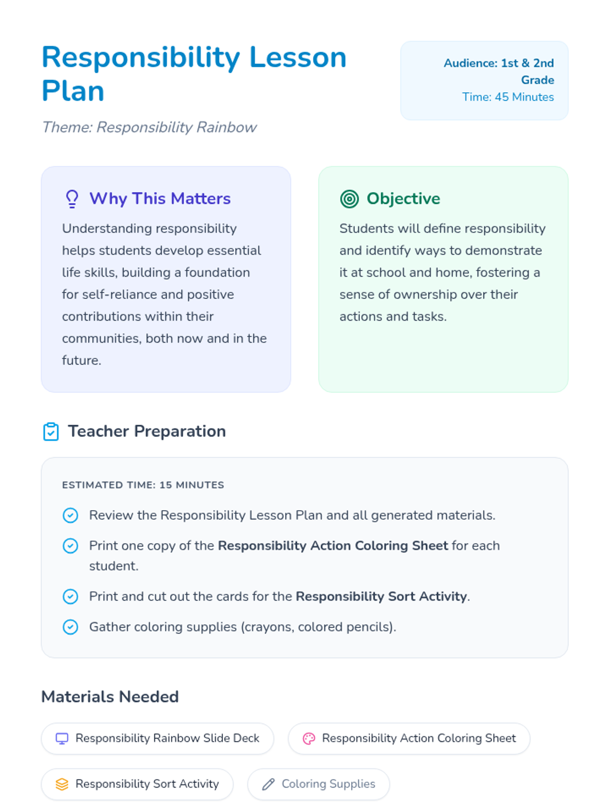 This lesson introduces 1st and 2nd graders to responsibility through a 'Responsibility Rainbow' theme. It includes a slide deck, a coloring worksheet, and a sorting activity to help students identify responsible behaviors at home and school.