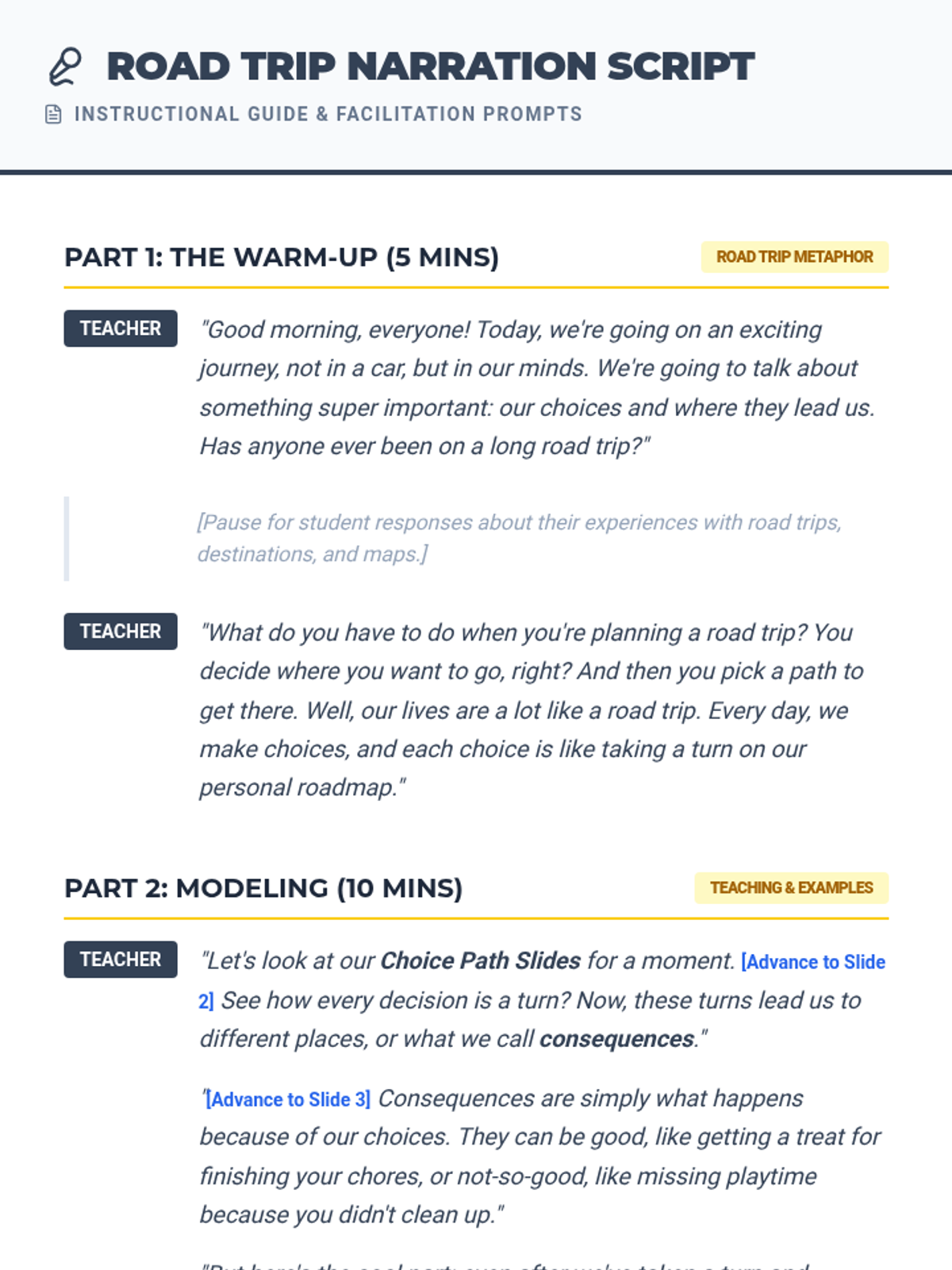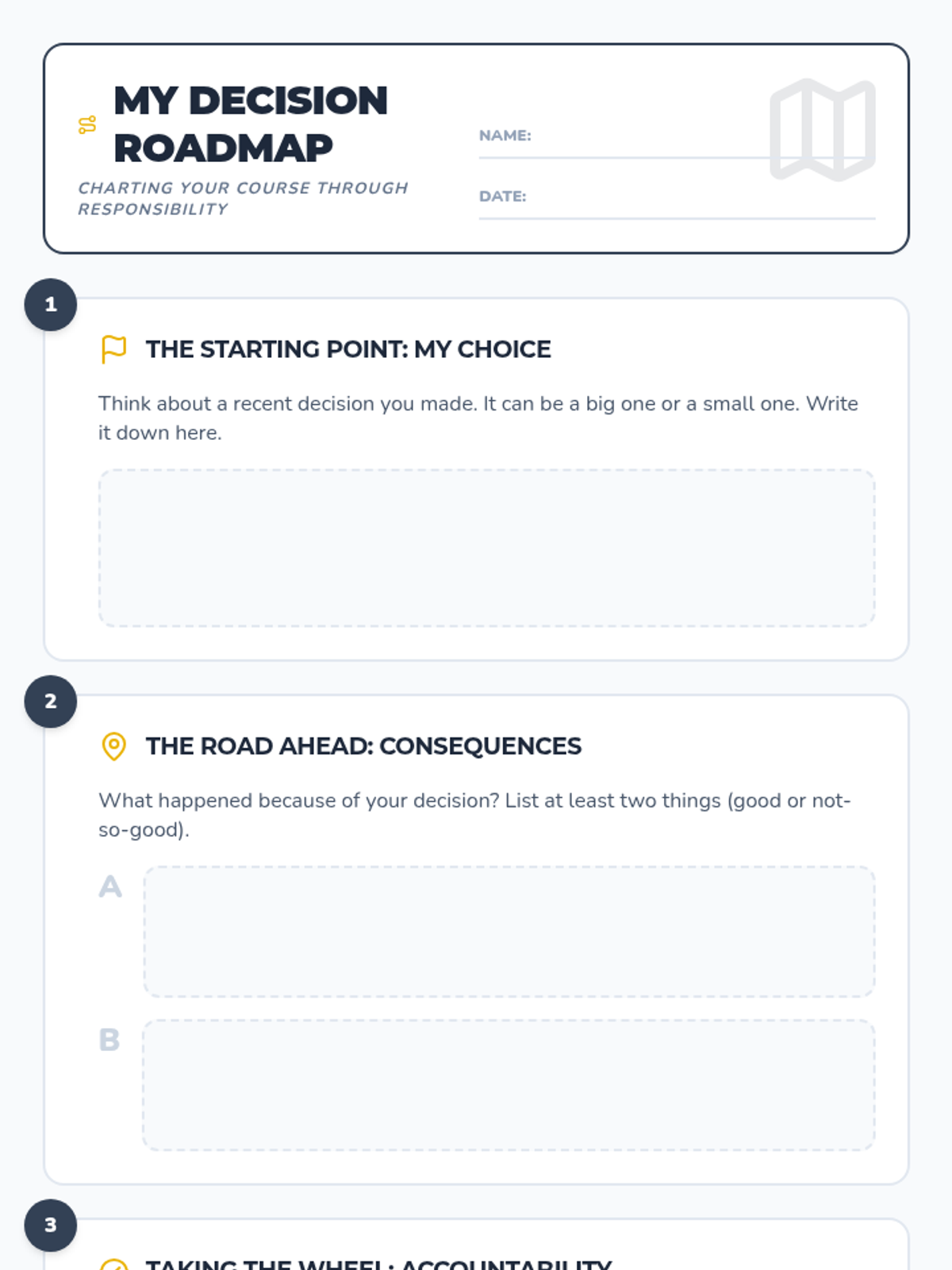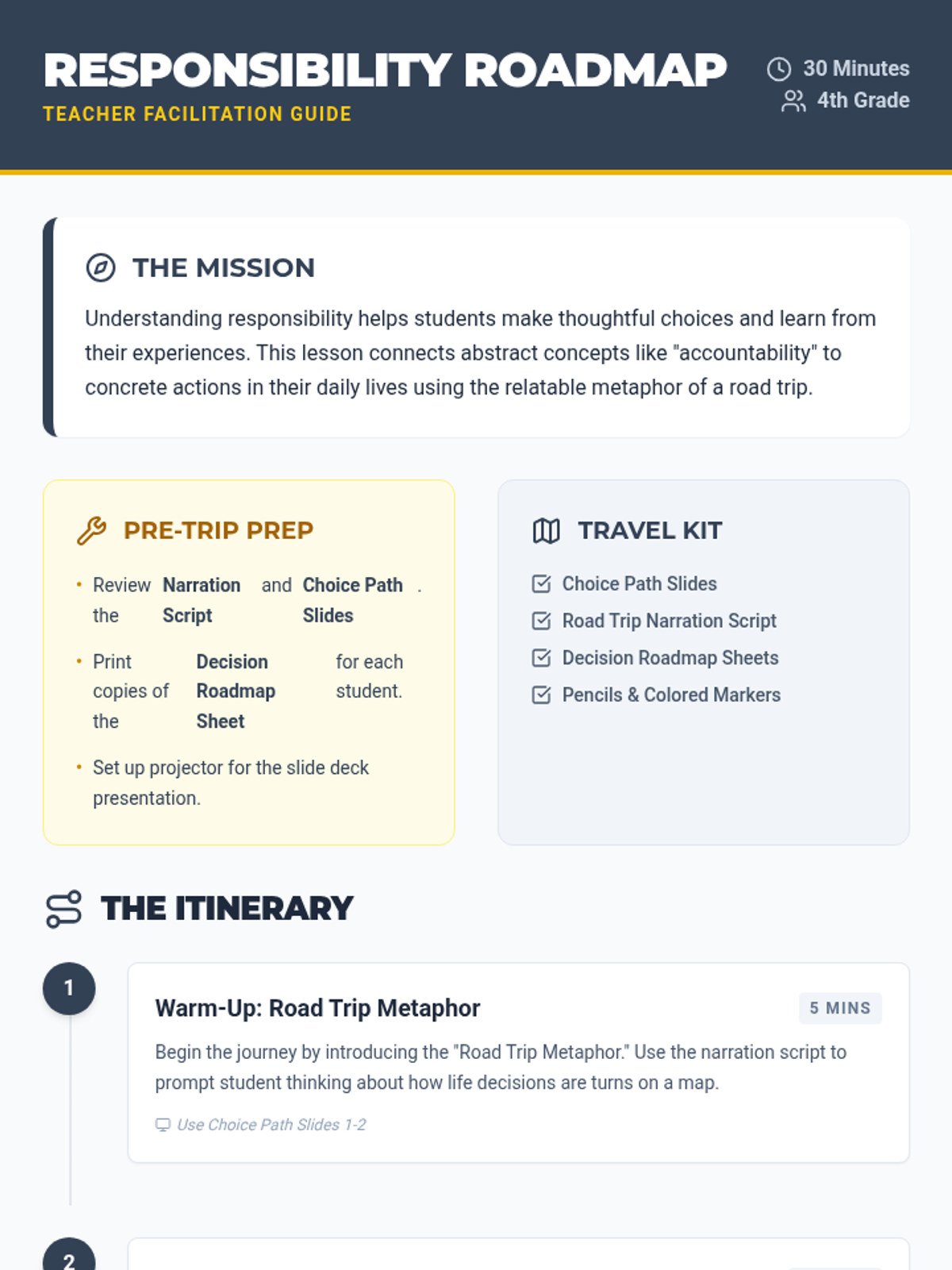 This lesson guides 4th-grade students through understanding responsibility by mapping a recent decision's path, identifying consequences, and outlining accountability steps. It helps students connect their choices to real-life outcomes over a single 30-minute session.