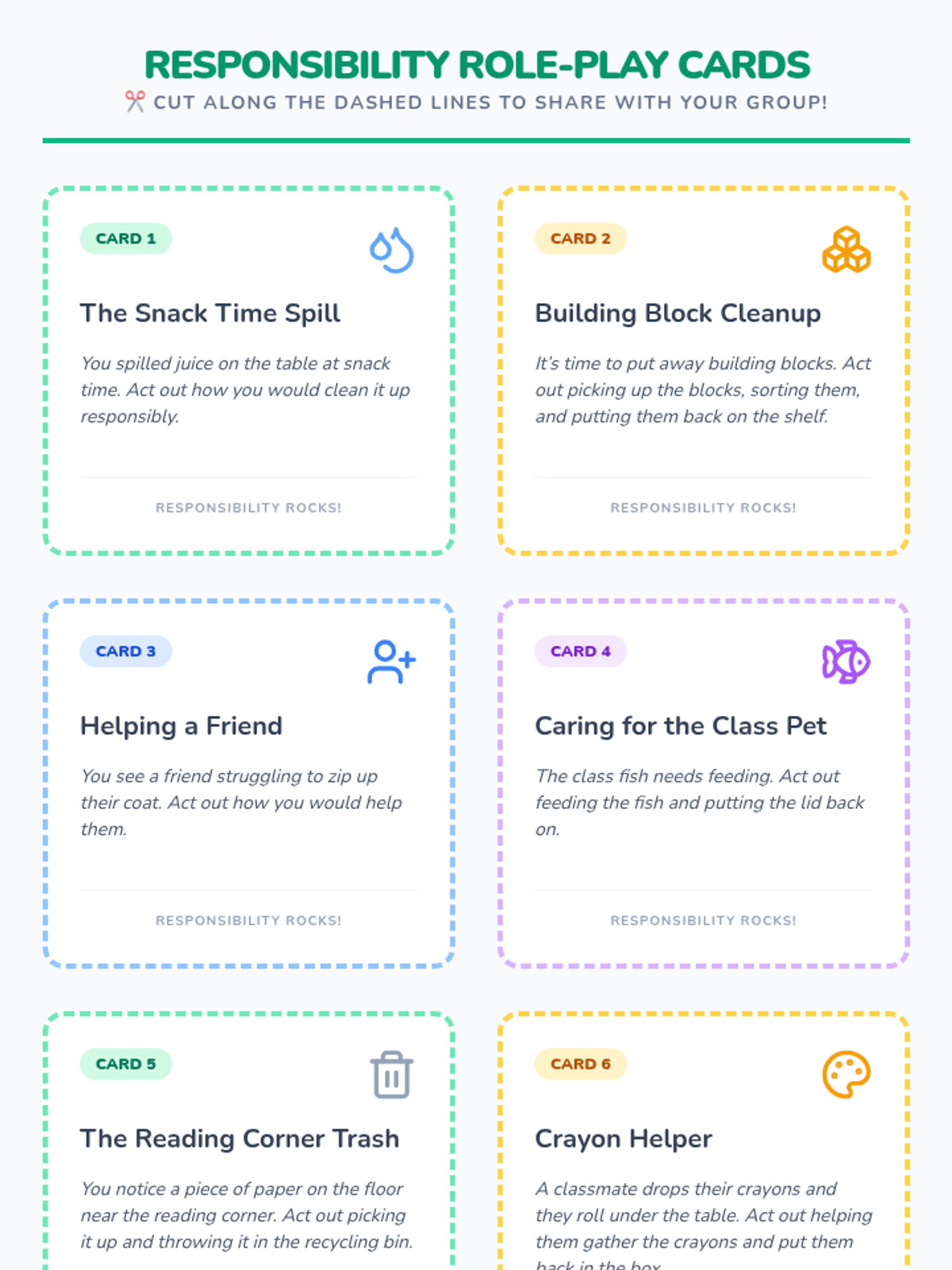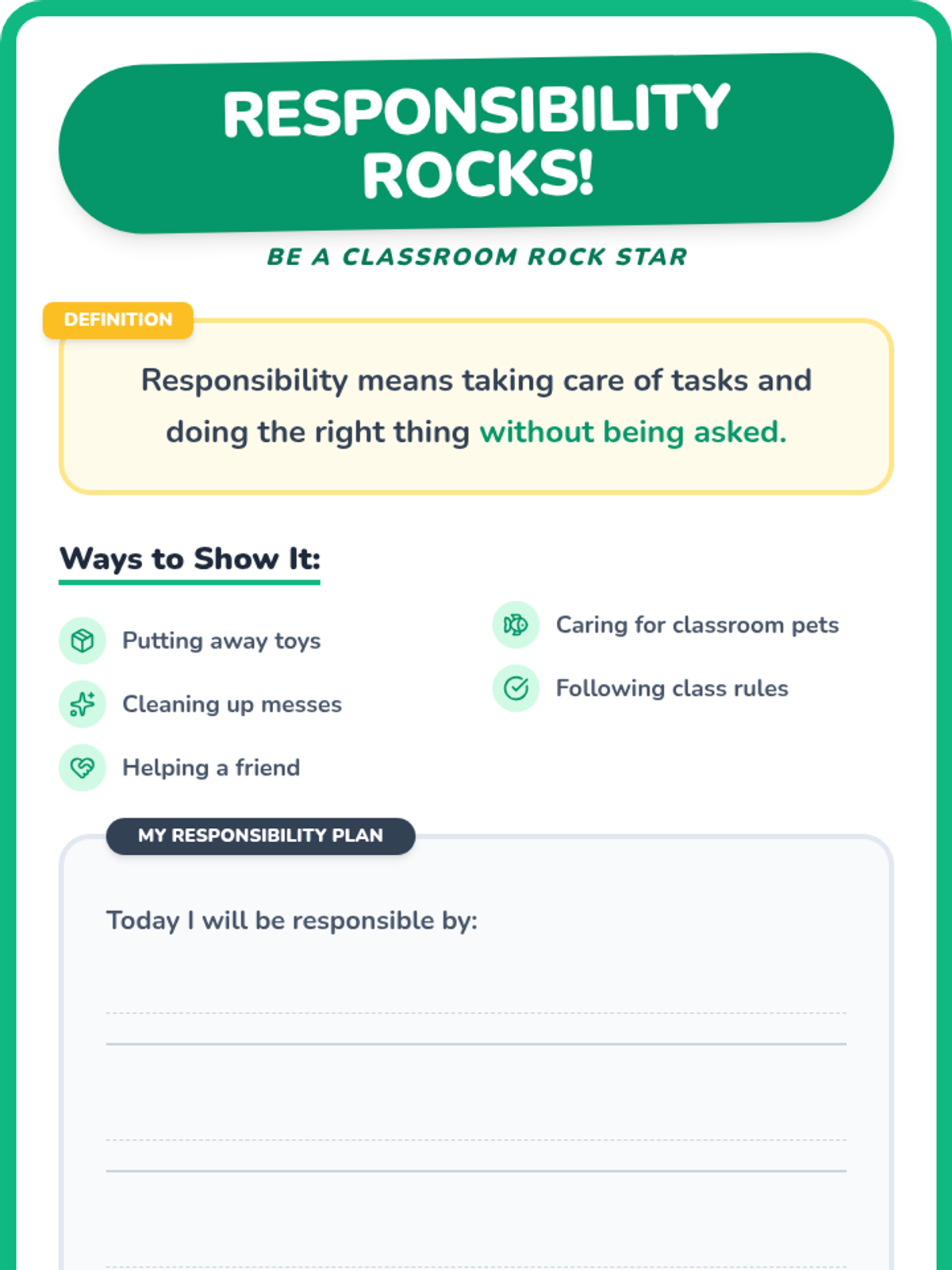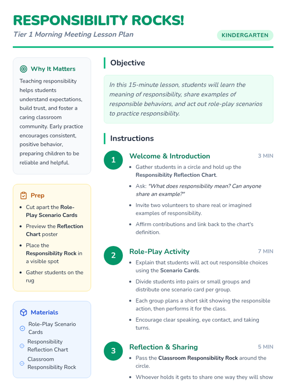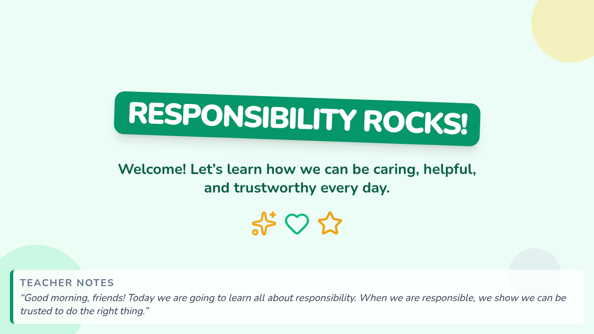 A 15-minute kindergarten morning meeting lesson exploring responsibility through discussion, role-play, and reflective sharing. Students learn how to be caring, trustworthy members of their classroom community.