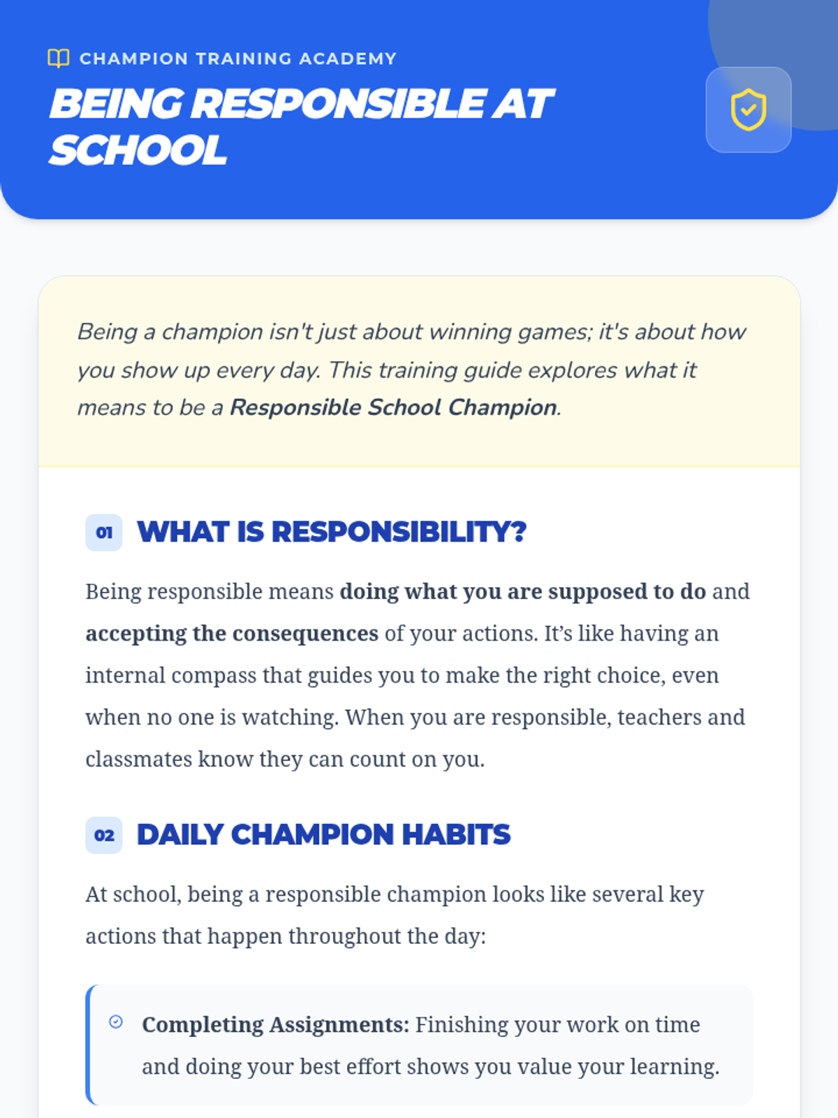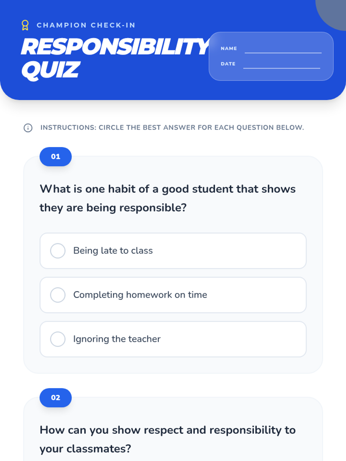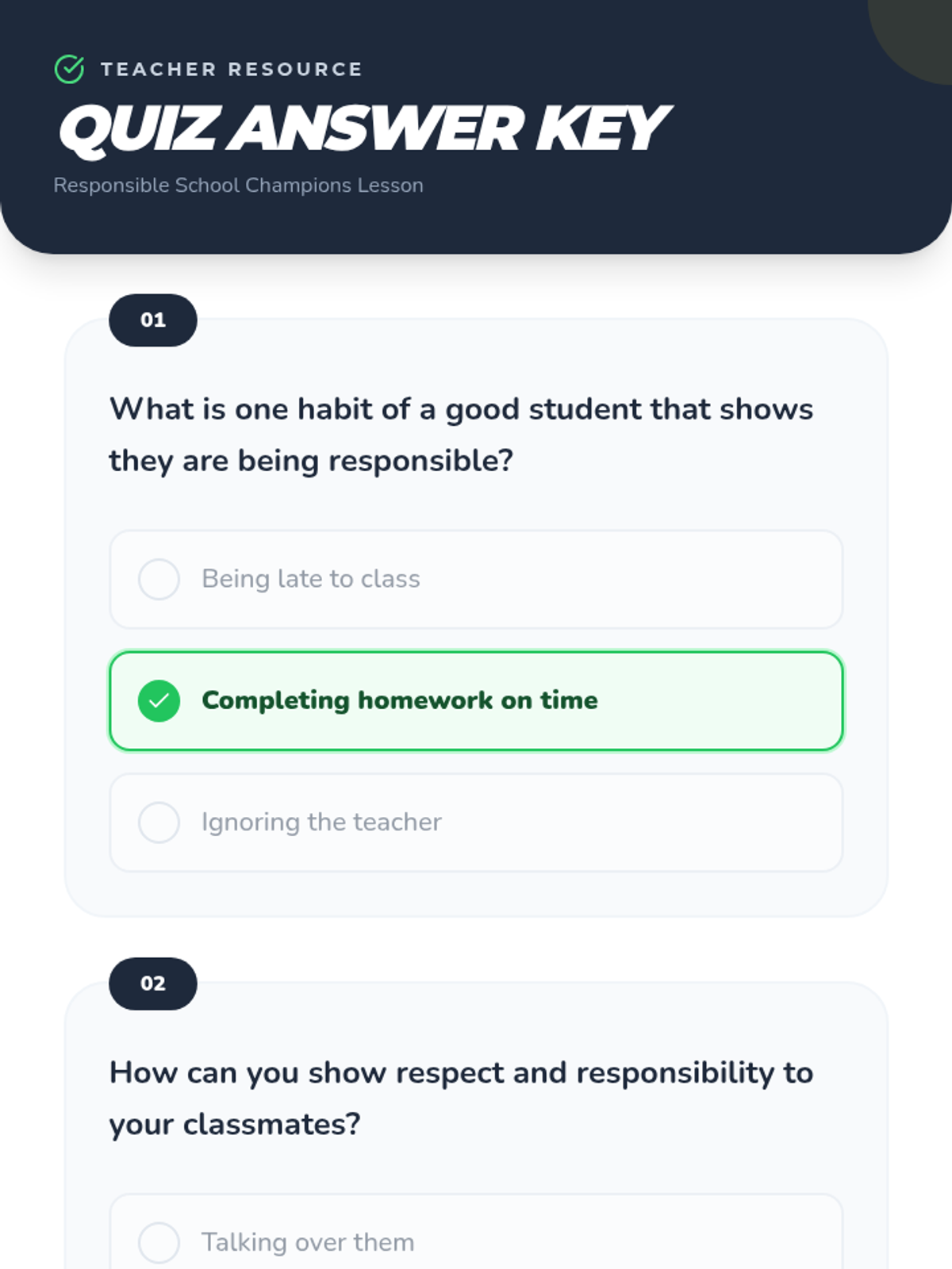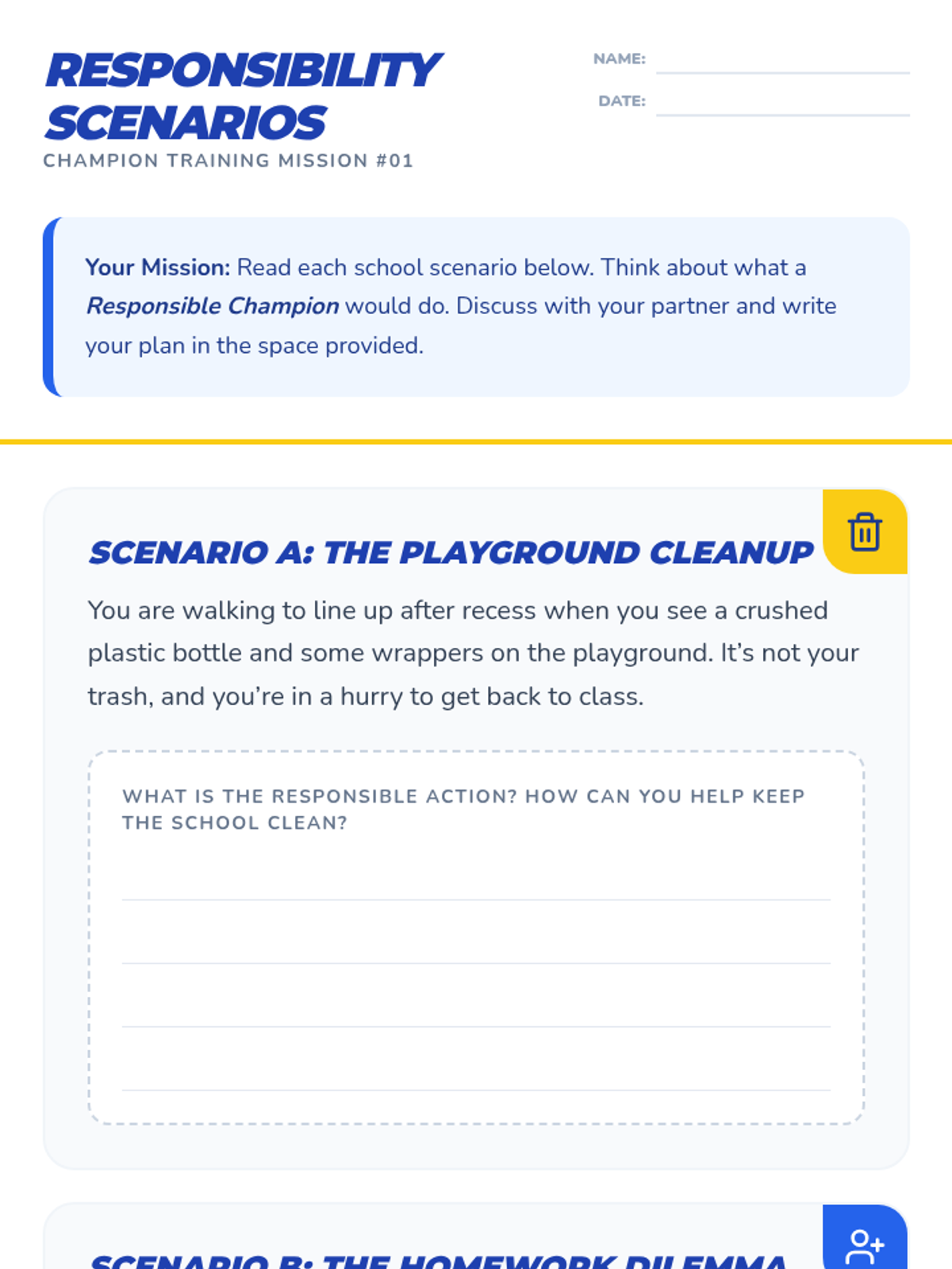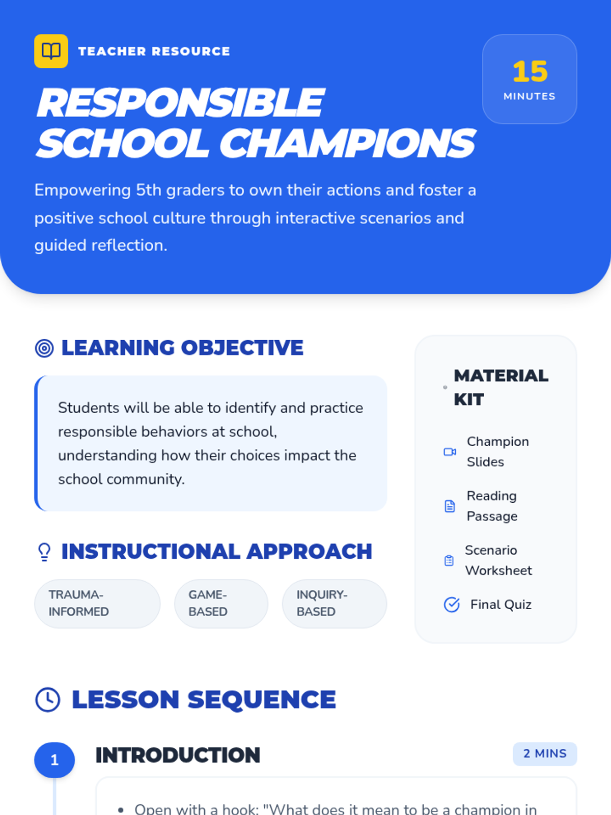 A lesson for 5th graders on the importance of responsibility at school, featuring engaging scenarios, a reading passage, and a video to foster a positive school environment.