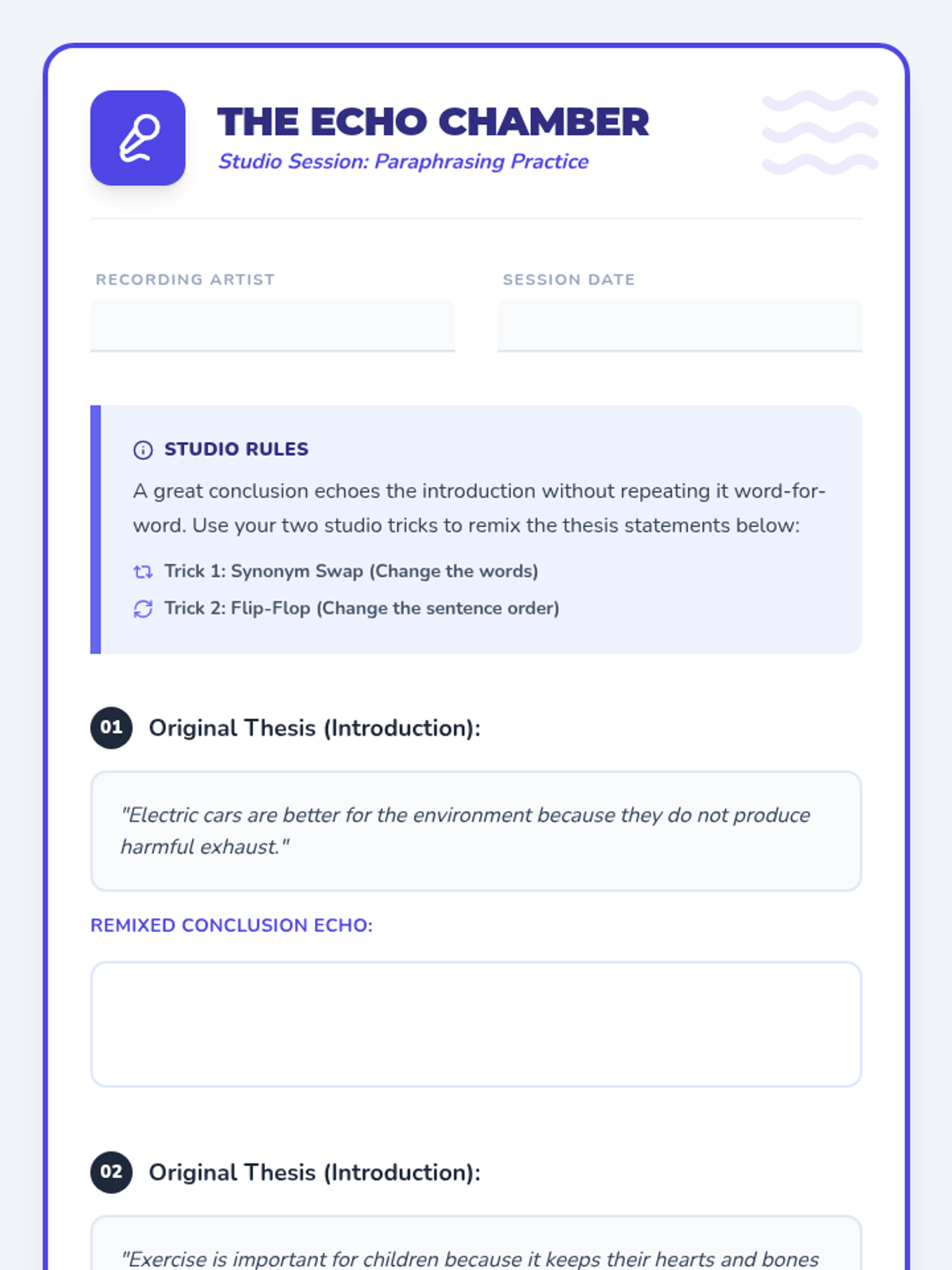 Students practice the skill of paraphrasing to restate their main ideas using fresh vocabulary and varied sentence structures.