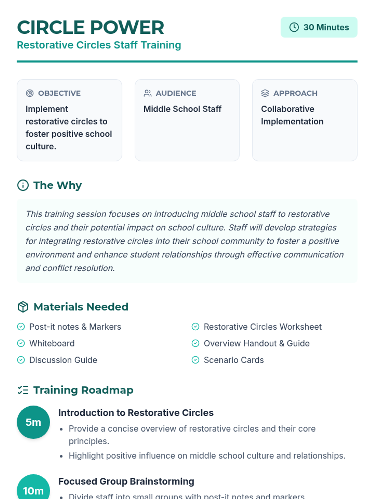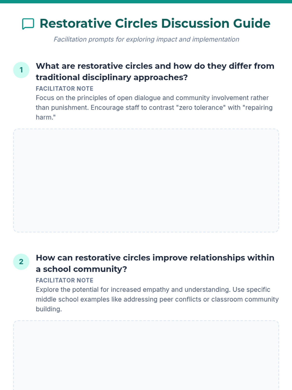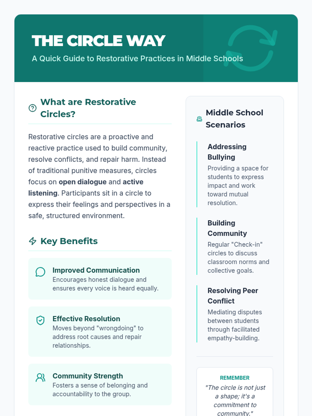 This professional development session introduces middle school staff to restorative circles, focusing on their impact on school culture and practical strategies for integration. Staff will engage in brainstorming and scenario-based planning to foster a positive, communicative school environment.