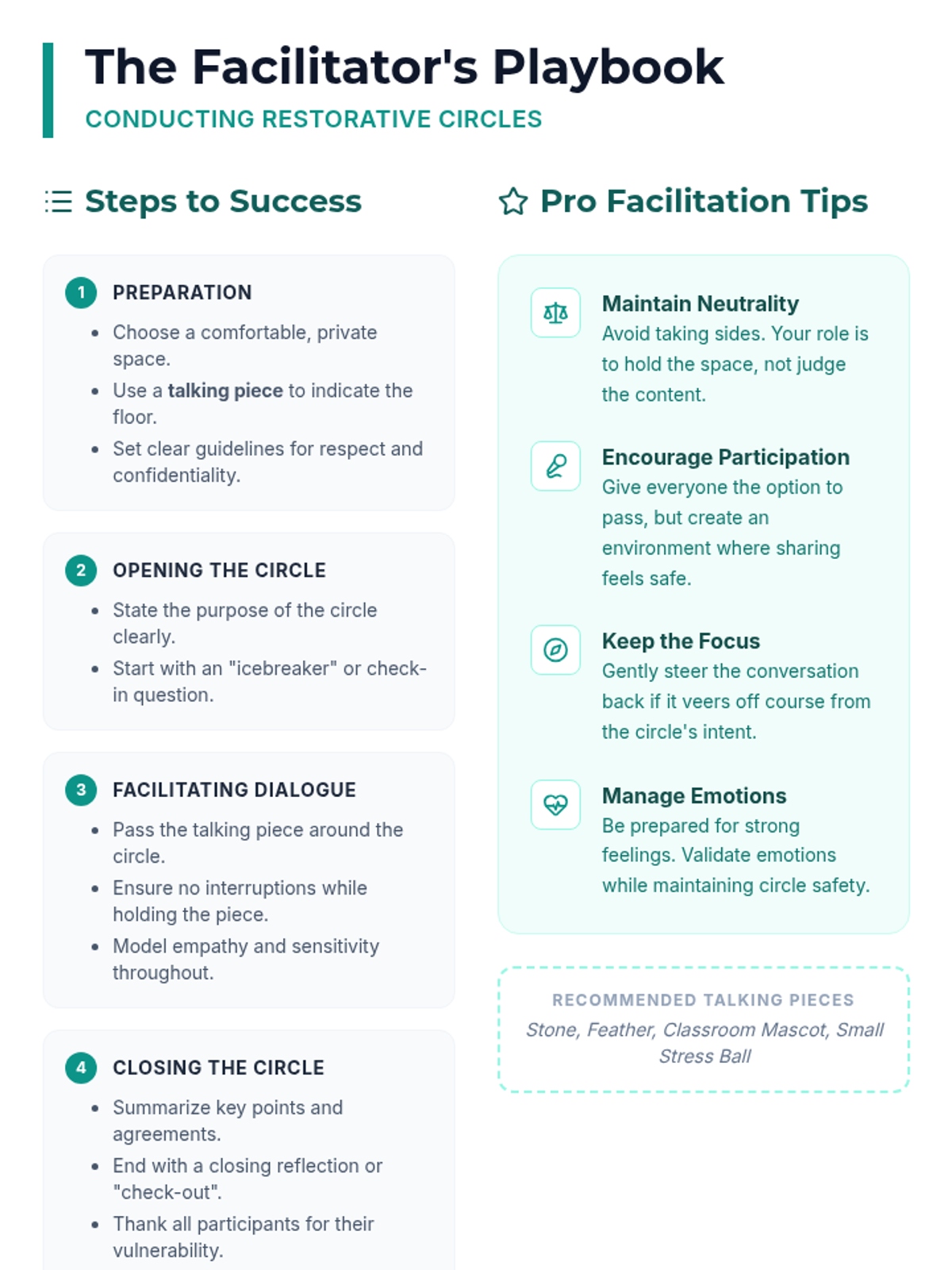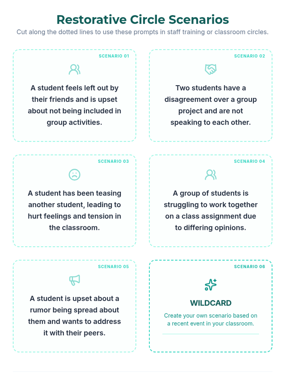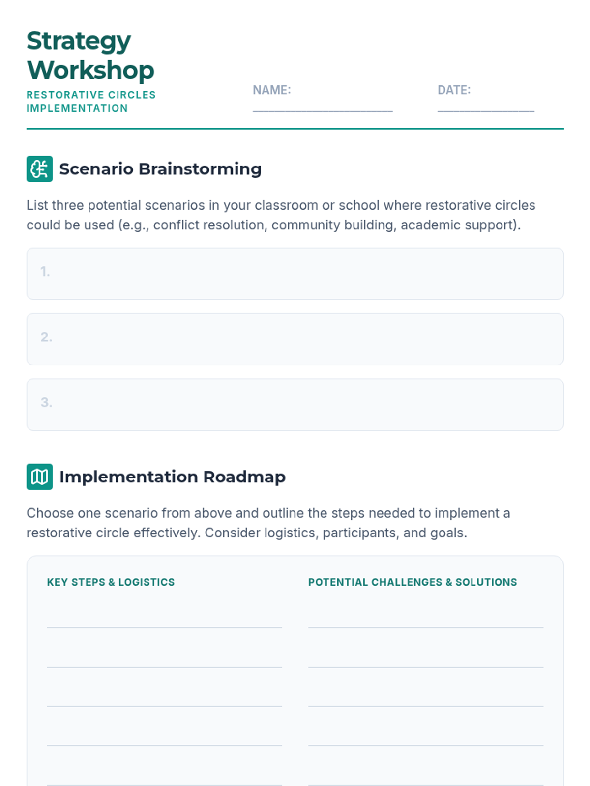 This professional development session introduces middle school staff to restorative circles, focusing on their impact on school culture and practical strategies for integration. Staff will engage in brainstorming and scenario-based planning to foster a positive, communicative school environment.