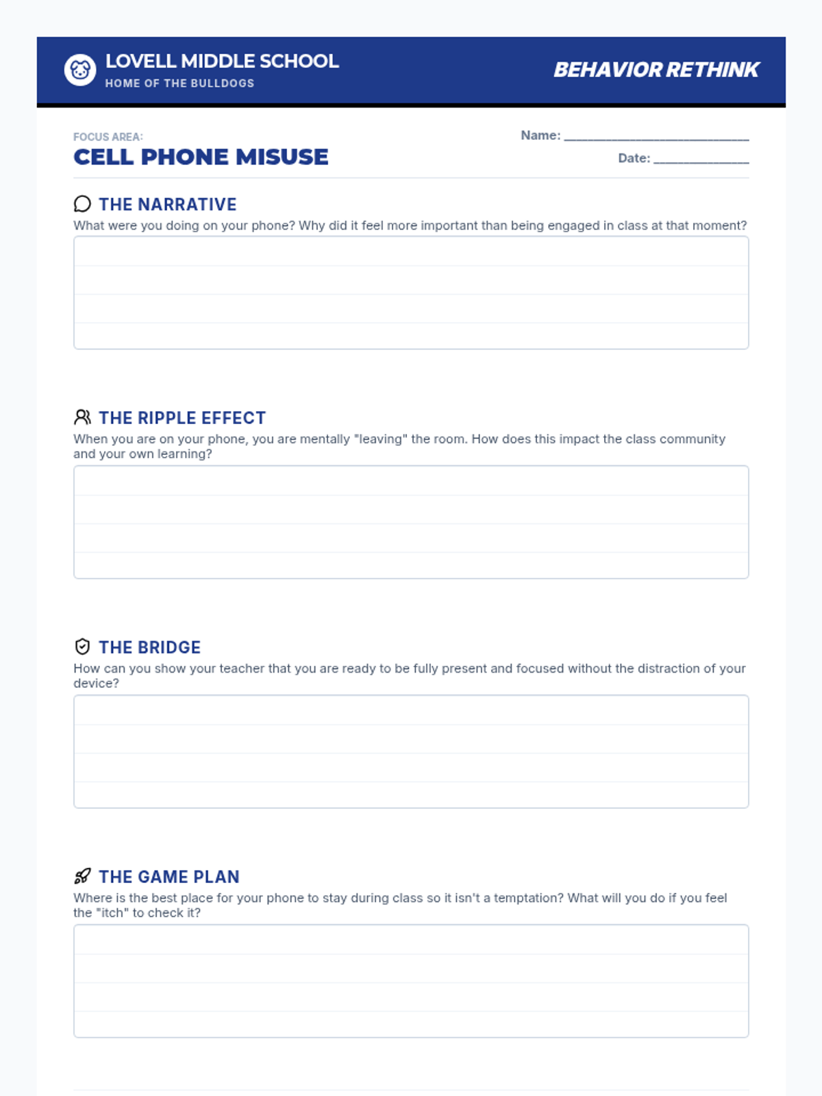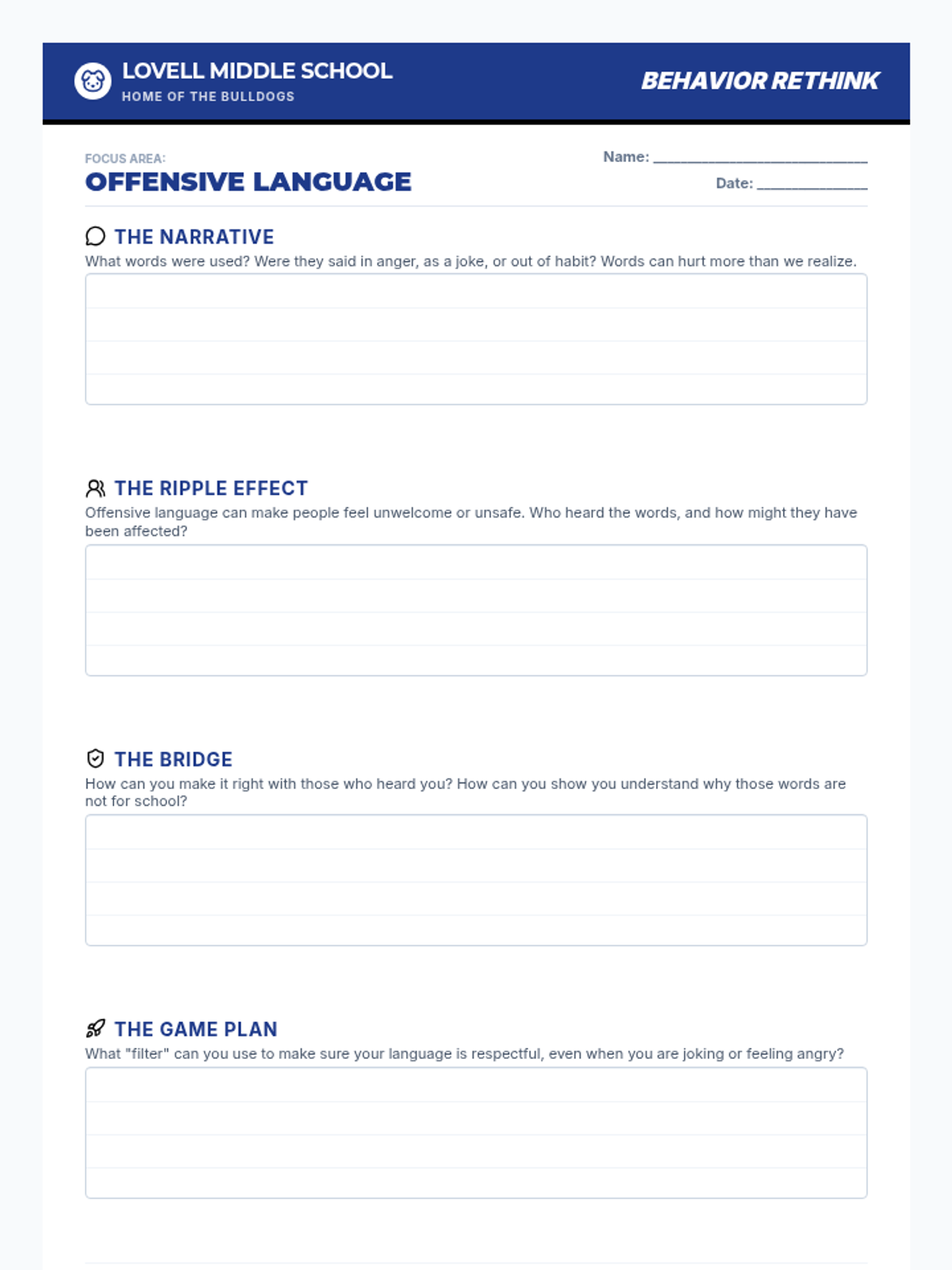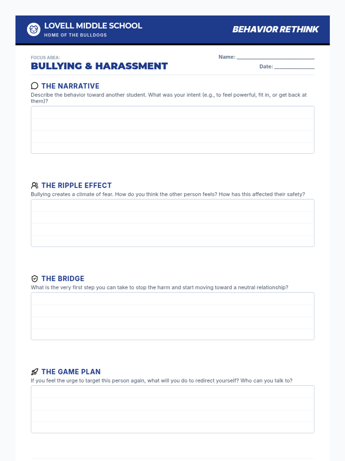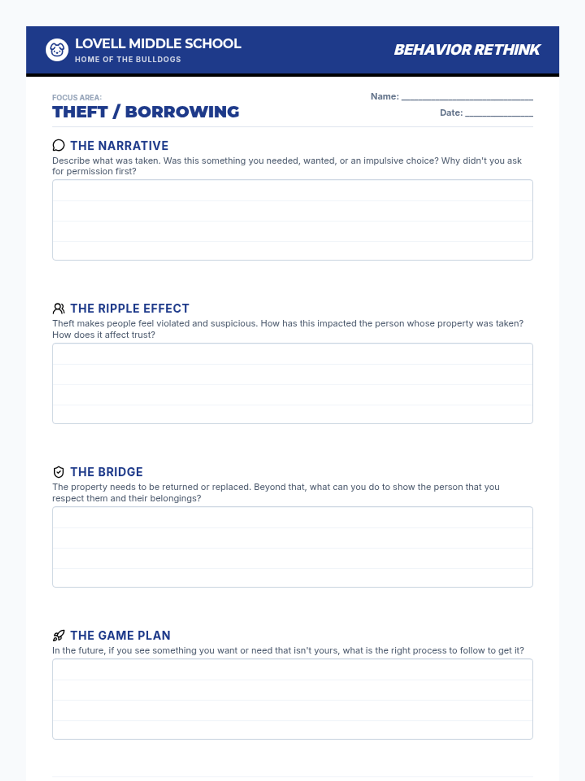 A collection of restorative writing prompts and reflection tools designed to help middle school students process behavioral incidents, understand impact, and plan for repair.