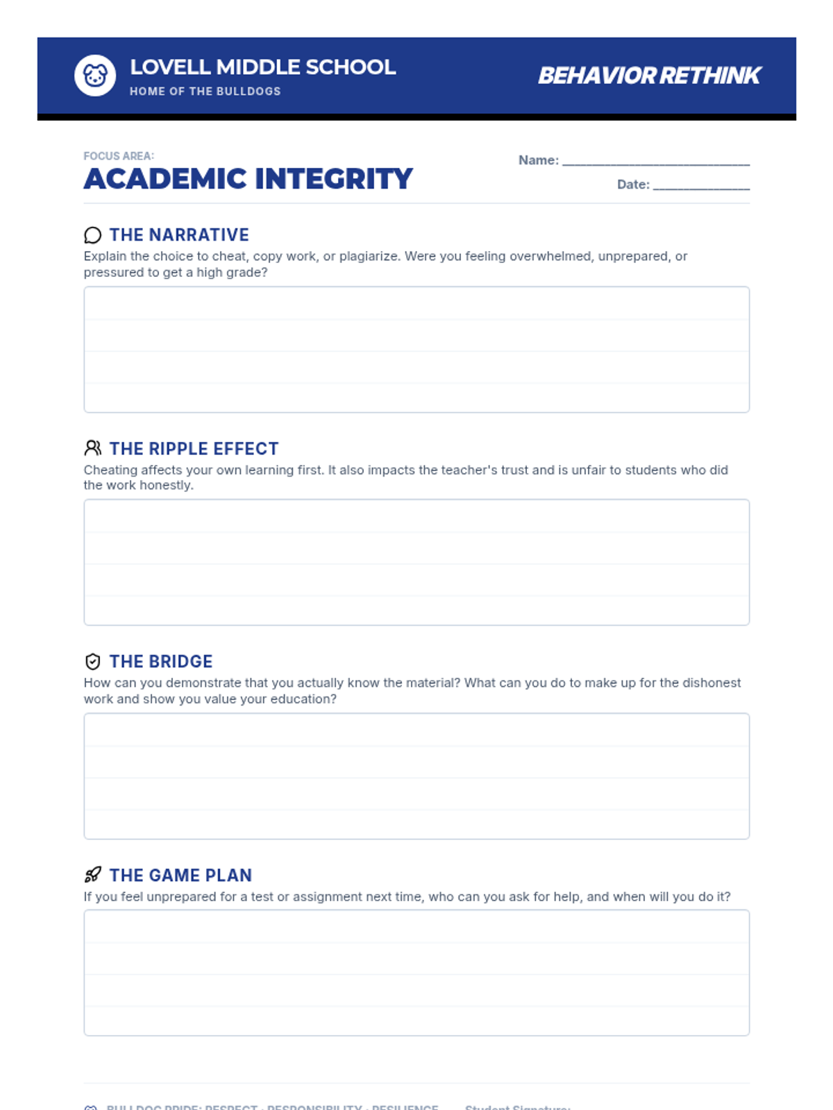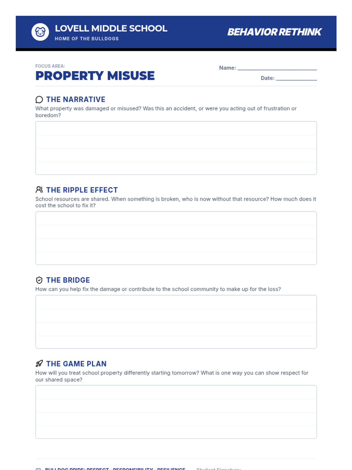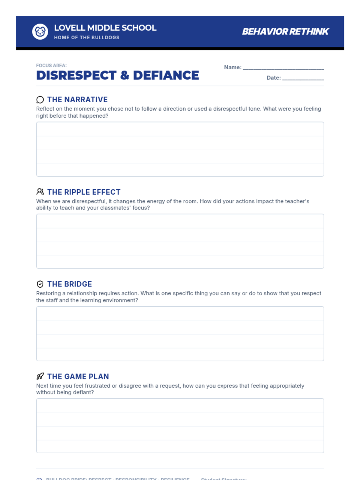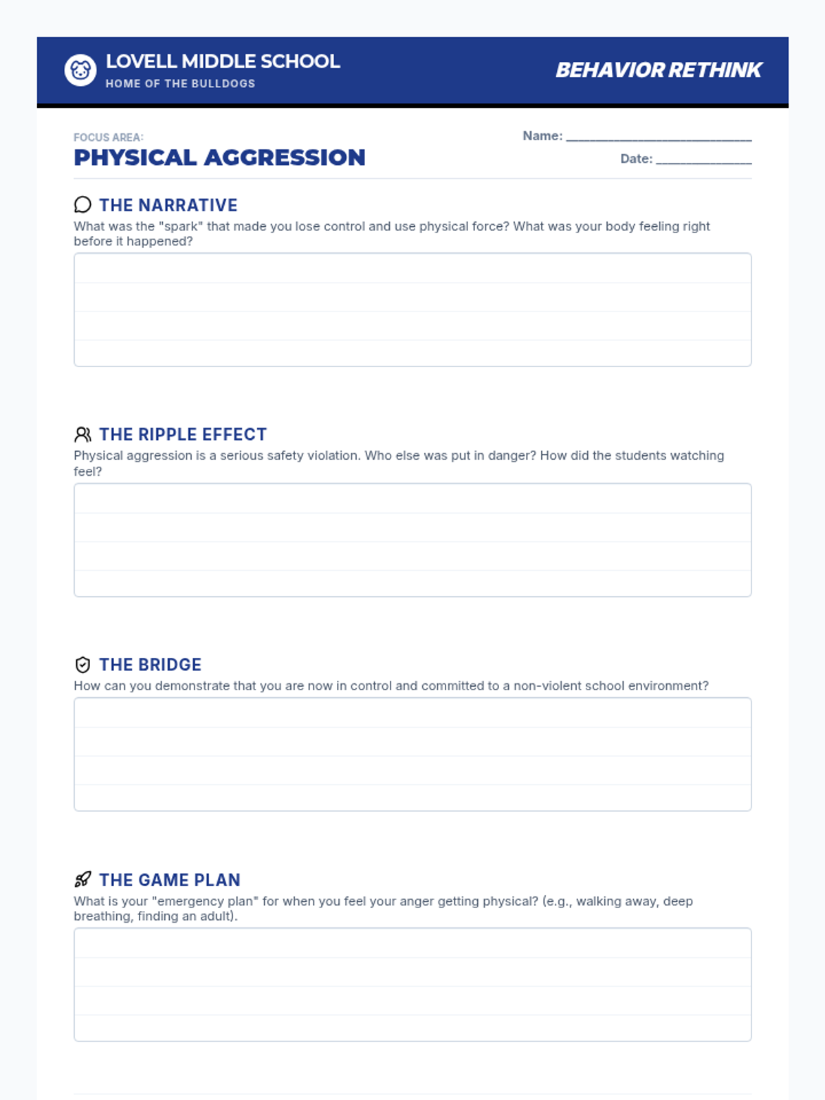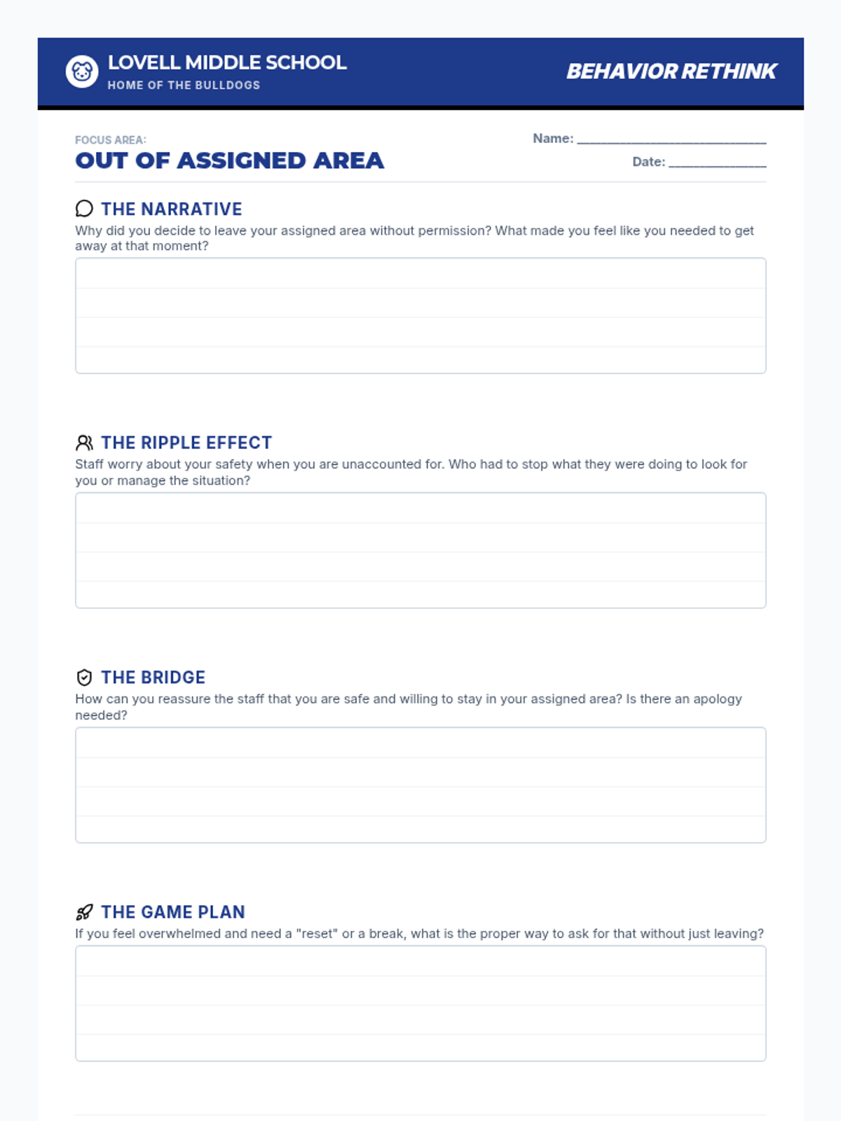 A collection of restorative writing prompts and reflection tools designed to help middle school students process behavioral incidents, understand impact, and plan for repair.