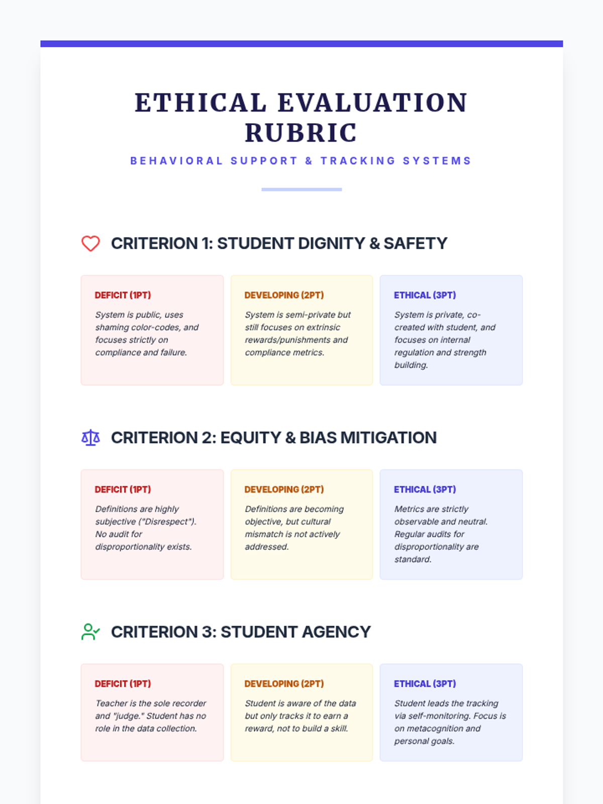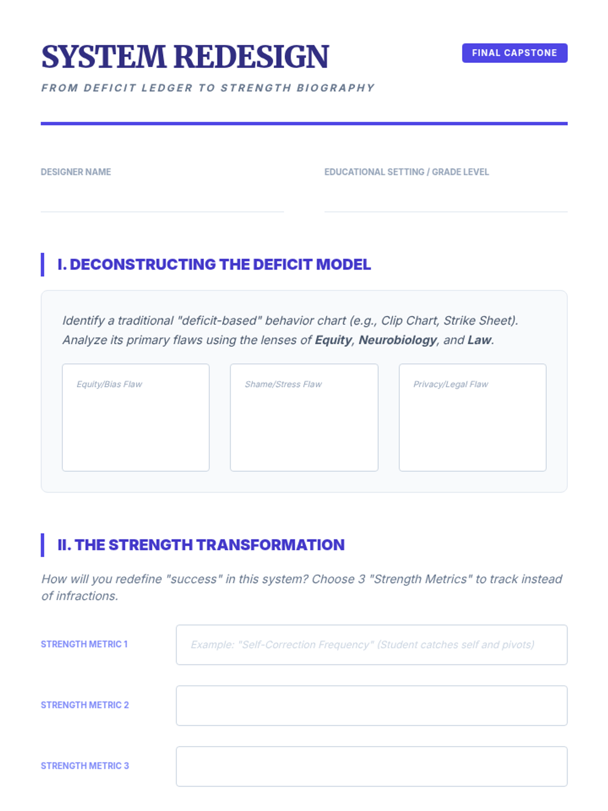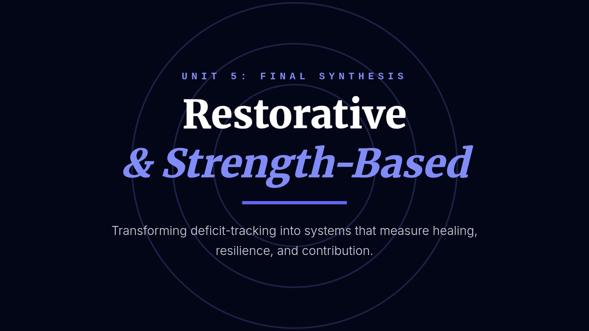 Students design tracking systems that measure positive replacement behaviors and strength utilization, aligning data collection with Restorative Justice frameworks.