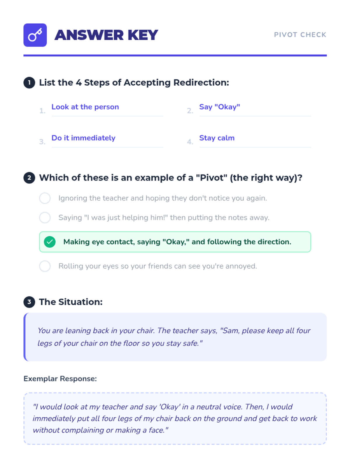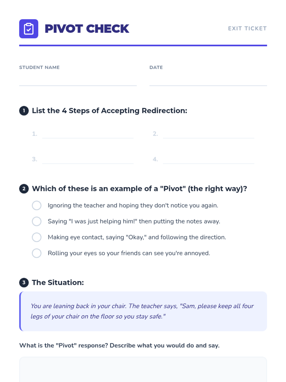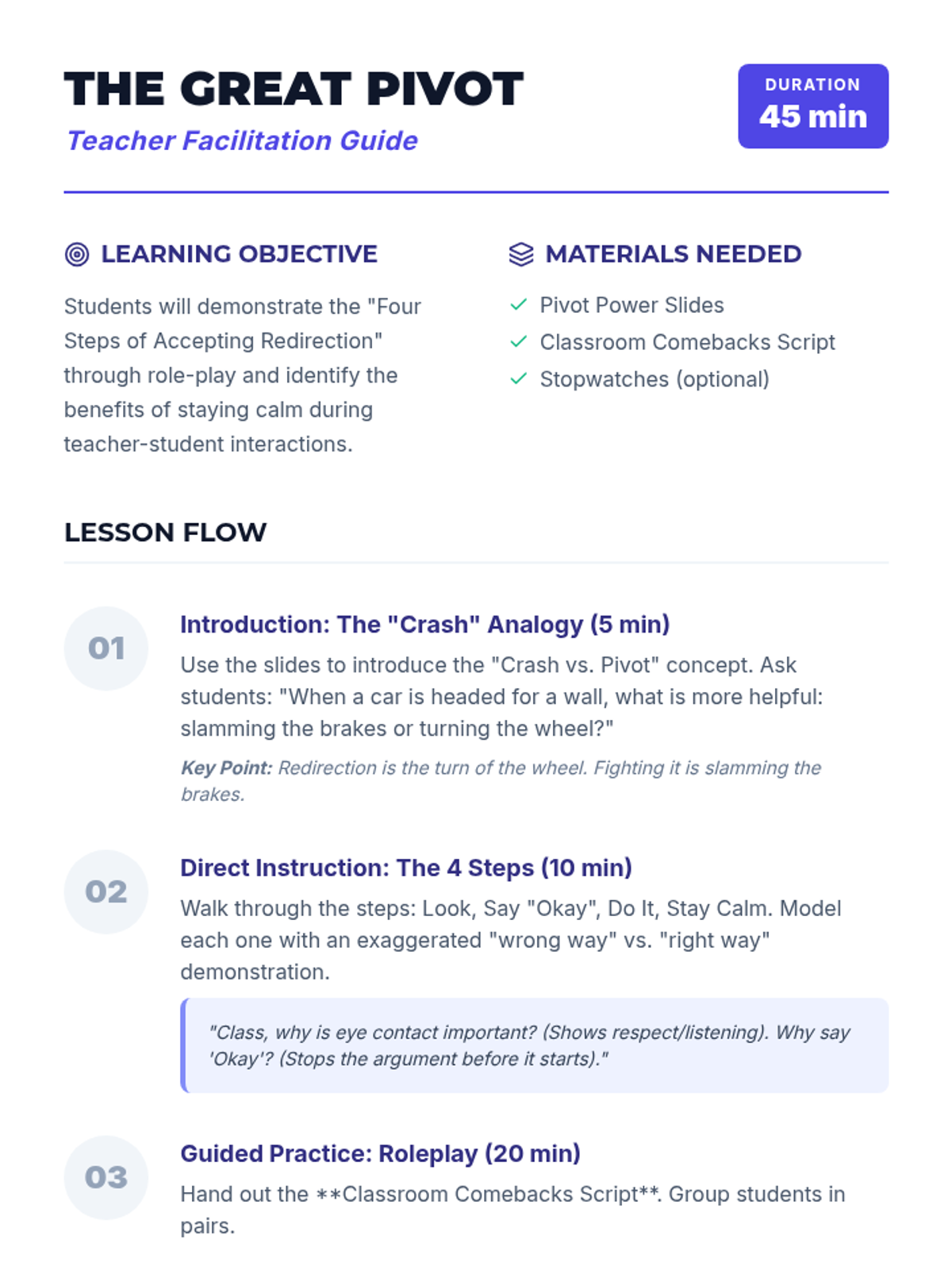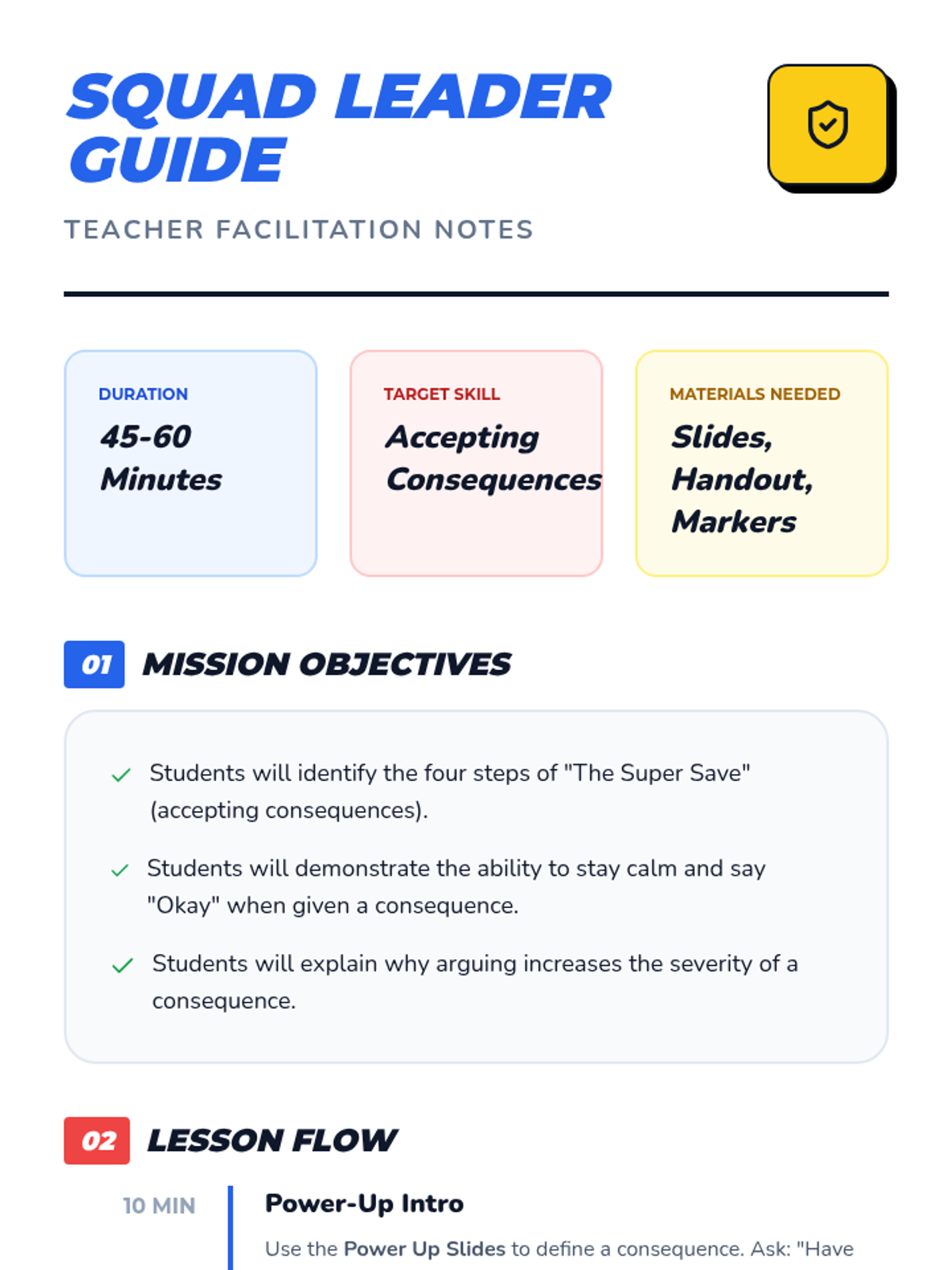 This lesson teaches students how to handle teacher corrections and consequences without escalation. Through role-play and reflective activities, students practice the 'Four Steps of Accepting Redirection' to maintain a positive classroom environment.