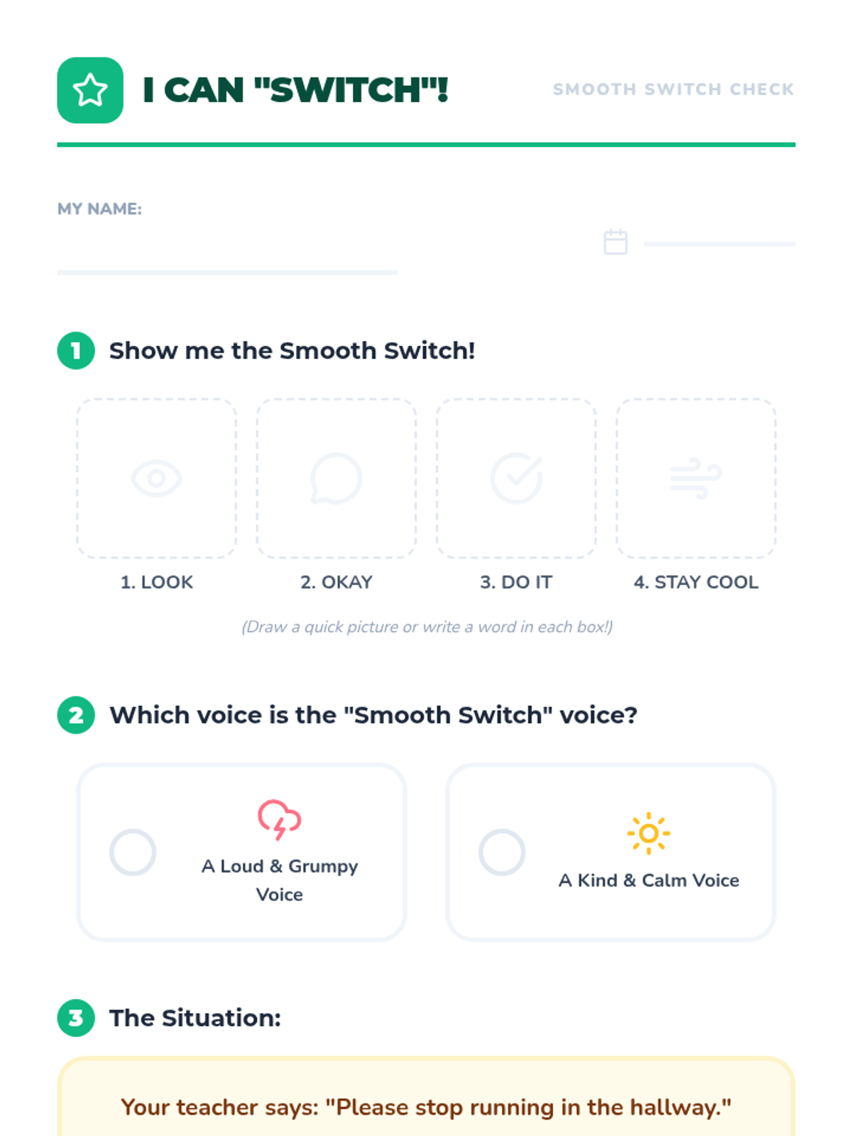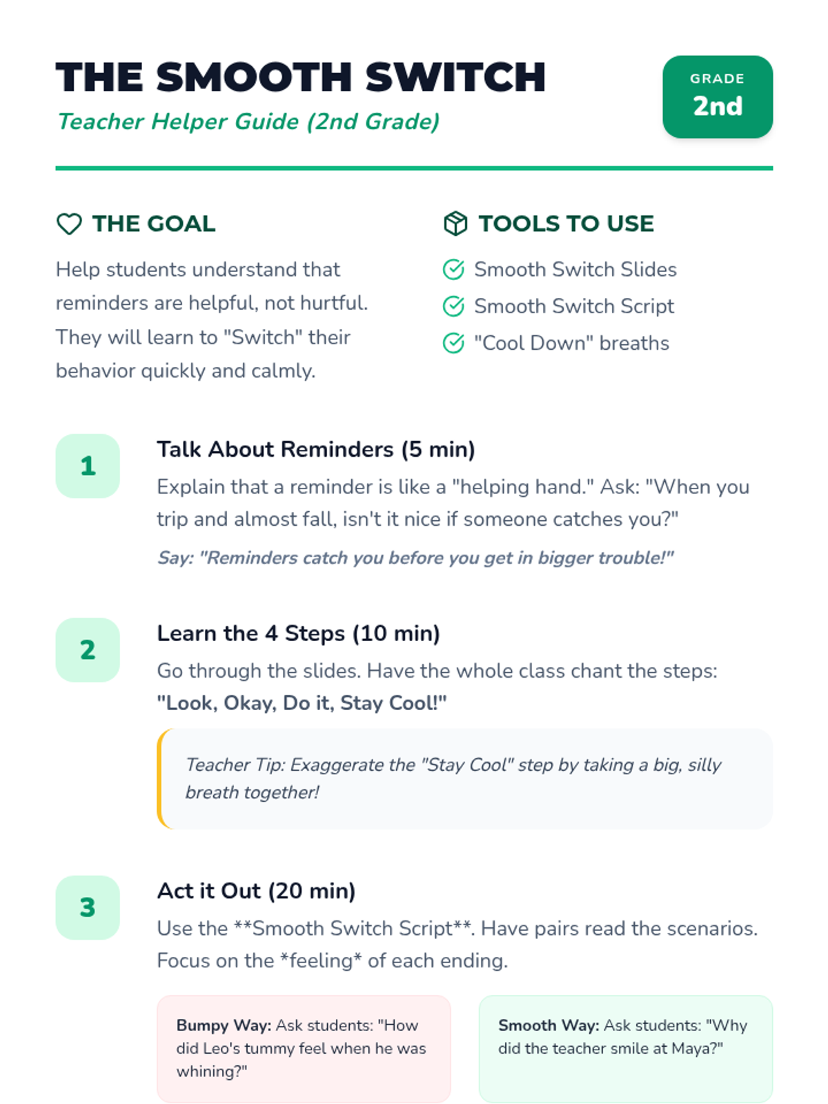 This lesson helps 2nd graders learn how to handle teacher reminders and consequences with a positive attitude. Students practice 'The Smooth Switch'—a simple four-step plan to fix mistakes without getting upset.