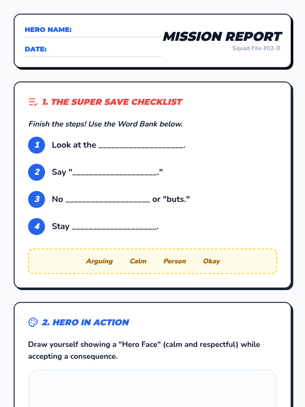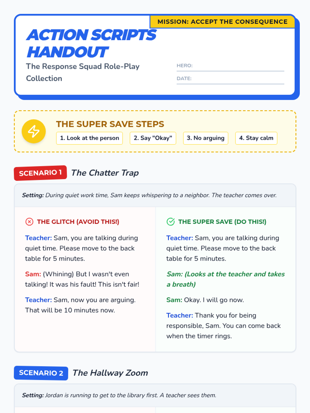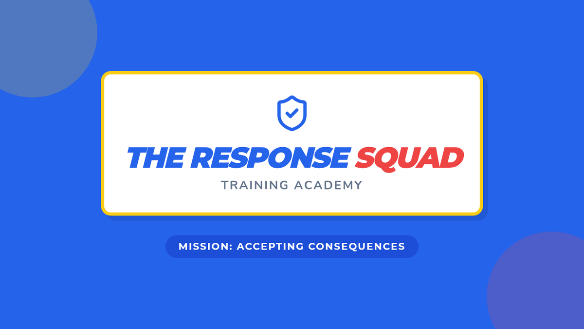 A lesson focused on teaching second graders how to accept consequences for breaking classroom rules using a superhero 'Response Squad' theme. Students practice specific steps: looking at the person, saying 'Okay', and staying calm.