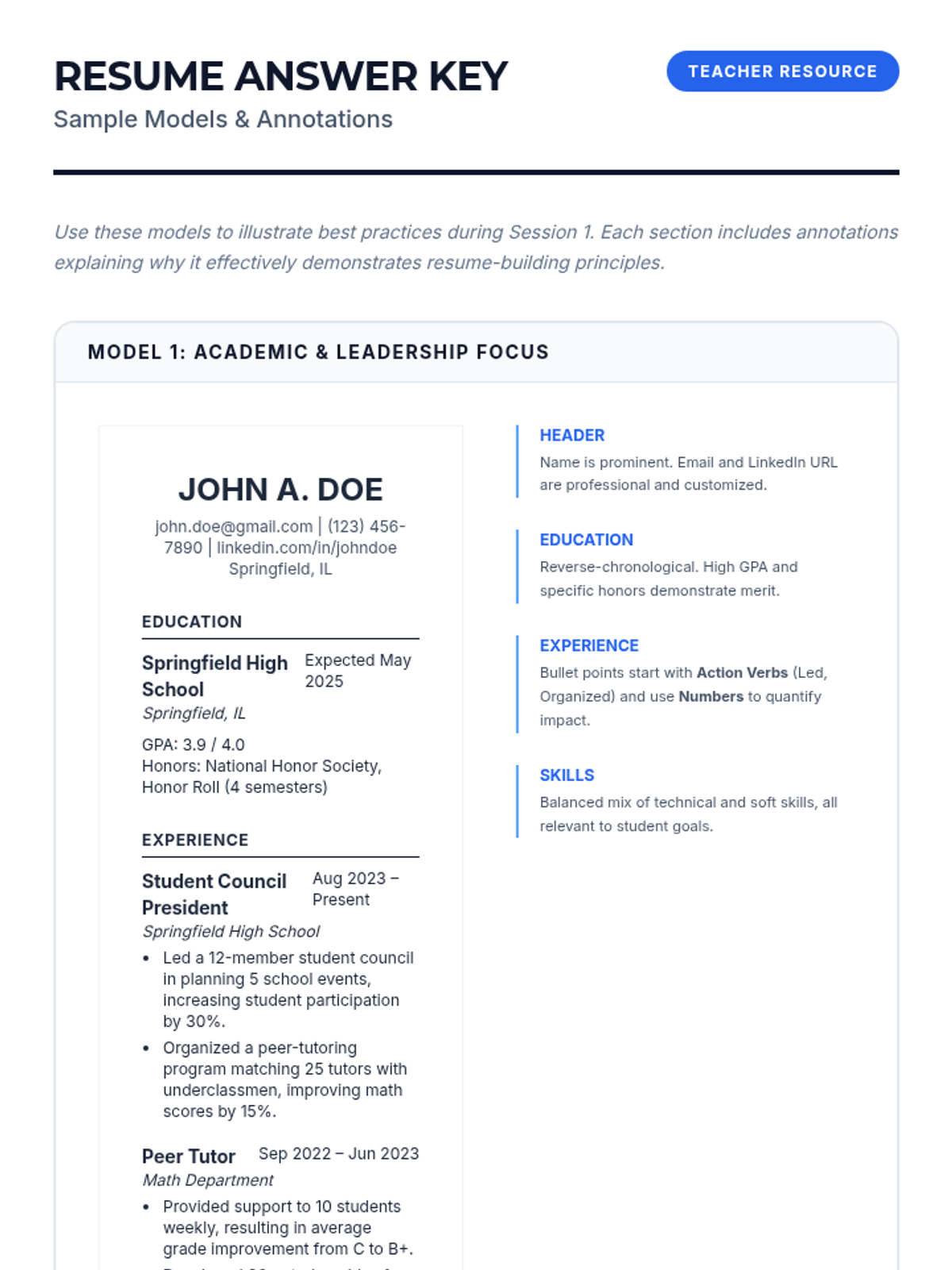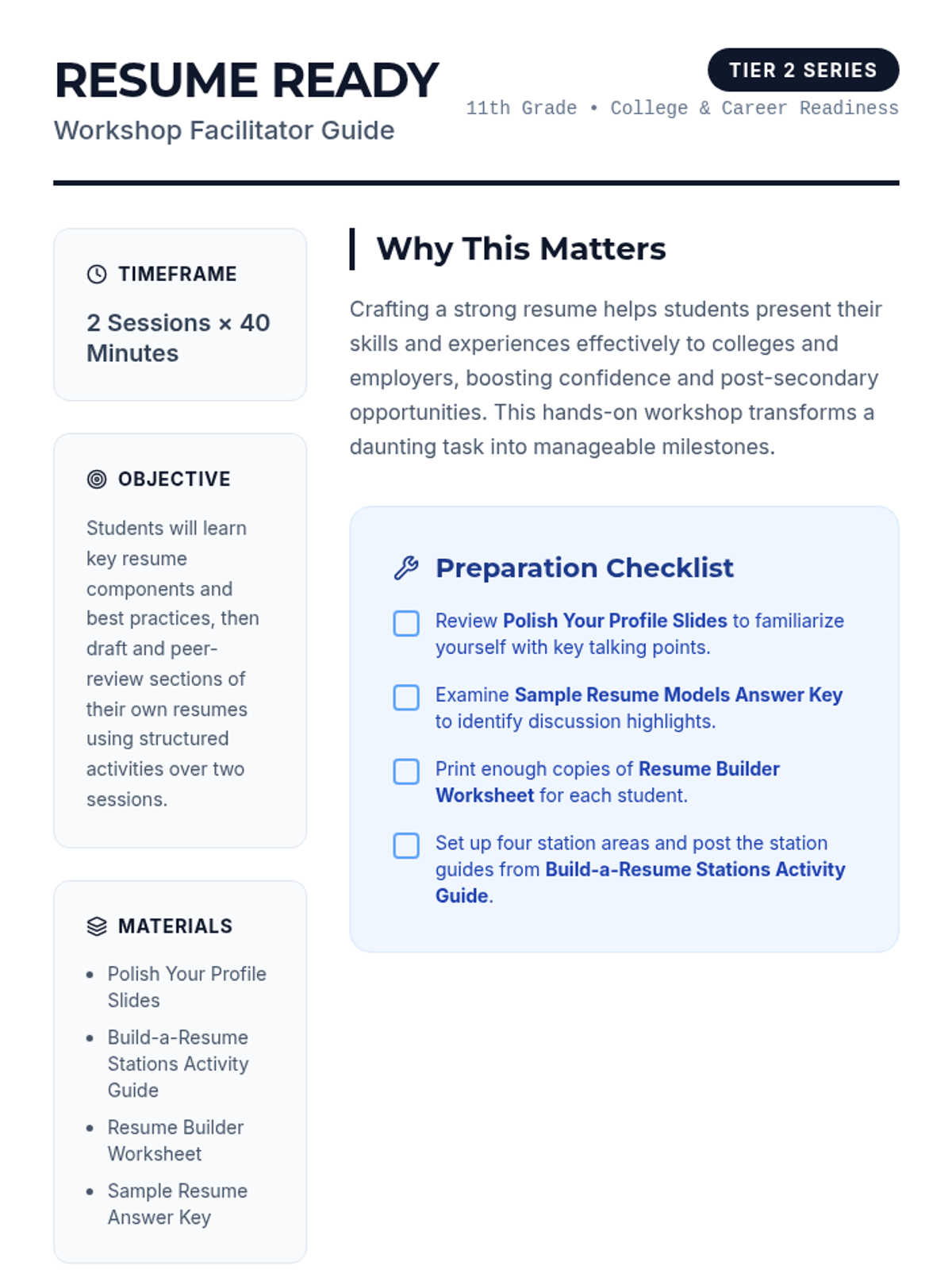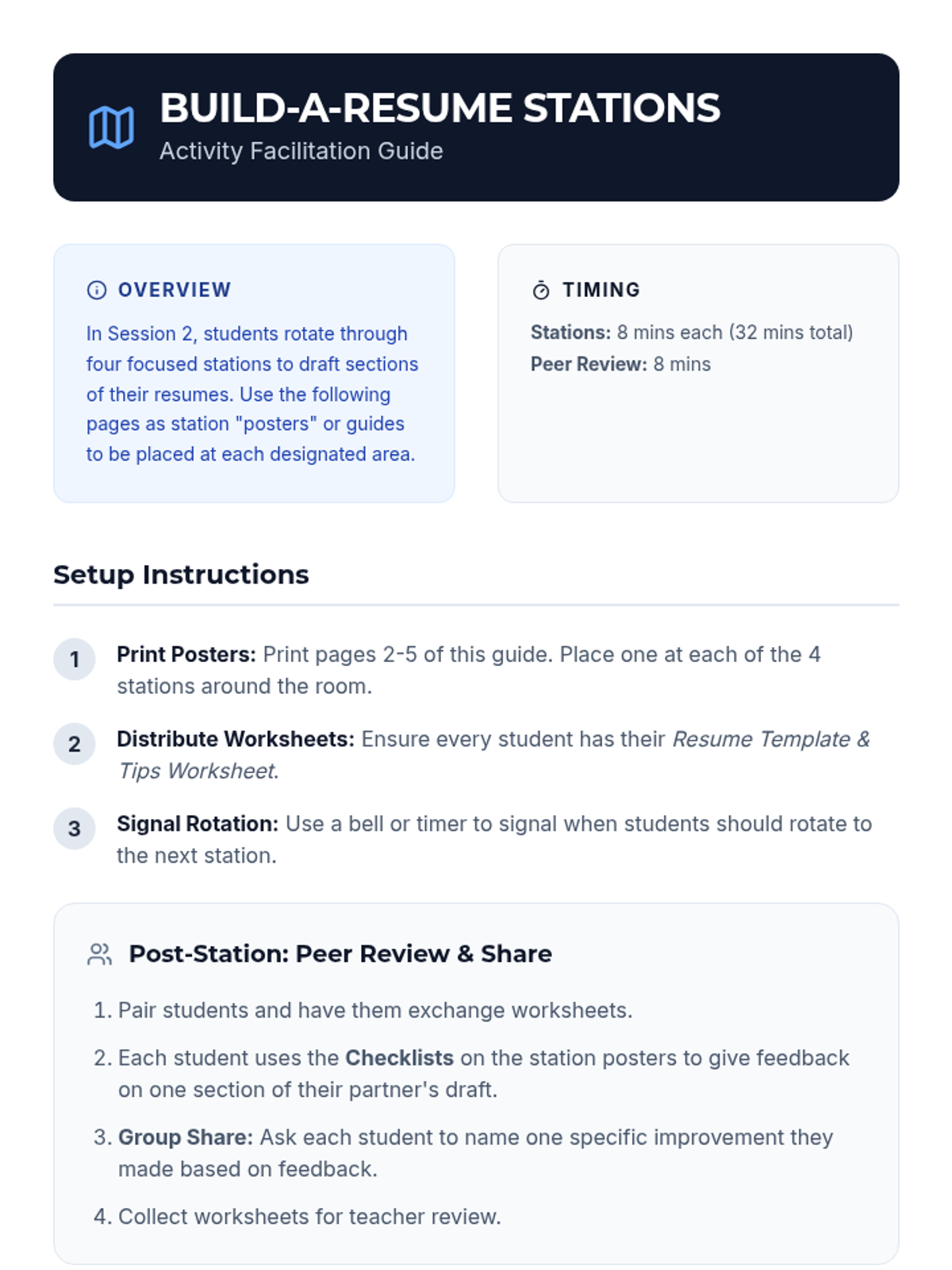 A 2-session workshop series for 11th graders to master resume writing, featuring interactive stations, sample analysis, and peer feedback.