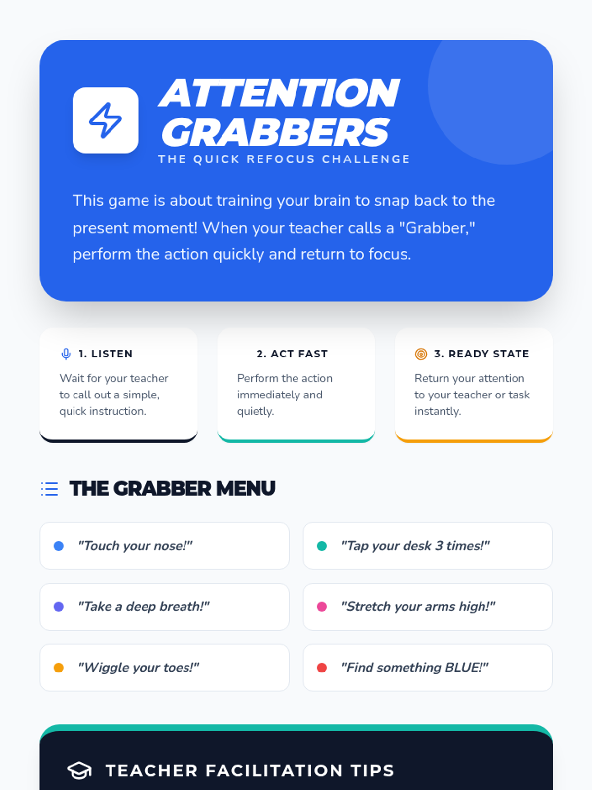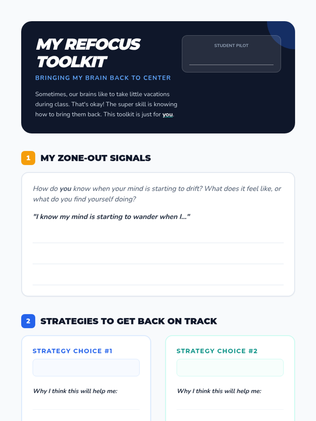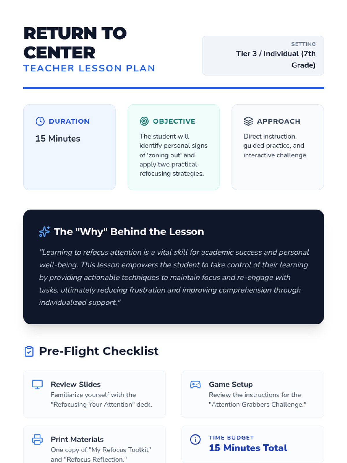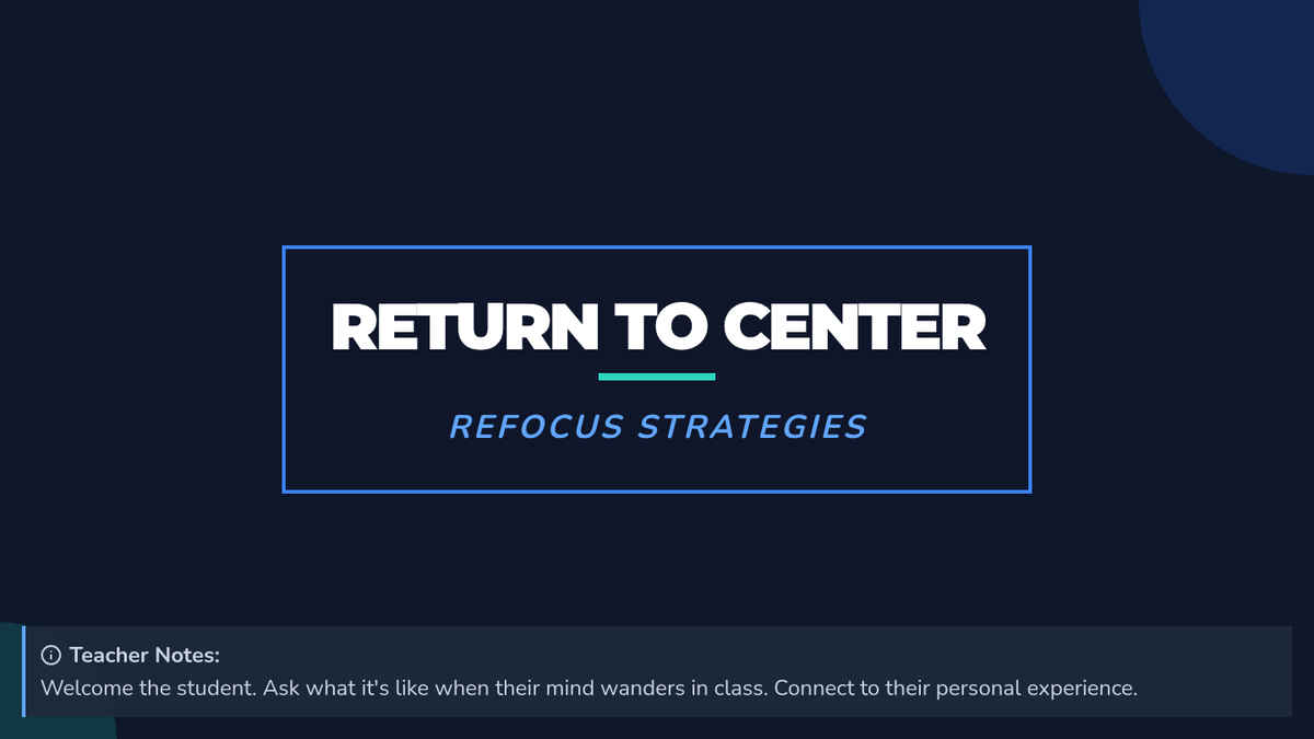 This 15-minute Tier 3 lesson introduces 7th-grade students to practical strategies for identifying when they are 'zoning out' and applying techniques to bring their attention back to the present. through direct instruction, guided practice, and interactive games, students build a personalized toolkit for self-regulation.