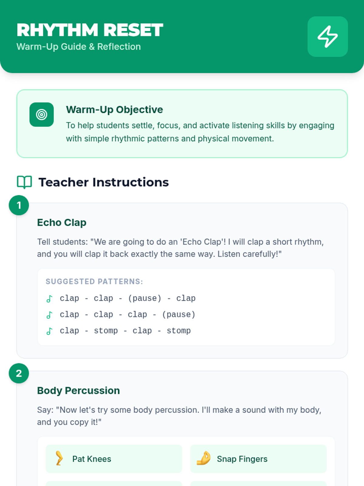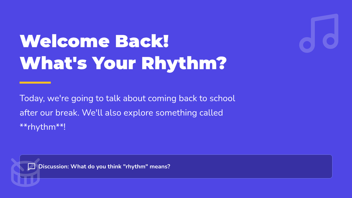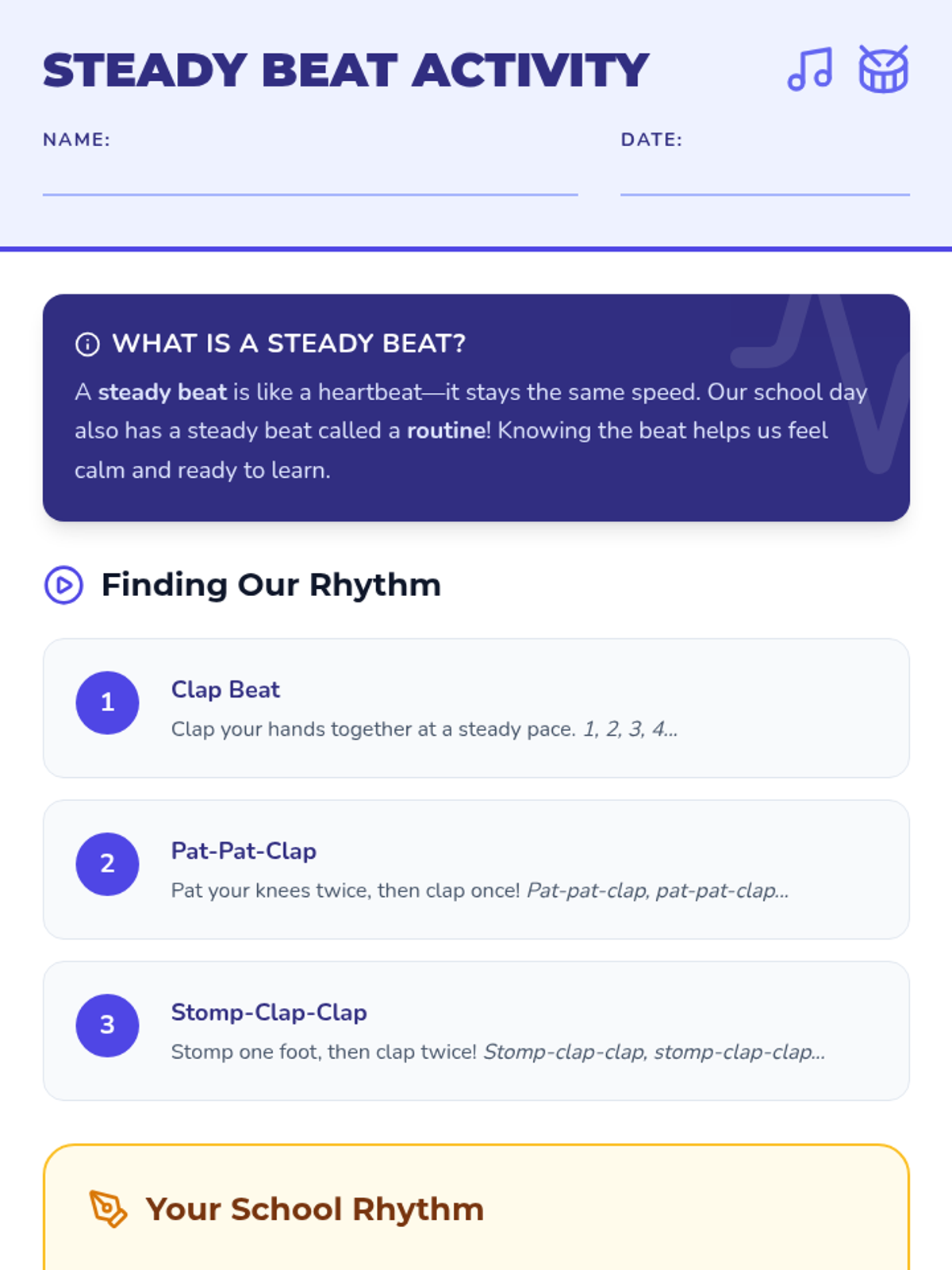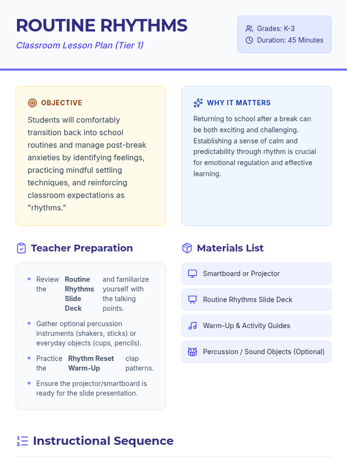 This lesson helps K-3 students transition back into school routines by exploring the concept of rhythm. Students identify feelings about returning, practice mindful settling through steady beat activities, and reinforce classroom expectations as predictable "beats" in their day.