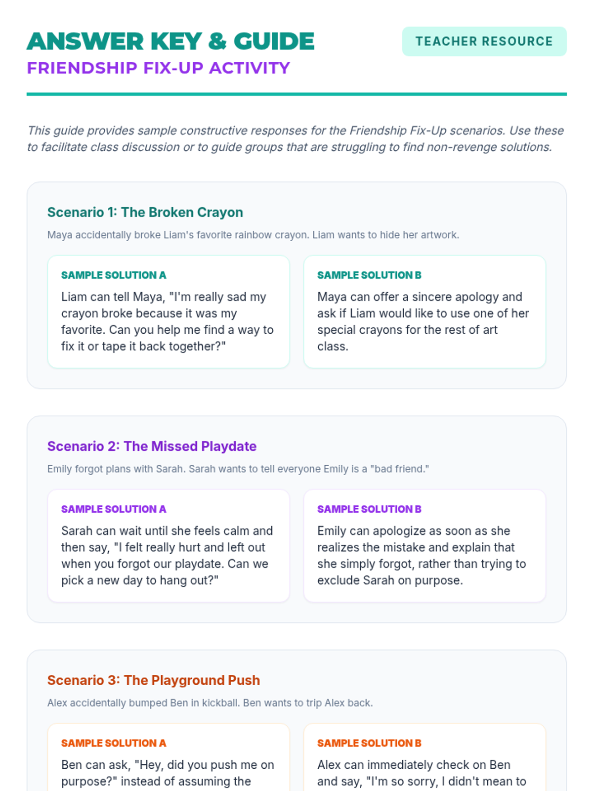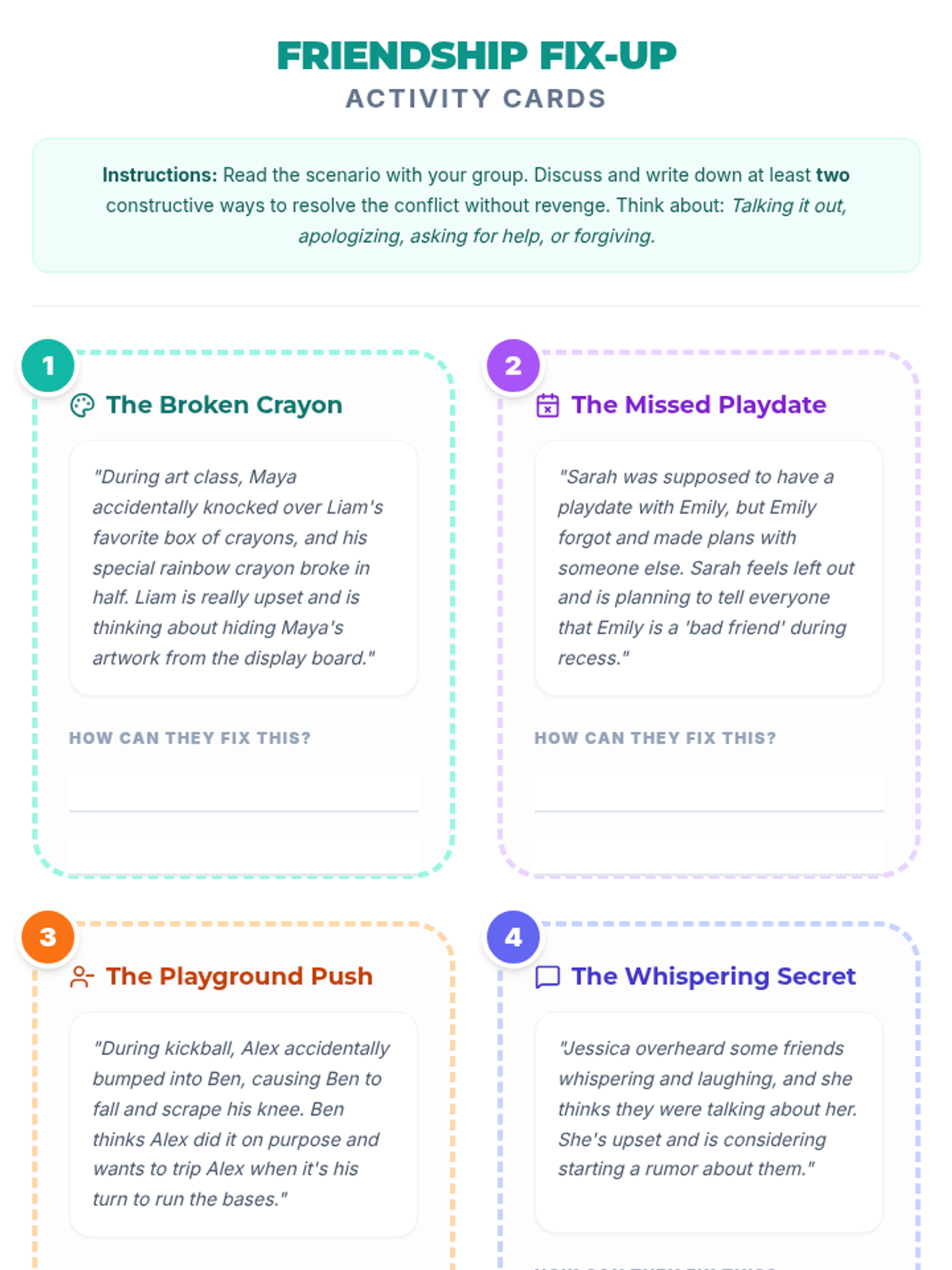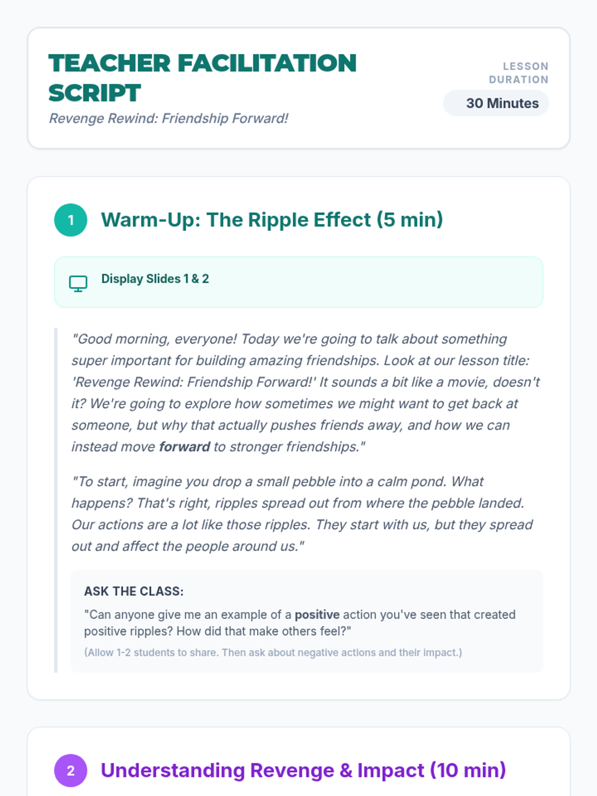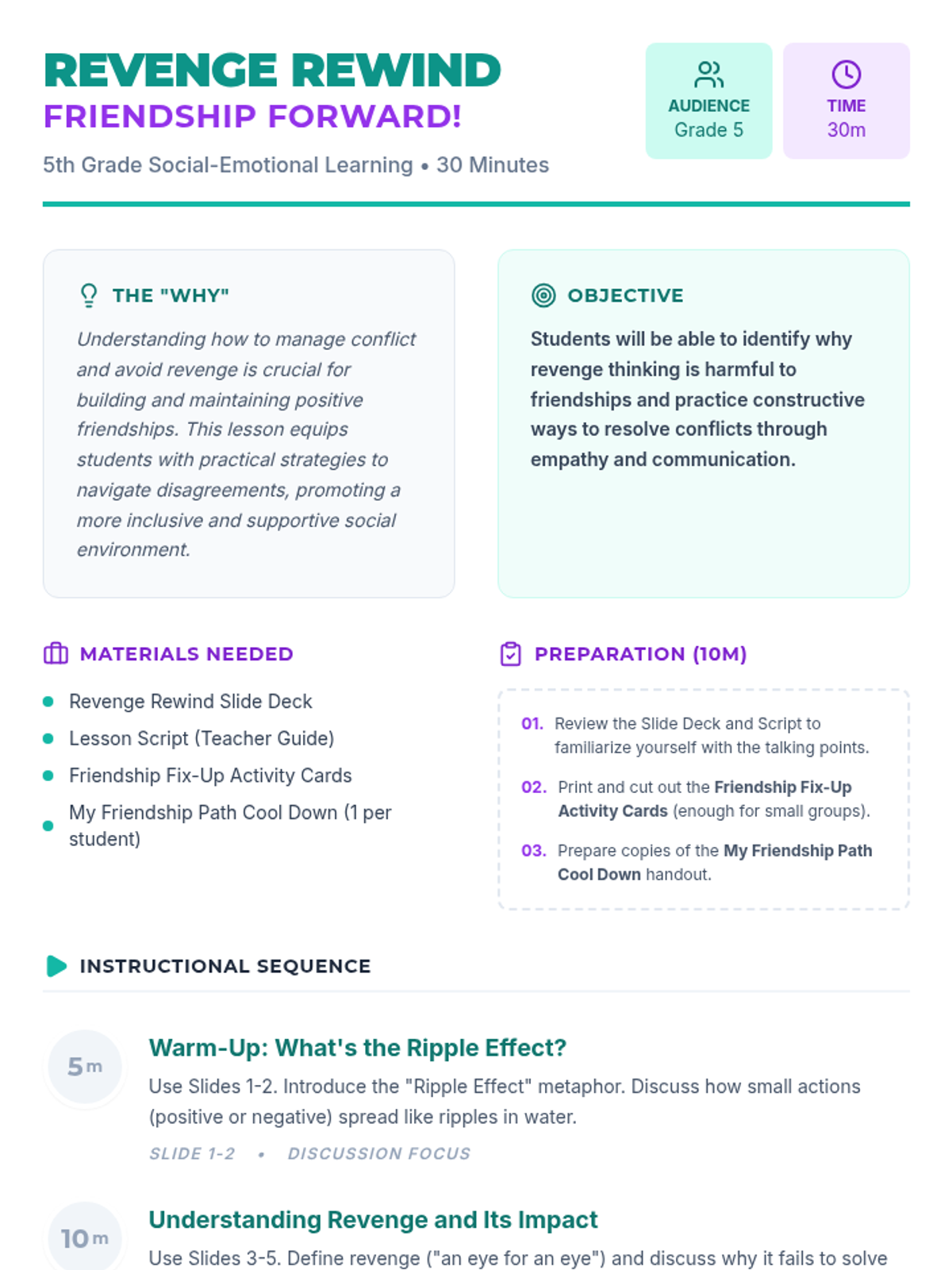 A 30-minute SEL lesson for 5th graders that explores the negative ripple effects of revenge and teaches constructive strategies for resolving conflicts and maintaining healthy friendships.