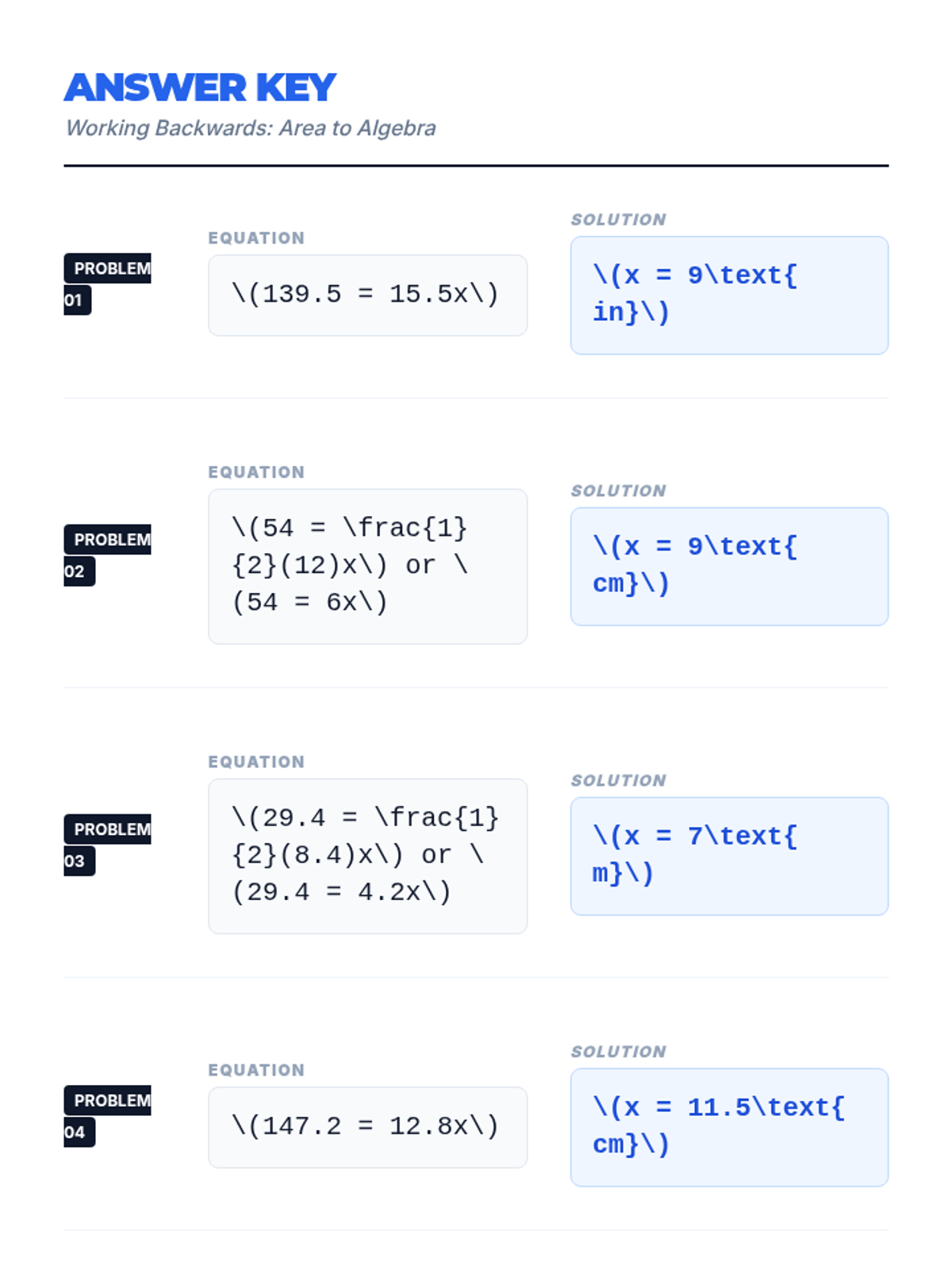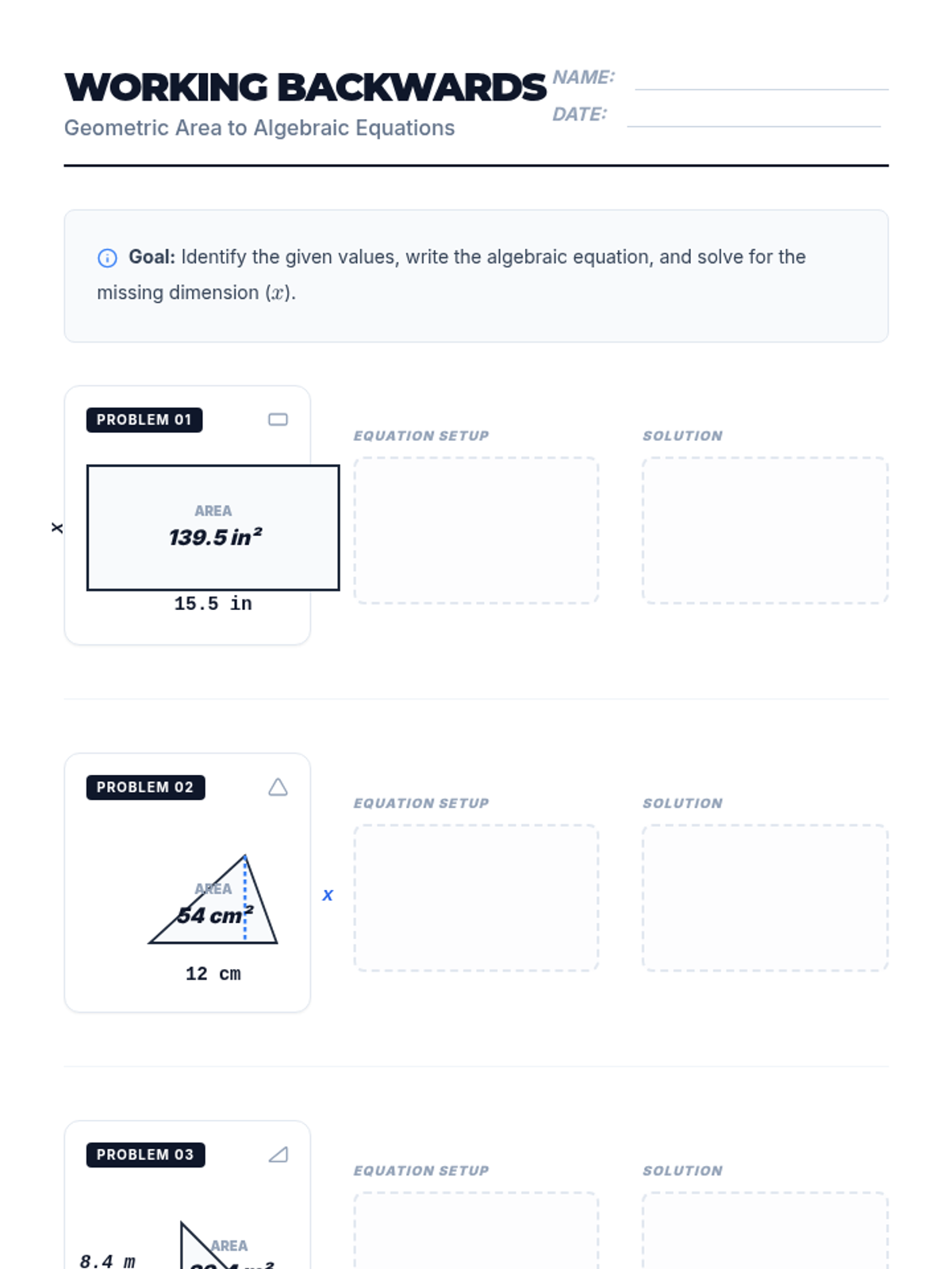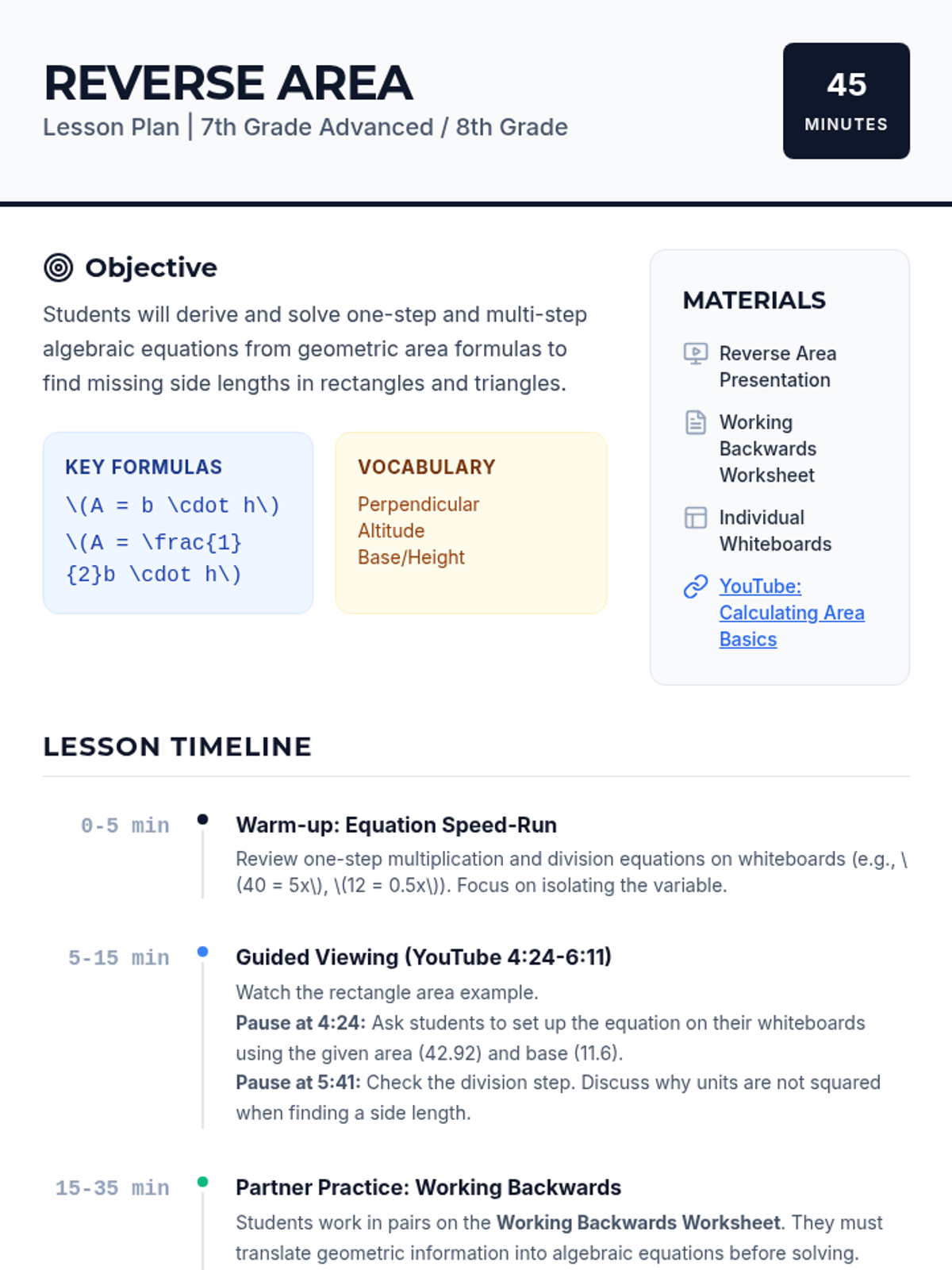 A geometry-focused algebra lesson where students solve for missing dimensions of rectangles and triangles using area formulas. Includes decimal calculations and 'spot the mistake' error analysis.