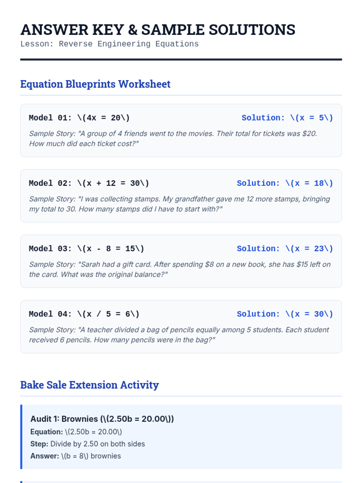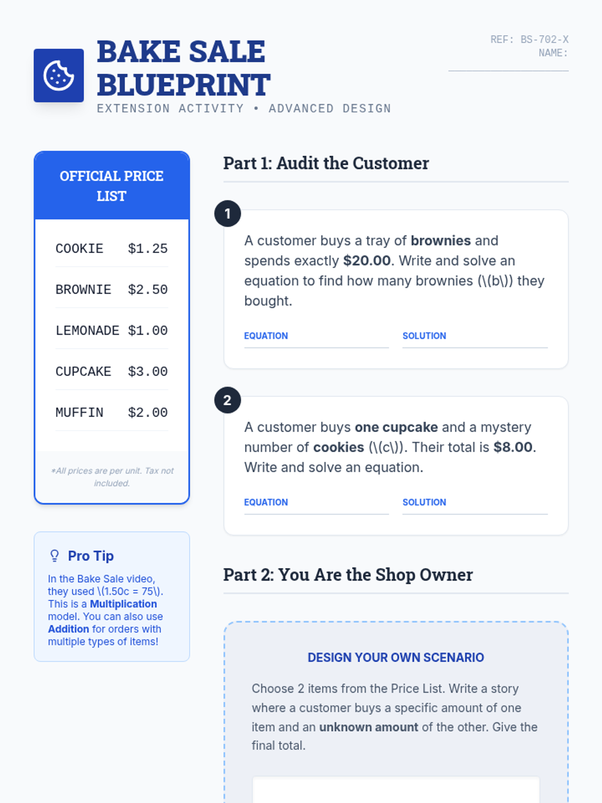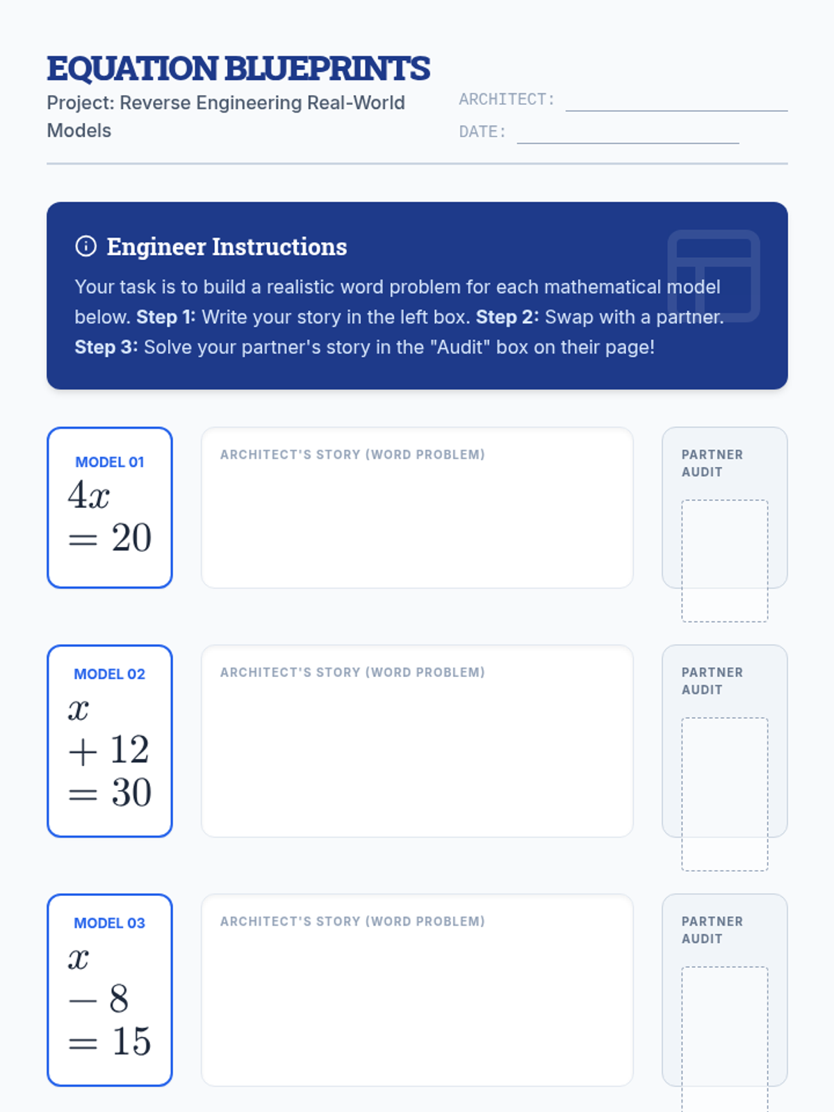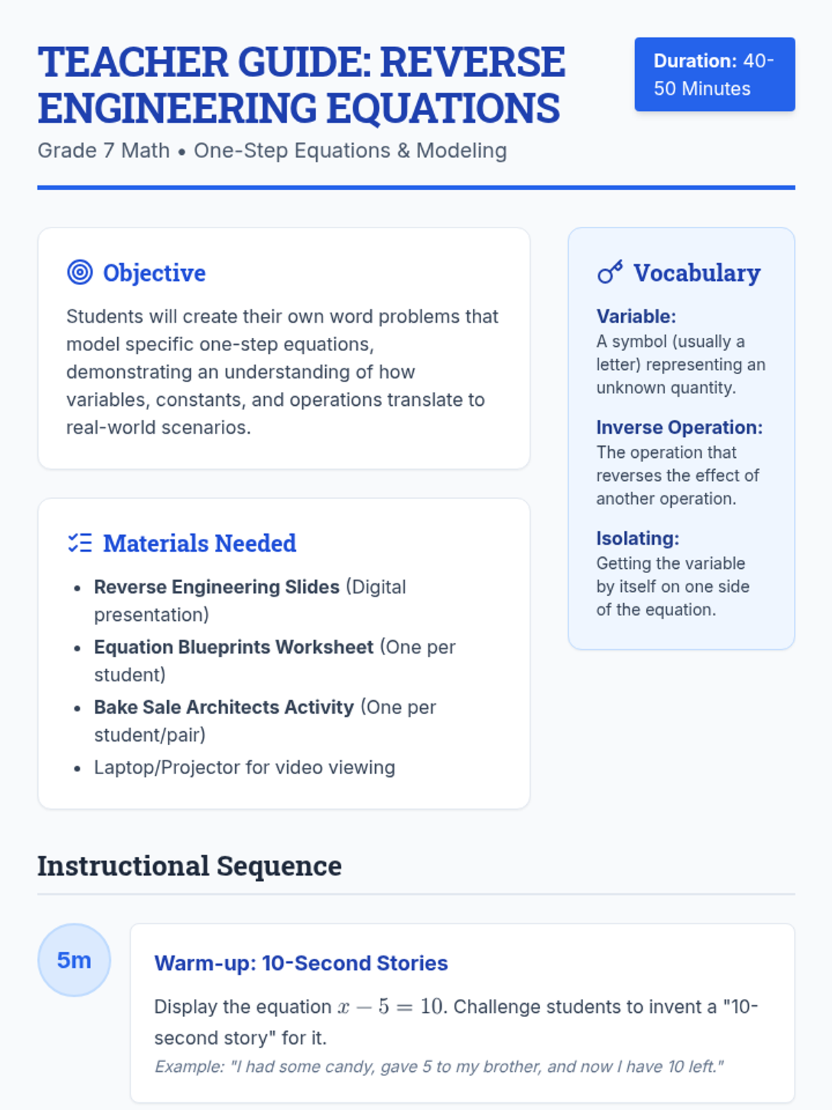 Students will learn to 'reverse engineer' one-step equations by writing realistic word problems for given mathematical models. They will analyze a tutorial video, practice writing scenarios for addition, subtraction, multiplication, and division equations, and complete a classroom bake sale extension activity.