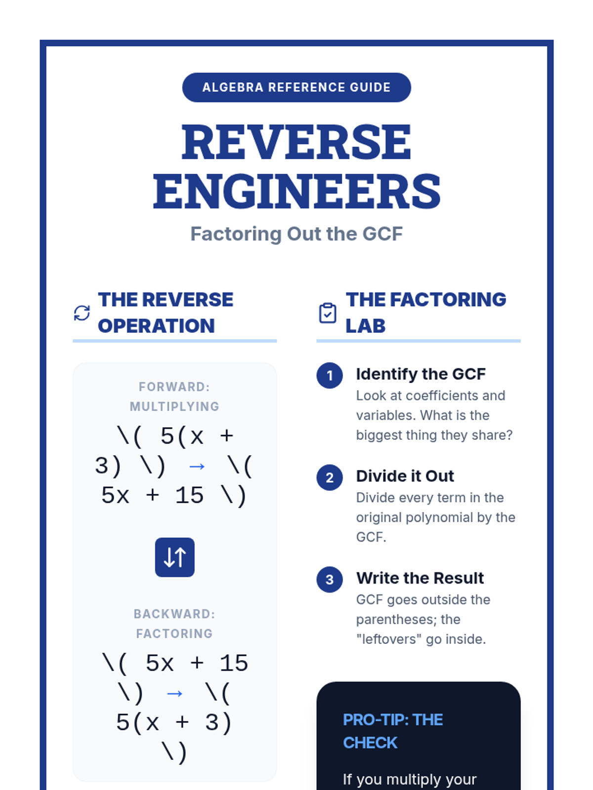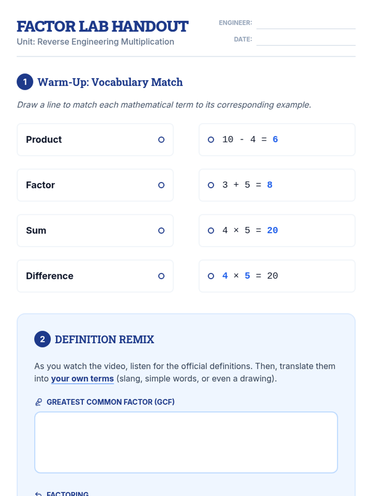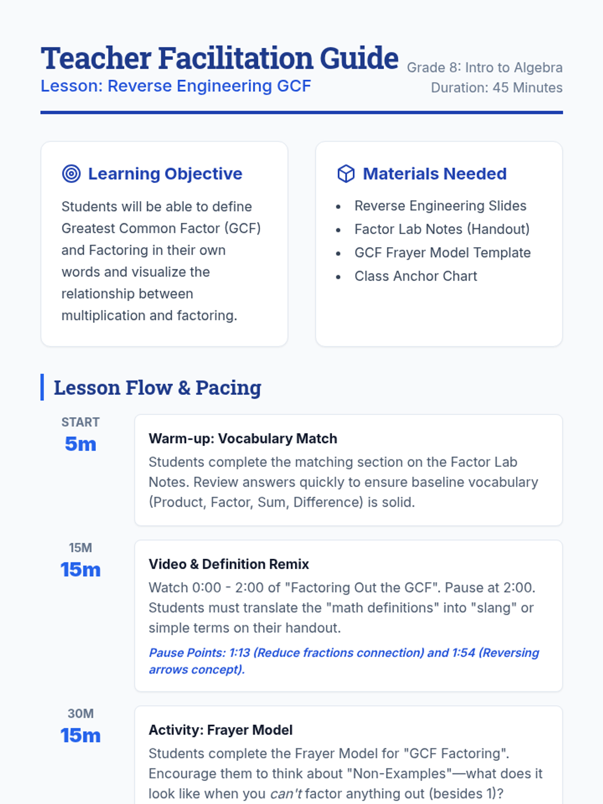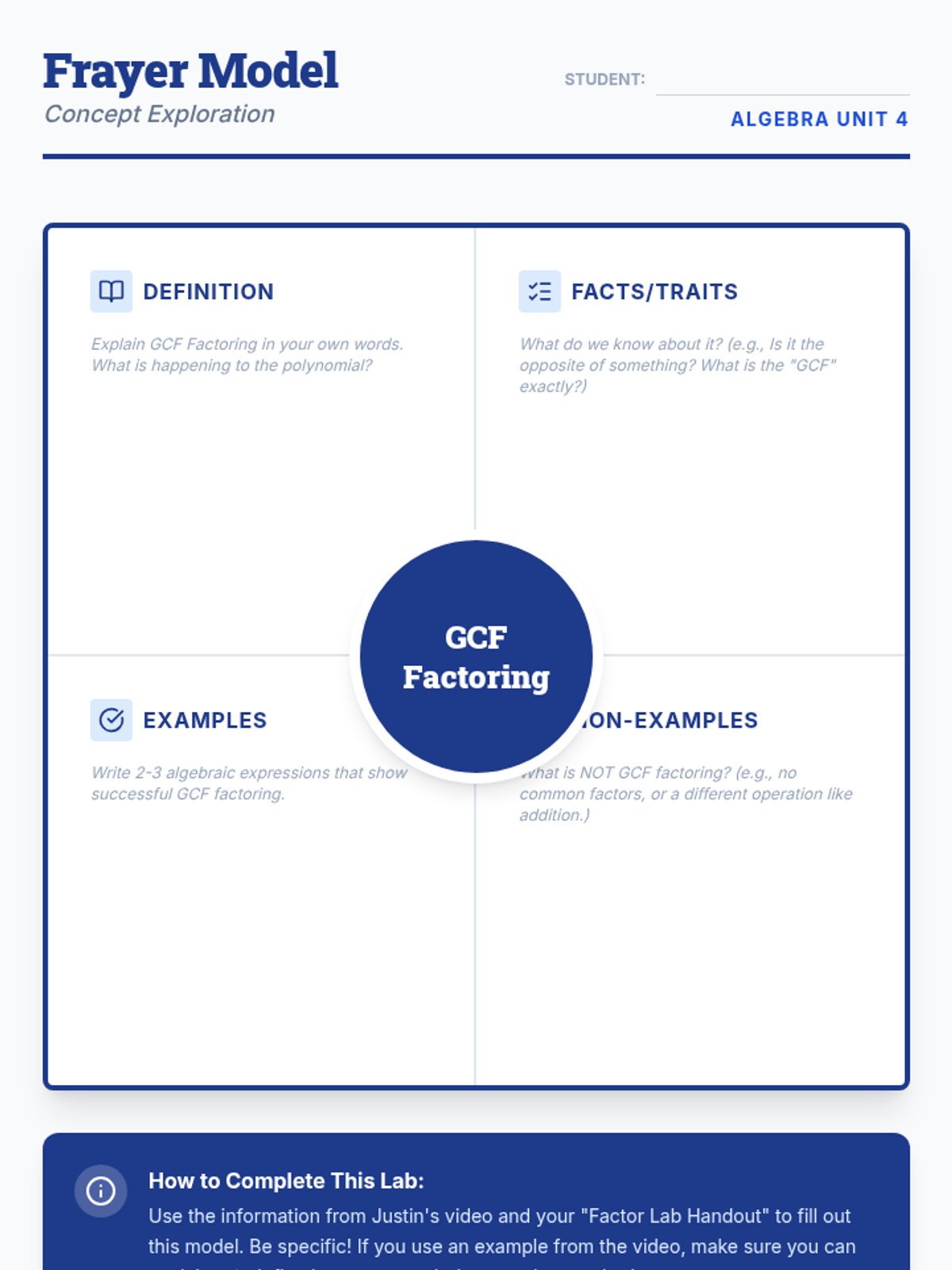 An introductory algebra lesson where students explore the concept of factoring as the inverse of multiplication. Students use a video to define GCF and Factoring in their own words and complete a Frayer model to solidify their understanding.