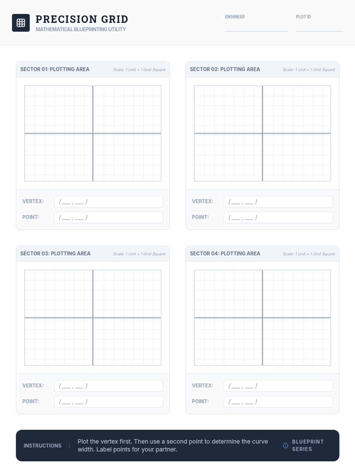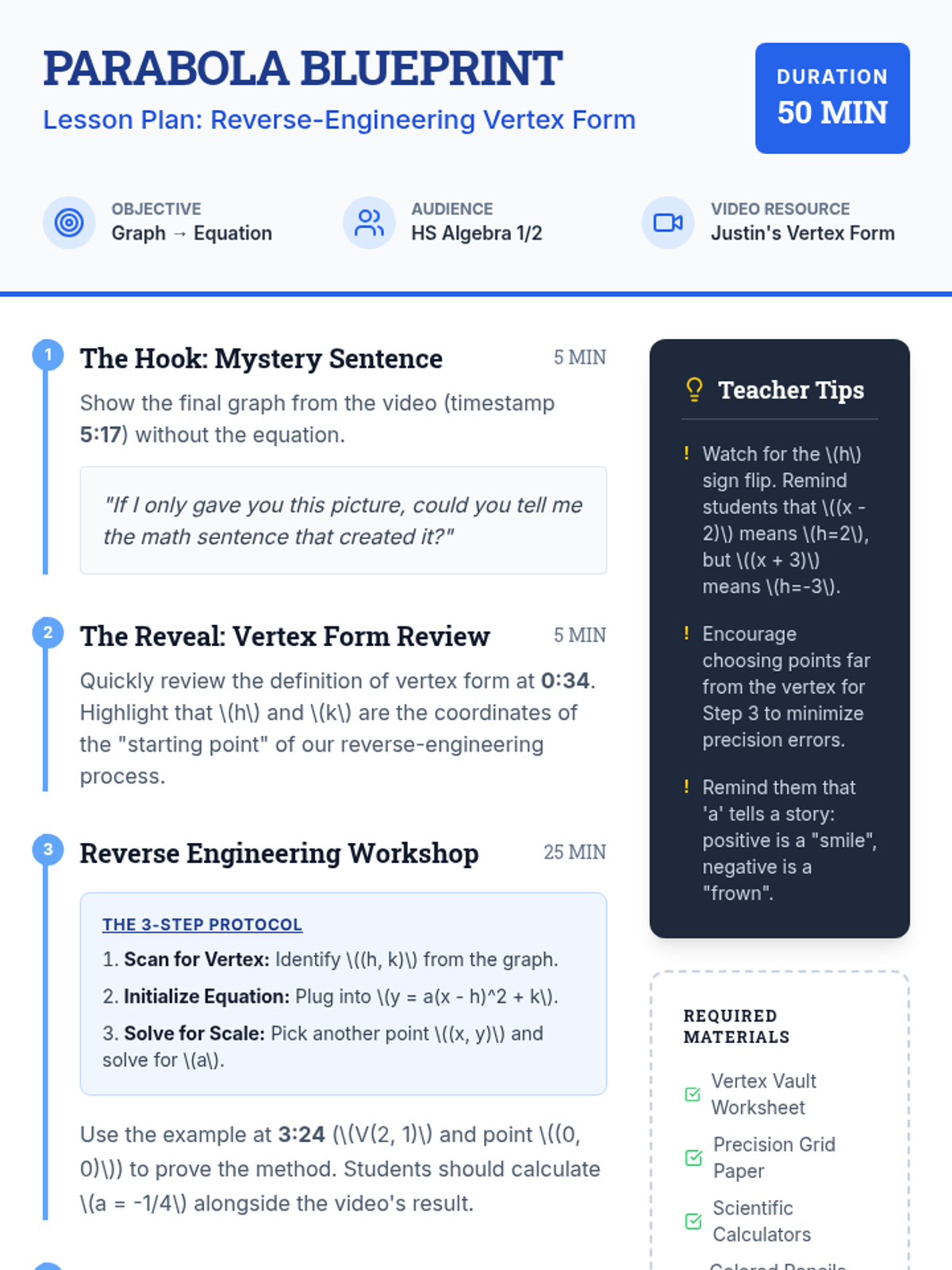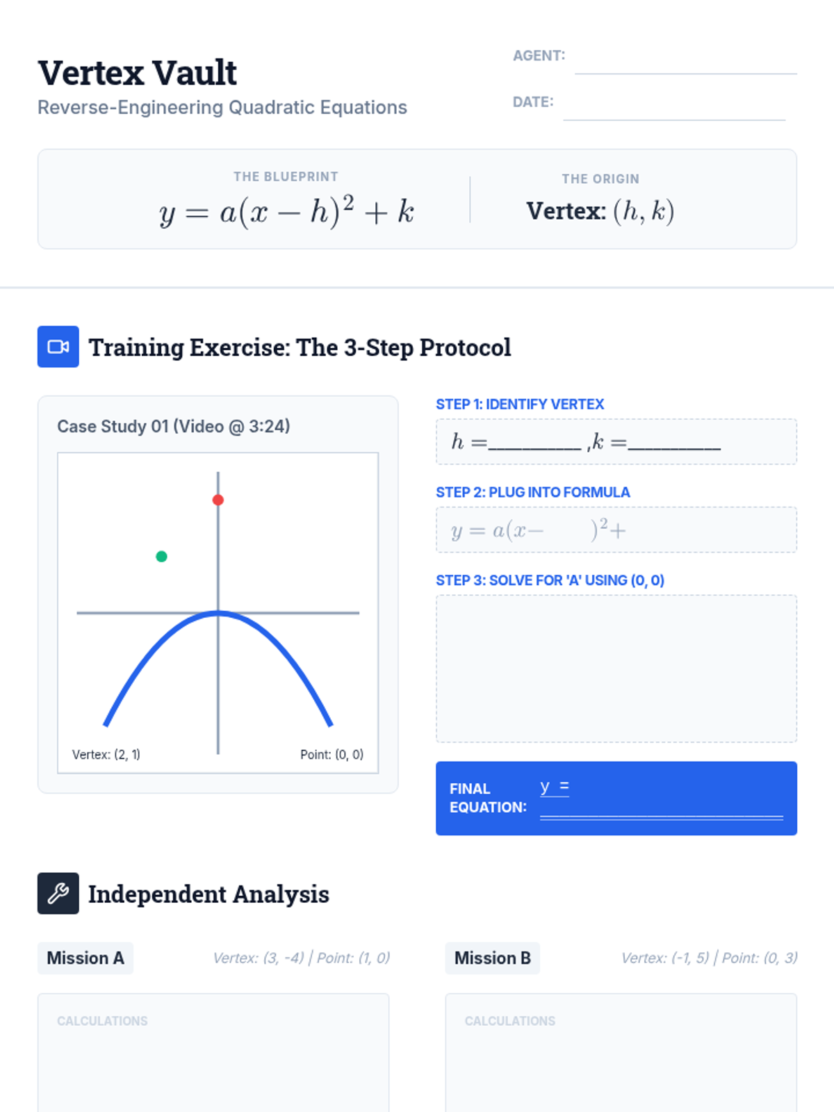 A high school algebra lesson focused on reverse-engineering the vertex form equation of a quadratic function from its graph. Students learn to identify the vertex, plug it into the formula, and solve for the 'a' coefficient using an additional point.