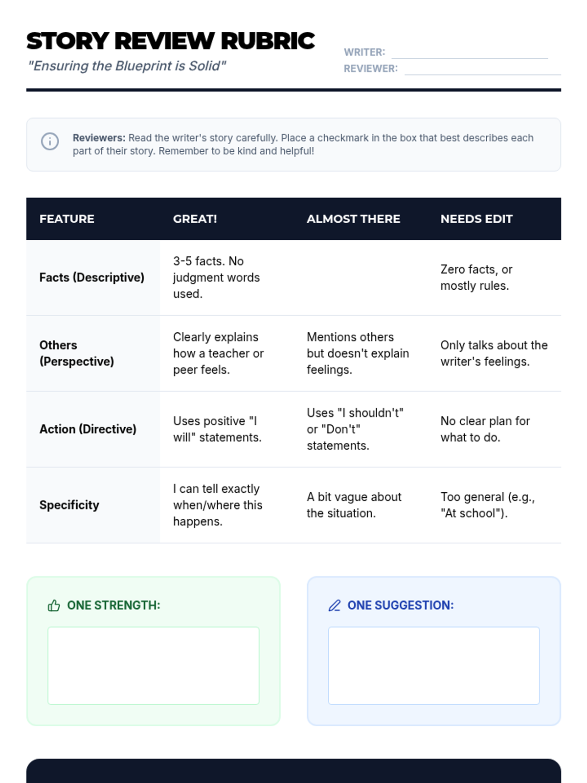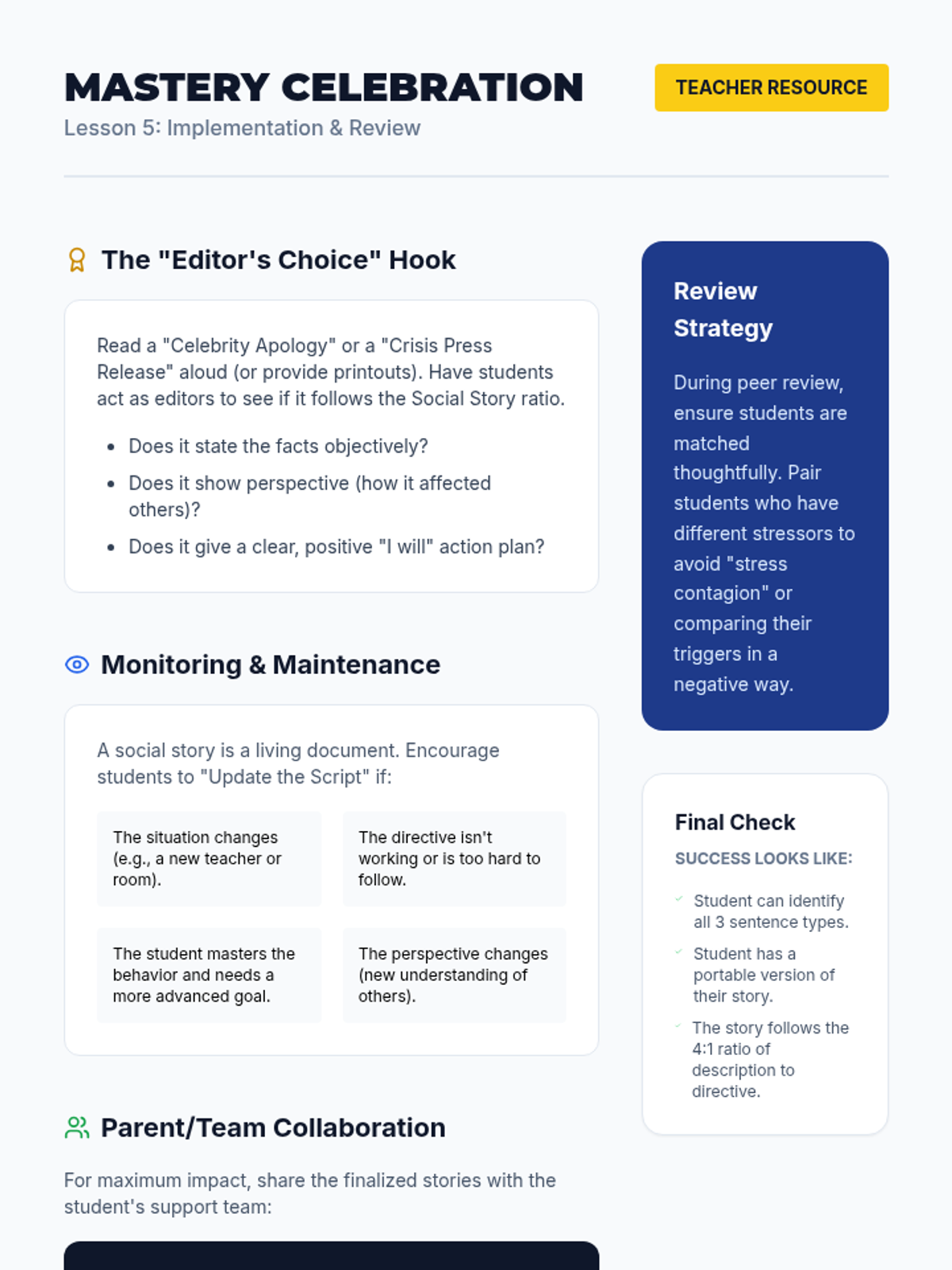 Students engage in a peer-review process to refine their narratives, ensuring the correct balance of sentence types, and then finalize their scripts into portable formats for real-world use.