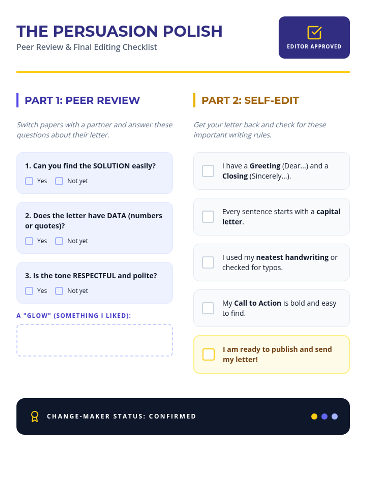 Students refine their writing through peer feedback and prepare their final letters for delivery to their chosen stakeholders.