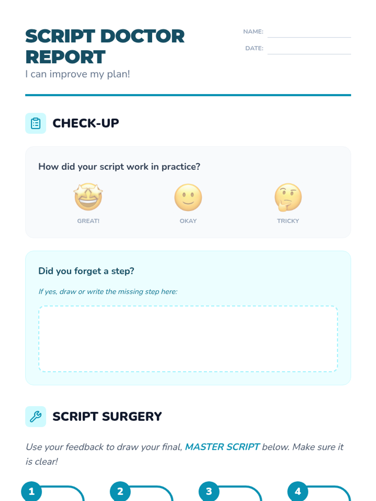 Students reflect on their practice session to see if their script worked. They make adjustments, such as adding a missing step or changing a picture, reinforcing that social stories are flexible tools.