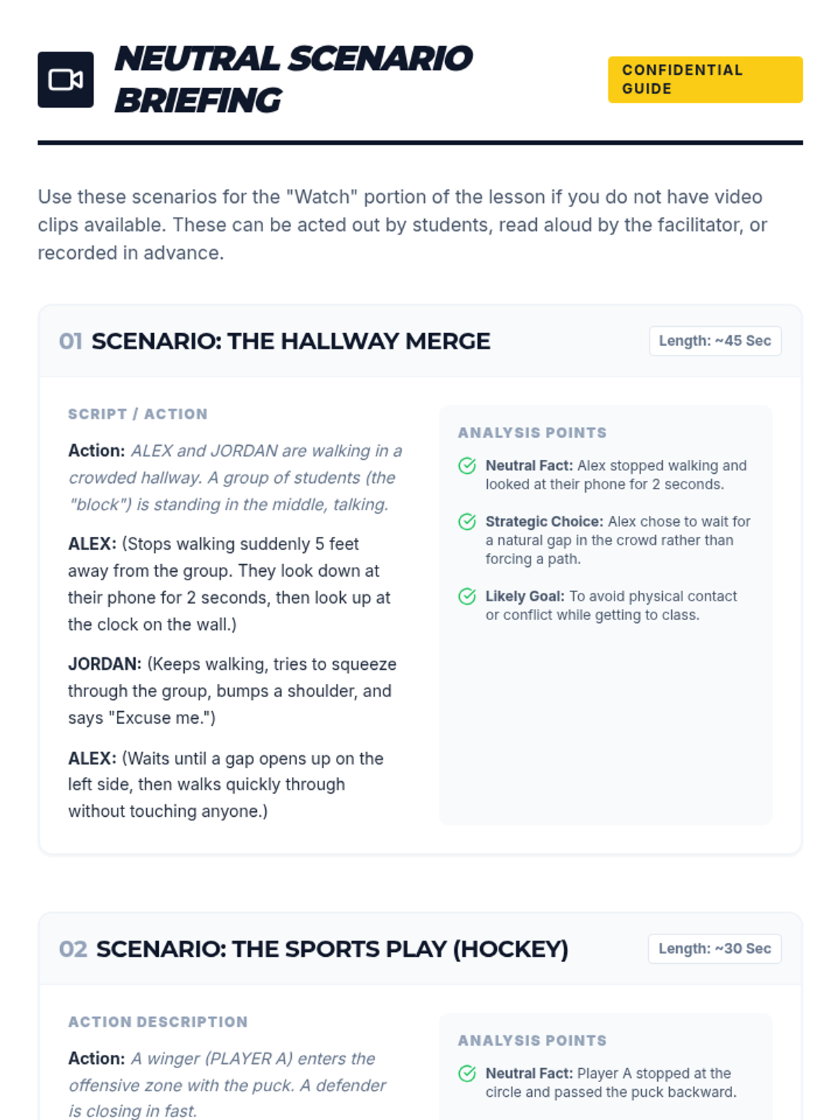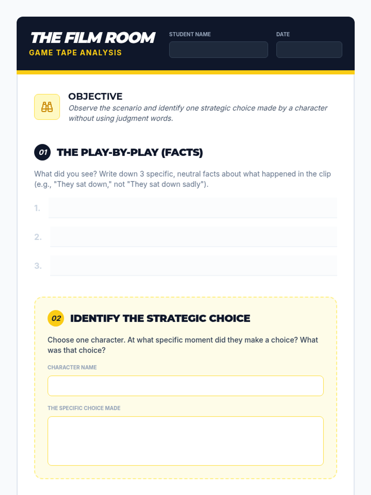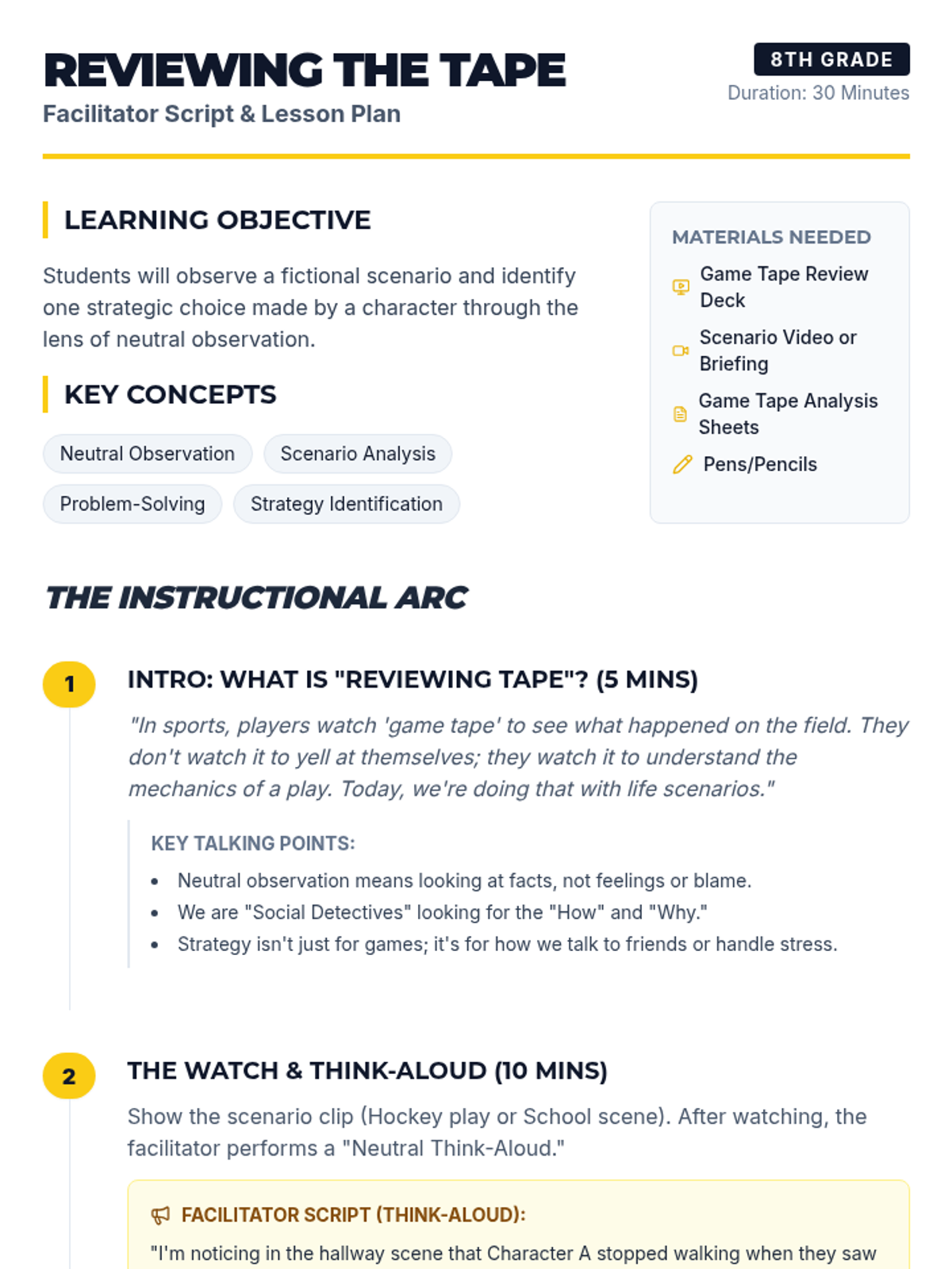 A 30-minute social-emotional learning lesson for 8th graders focused on neutral observation and strategic analysis of social and performance scenarios using the metaphor of 'reviewing game tape'. Students learn to identify key decision points without assigning blame.