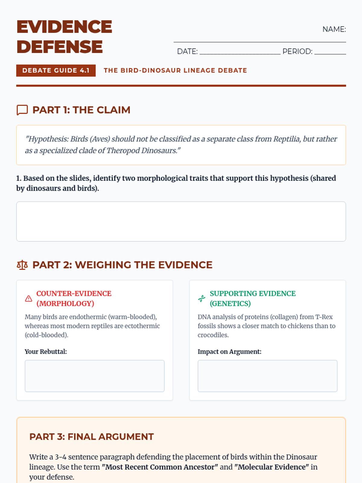 Students evaluate conflicting data (morphology vs. genetics) in the bird-dinosaur lineage to debate and defend revised phylogenetic trees.