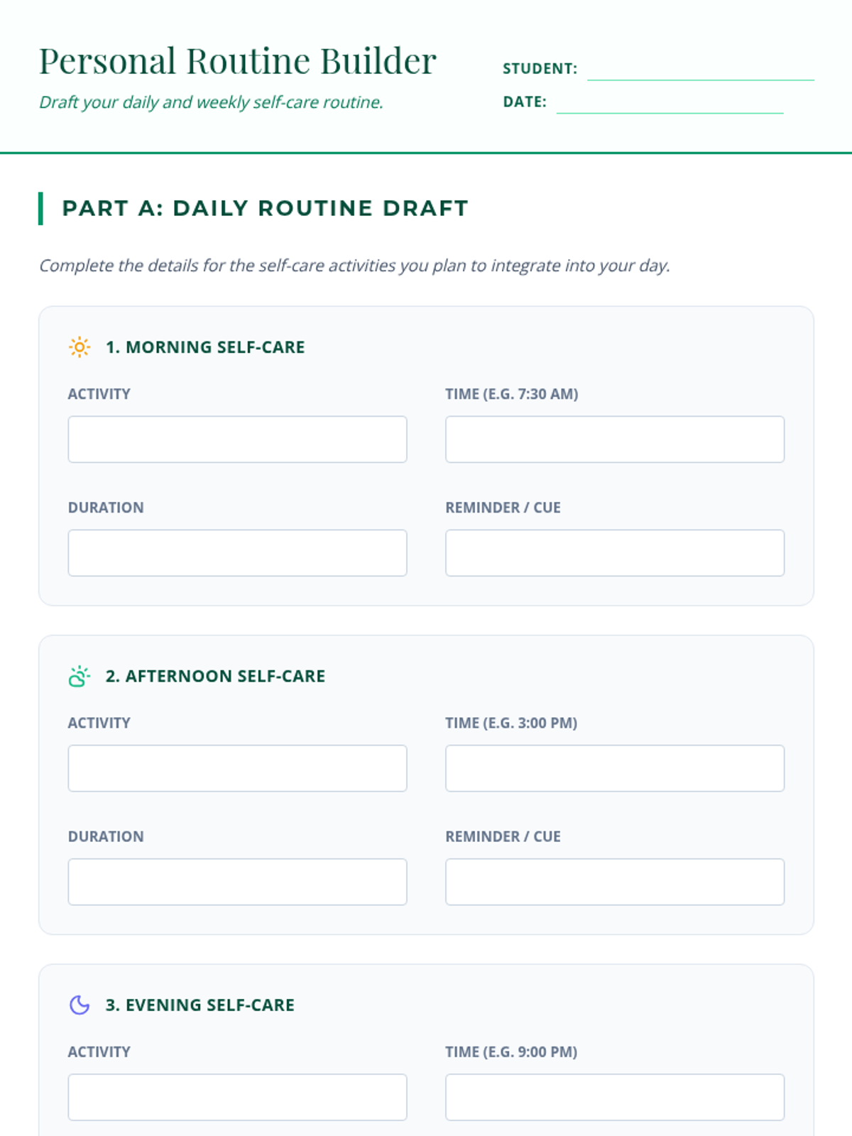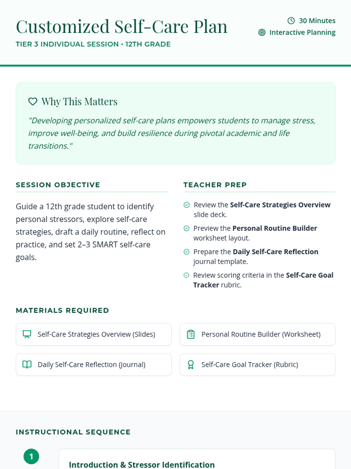 A Tier 3 individual session for a 12th-grade student to develop and implement a personal self-care plan for stress management, covering strategy exploration, routine building, and goal setting.