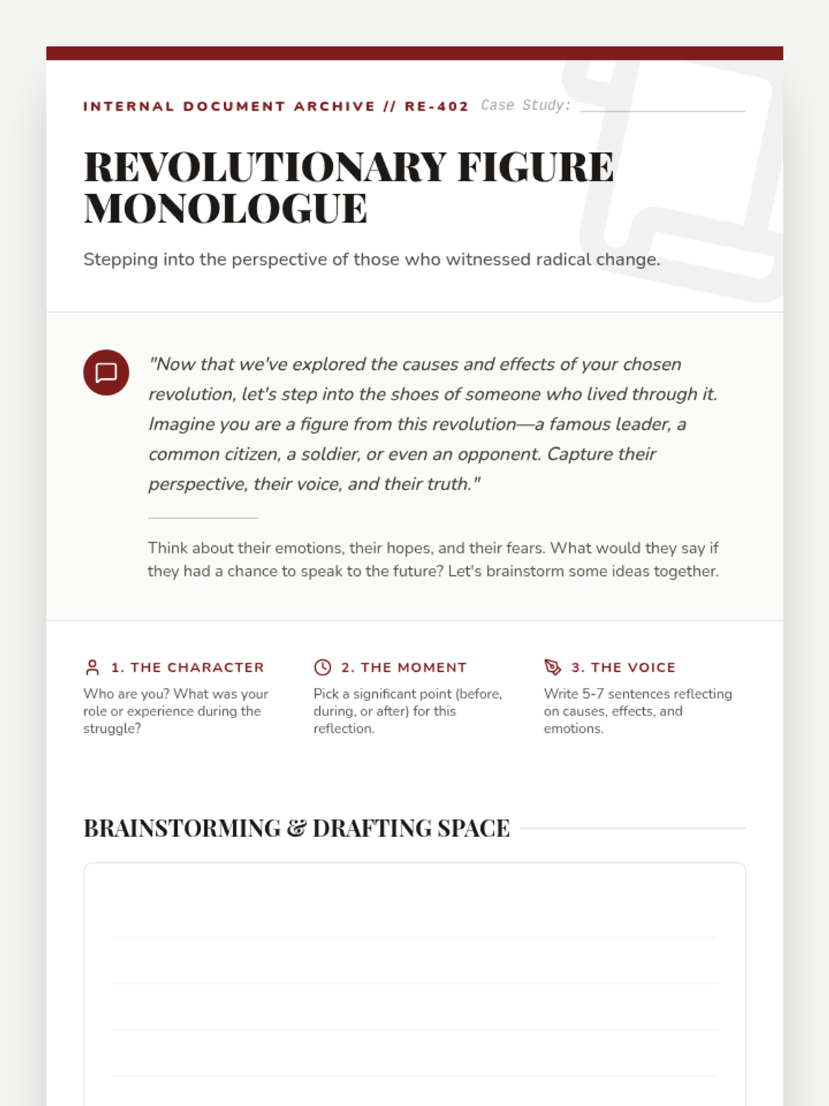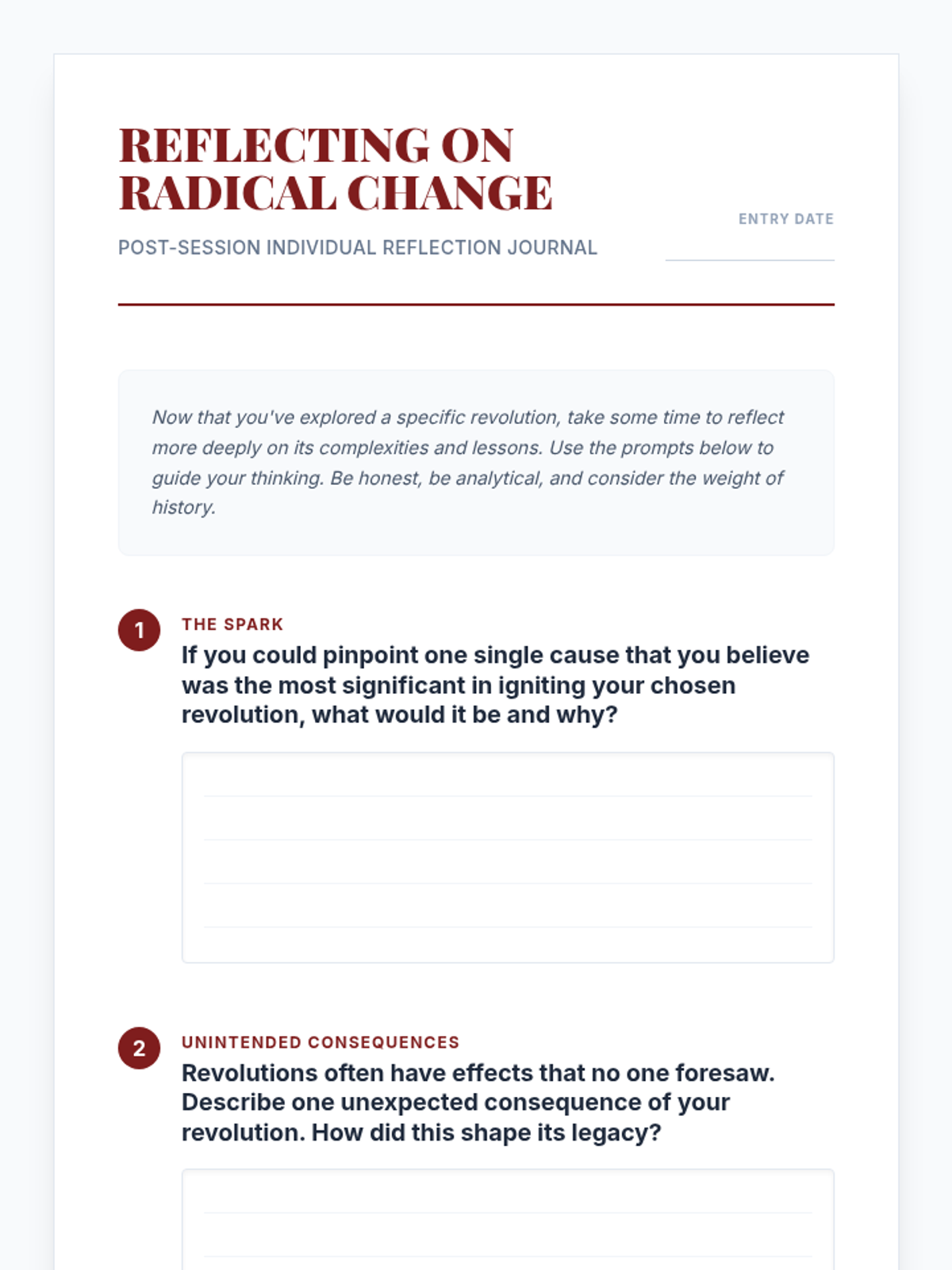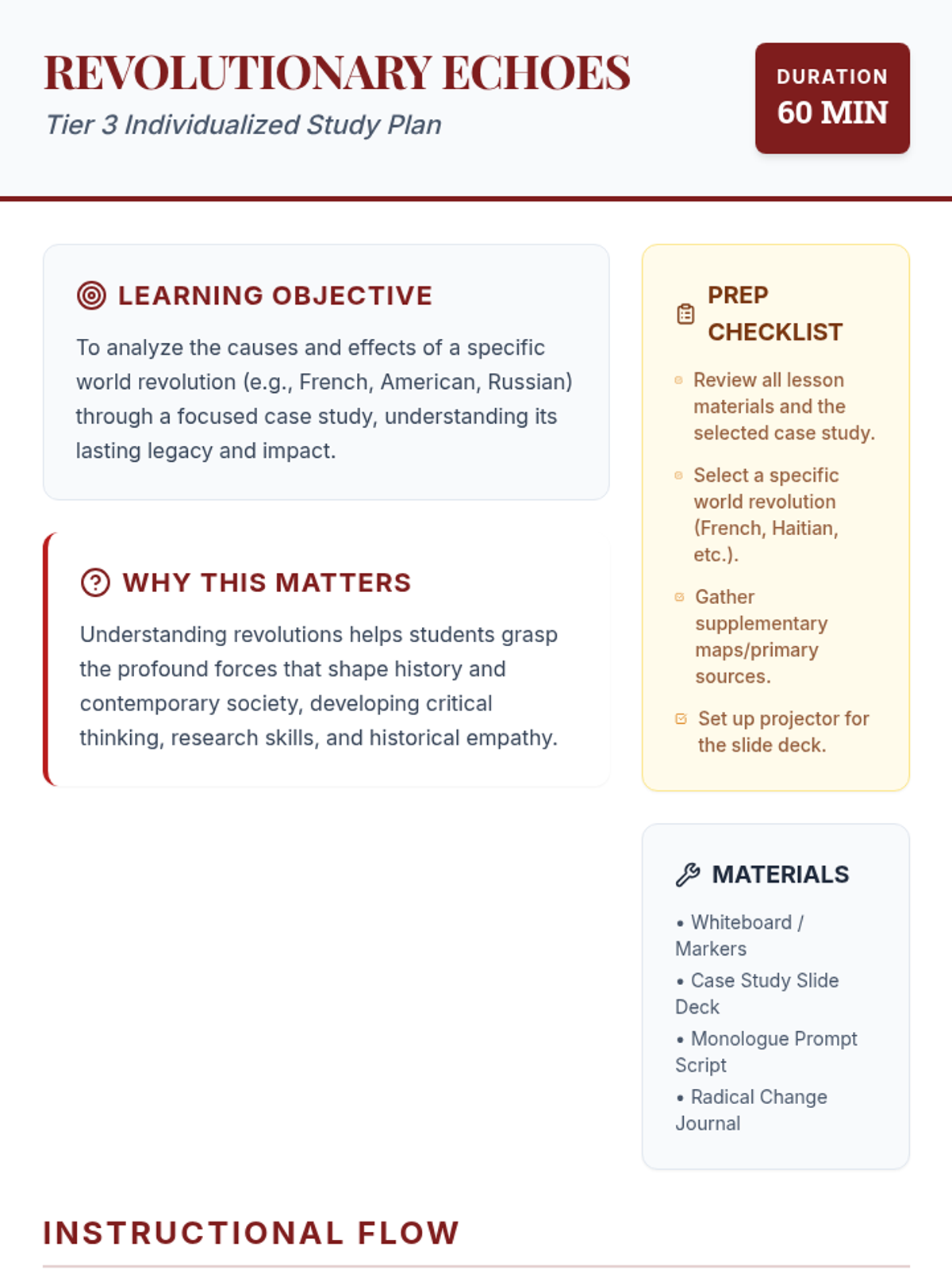 An individualized Tier 3 lesson for high school students exploring the causes, effects, and legacies of world revolutions through a focused case study and creative reflection.