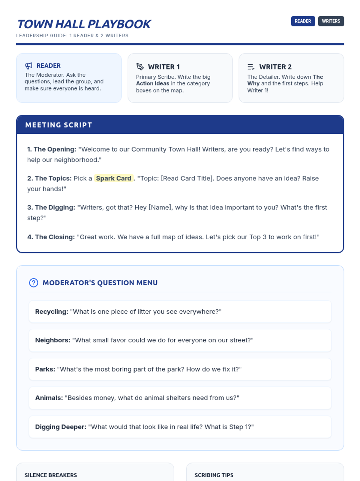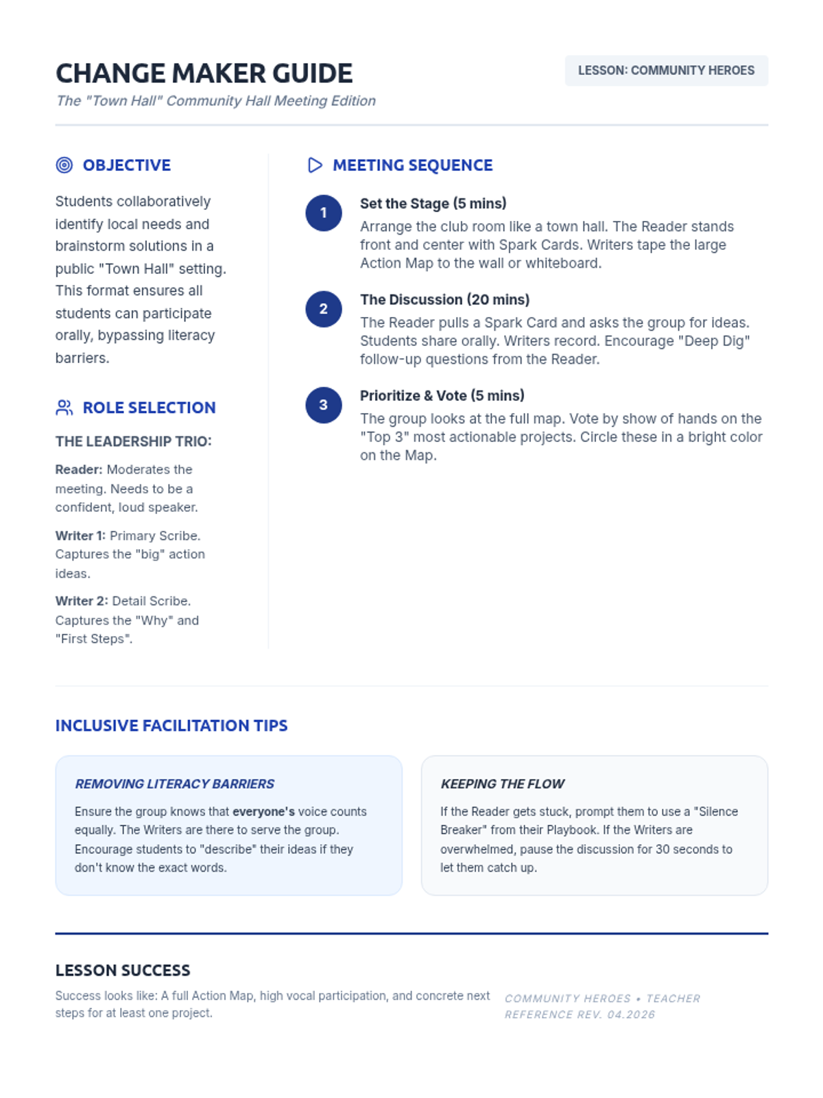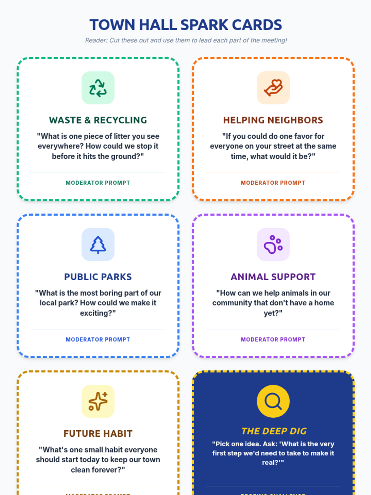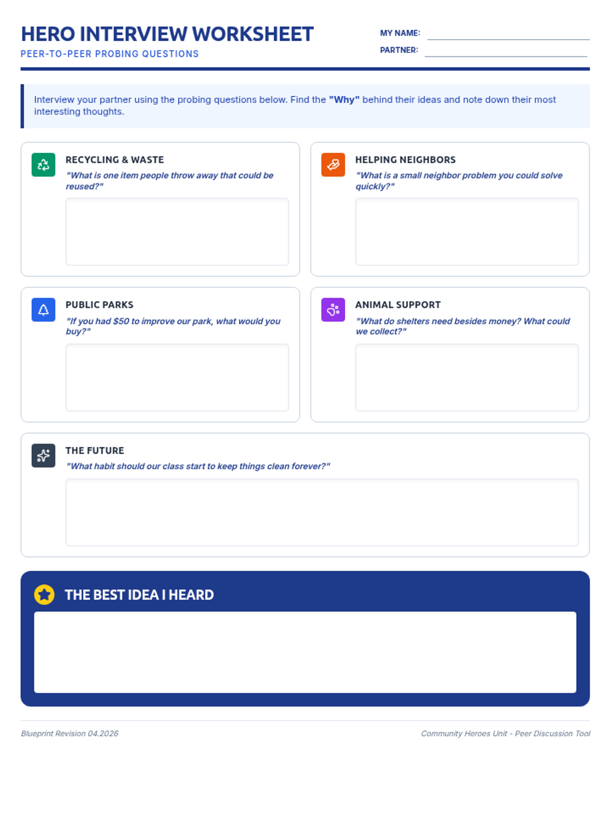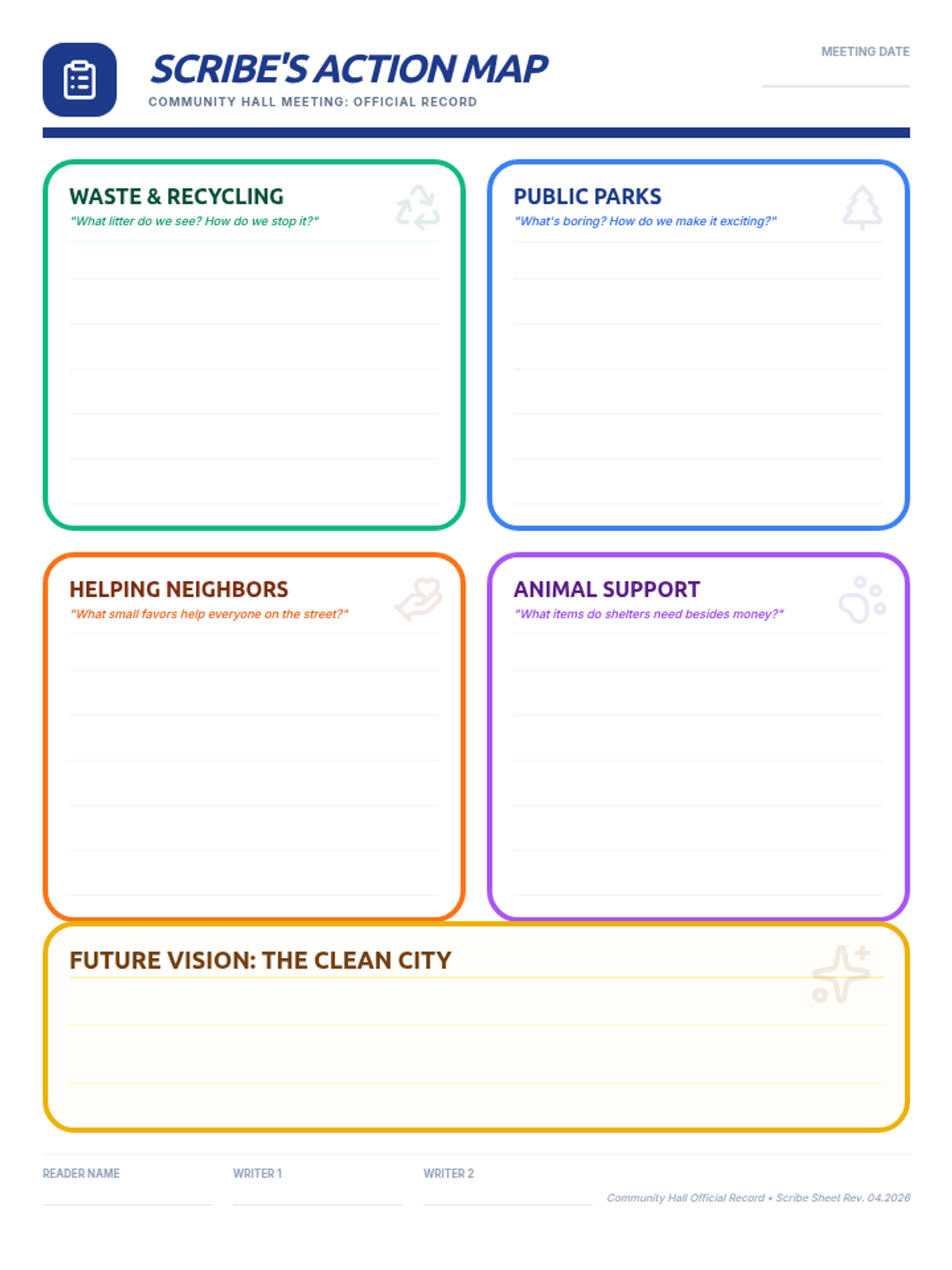 A lesson focused on civic engagement and community service, guiding students through brainstorming actionable ways to improve their local neighborhoods and support community organizations.