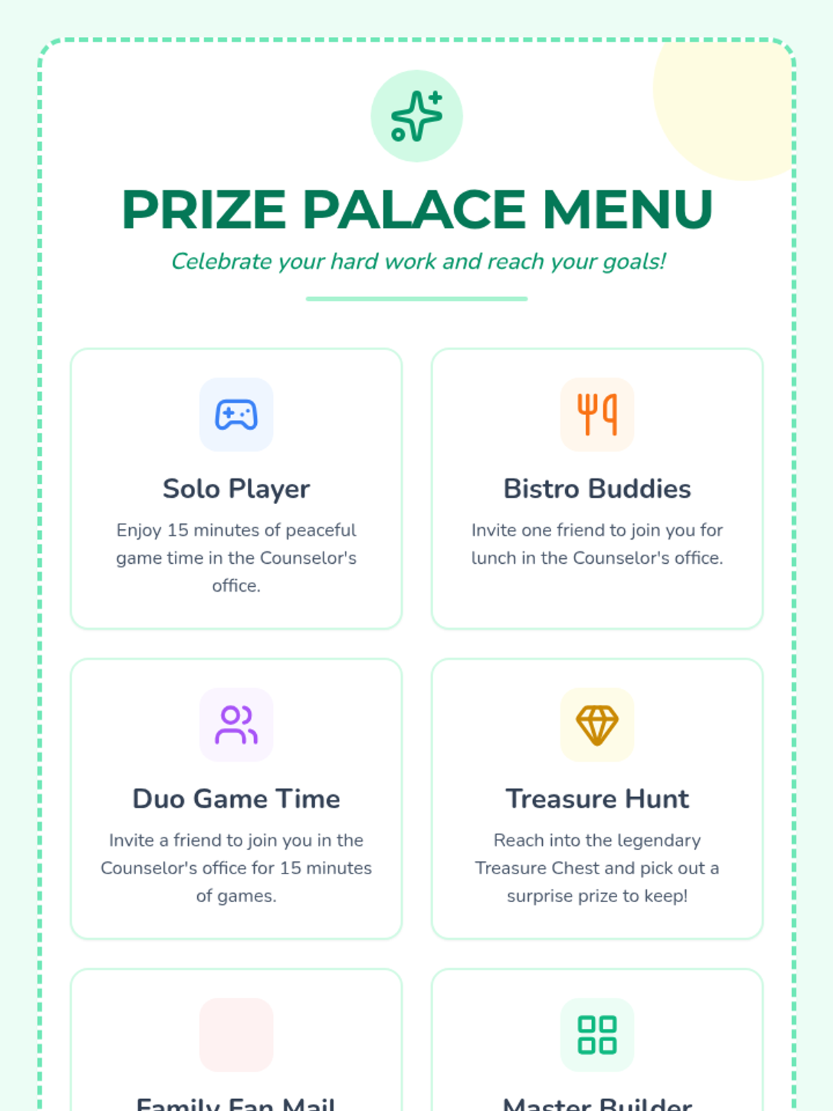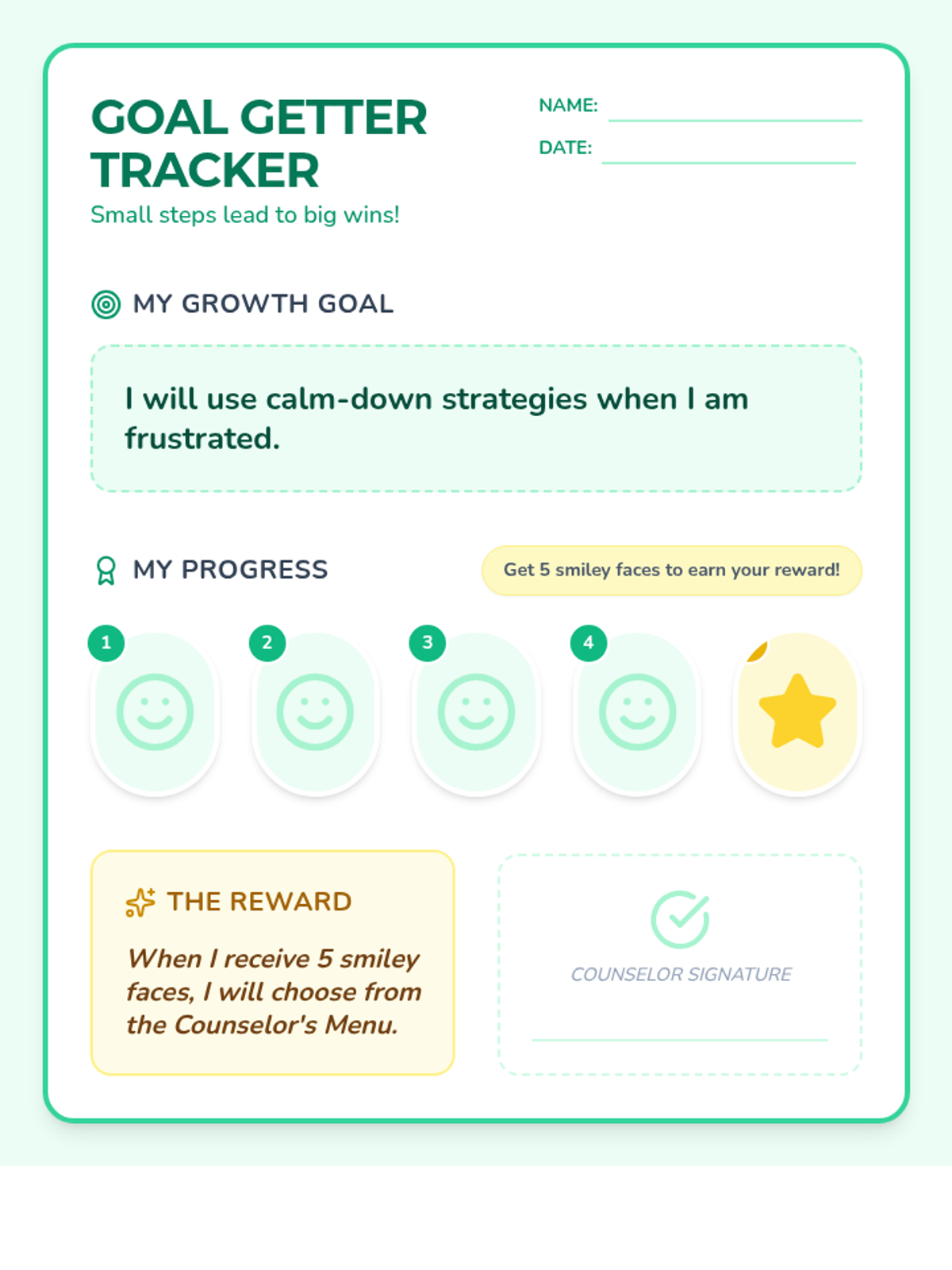 A comprehensive reward system for school counselors to use with students, featuring a visual reward menu and a goal tracking sheet to motivate positive behavior and growth.