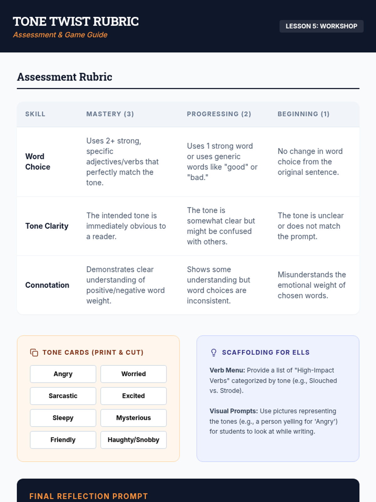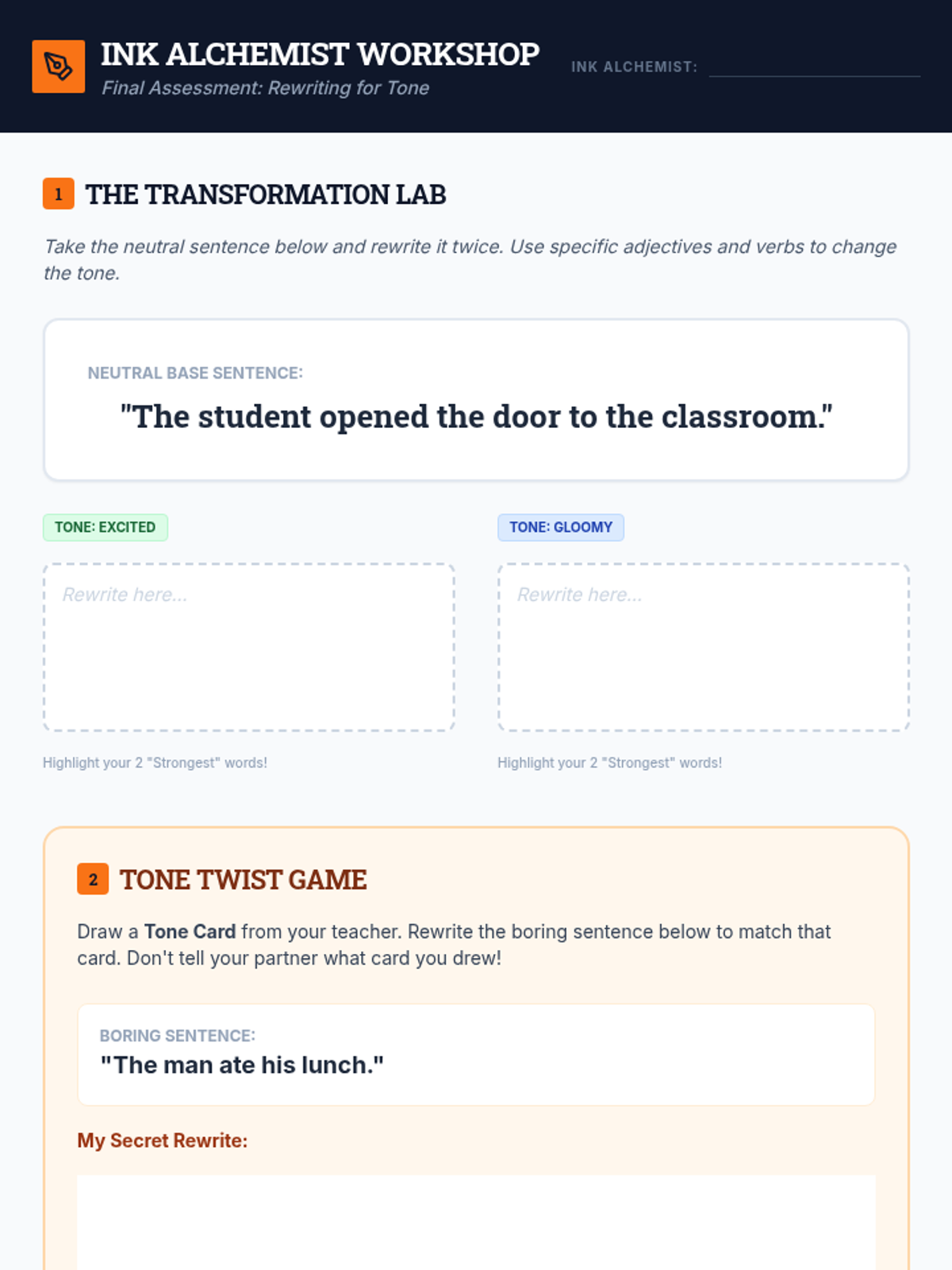 Students demonstrate mastery by rewriting neutral paragraphs into specific tones and participating in a 'Tone Twist' game.