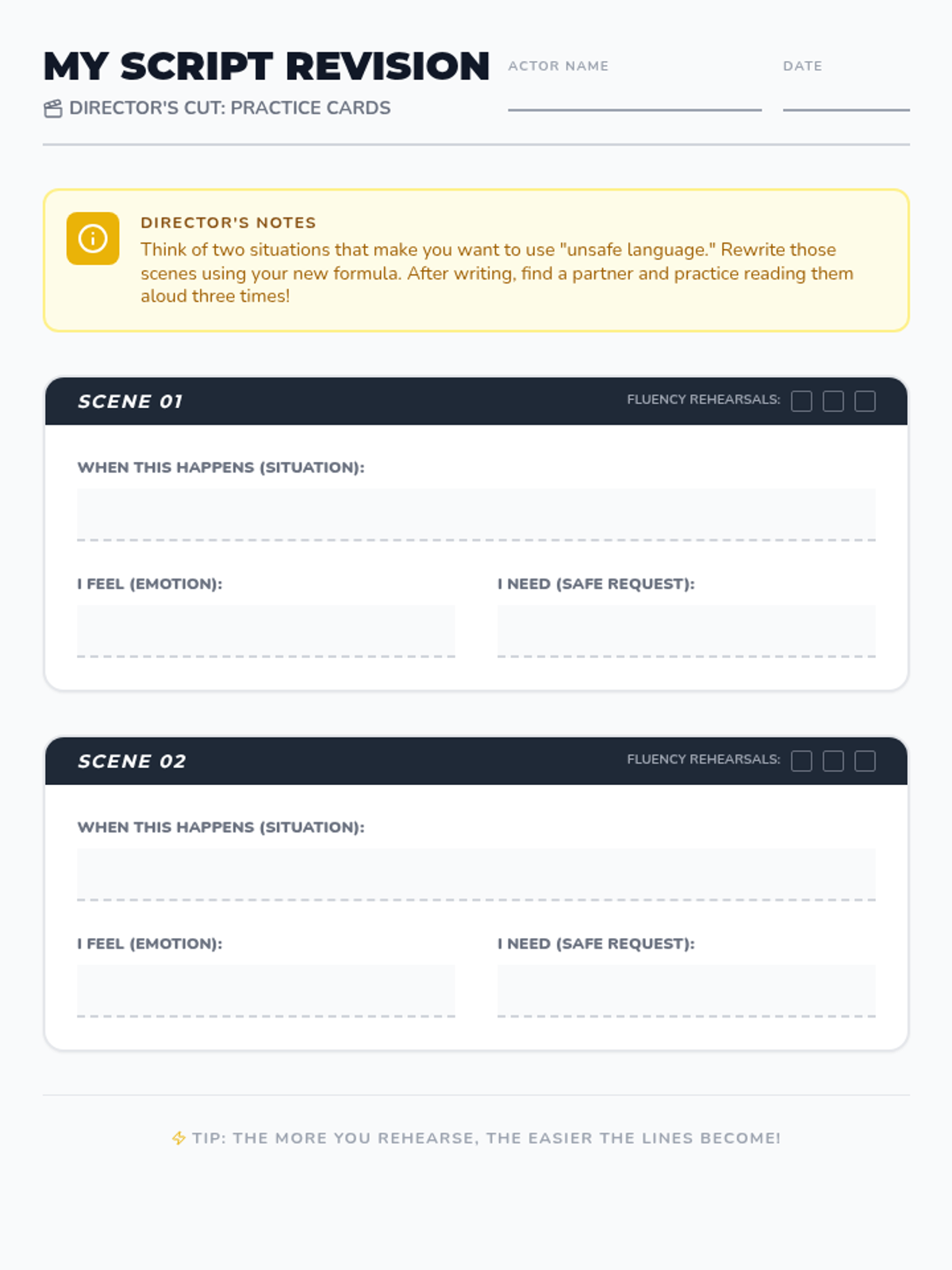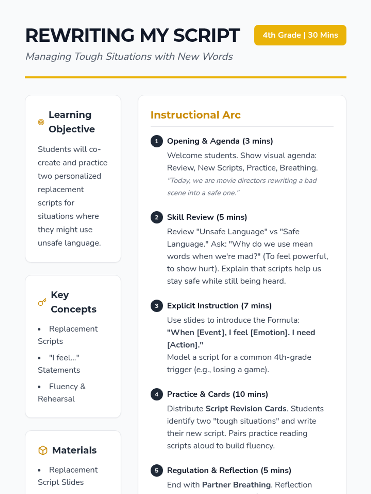A 30-minute social-emotional learning lesson for 4th graders focused on replacing unsafe language with personalized replacement scripts using 'I feel' statements and 'I need' requests.
