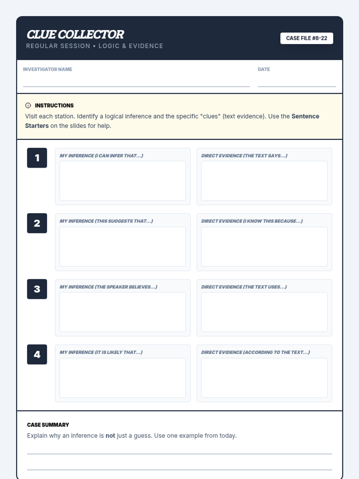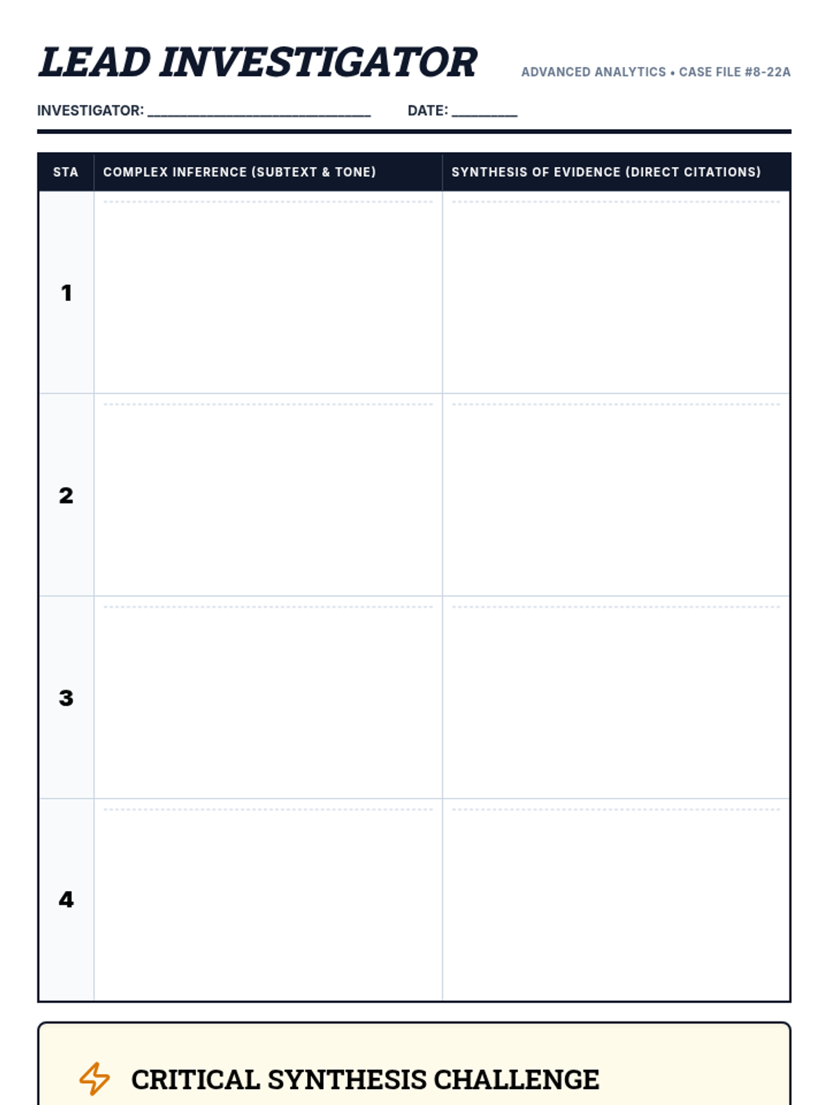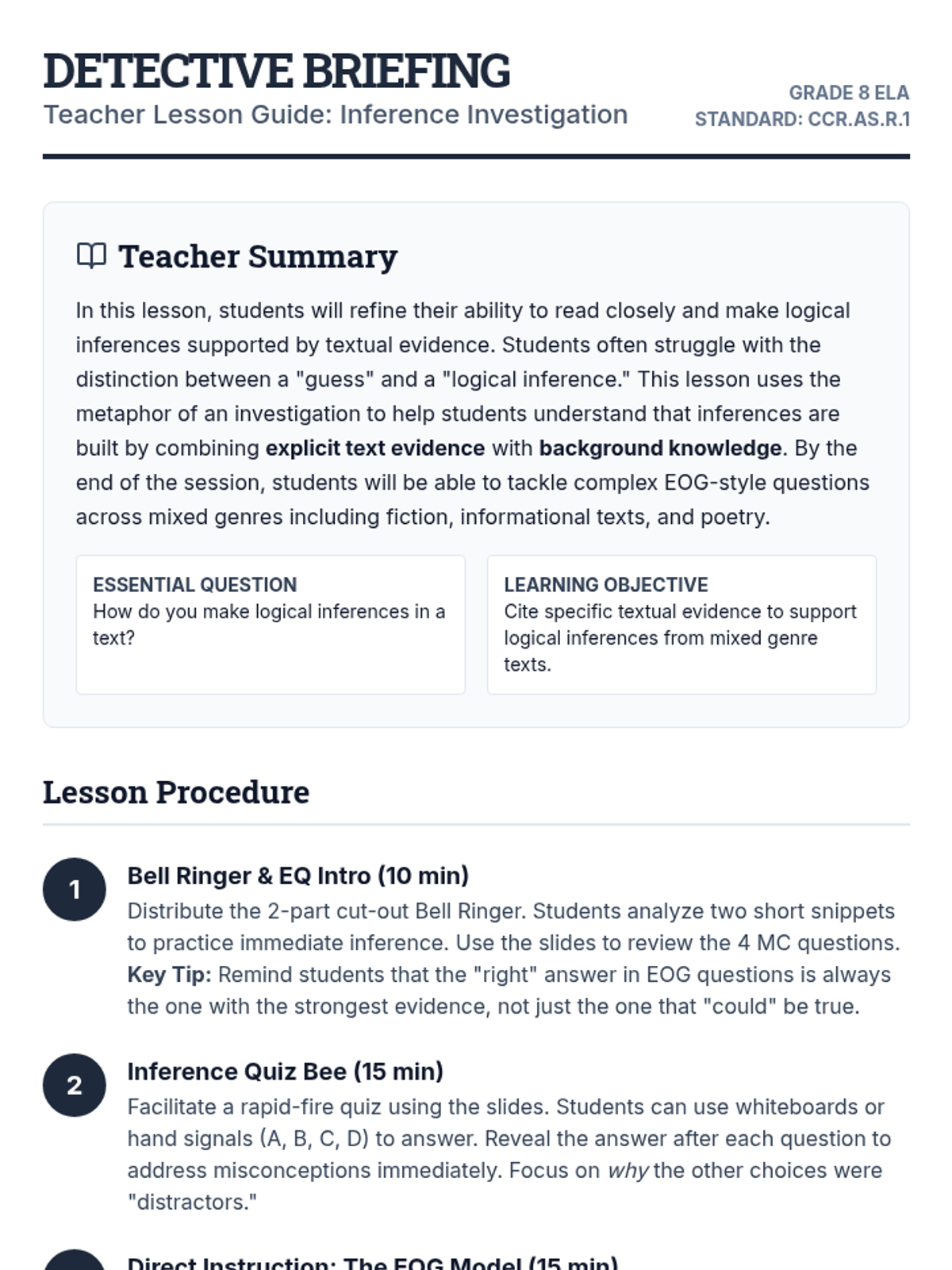 A comprehensive Grade 8 ELA lesson focused on mastering logical inferences across mixed genres, utilizing a 'detective' theme to engage students in close reading and evidence-based reasoning.