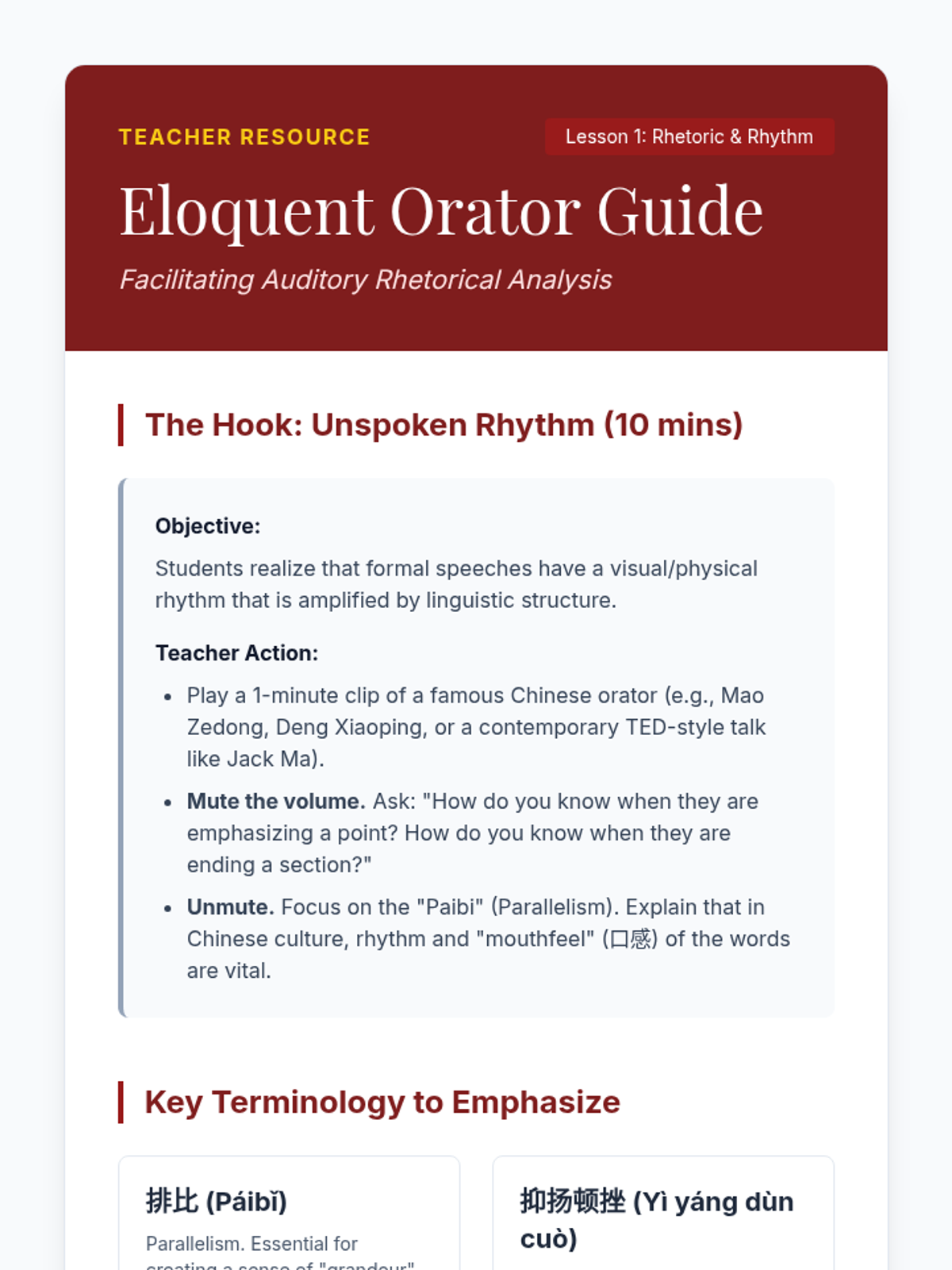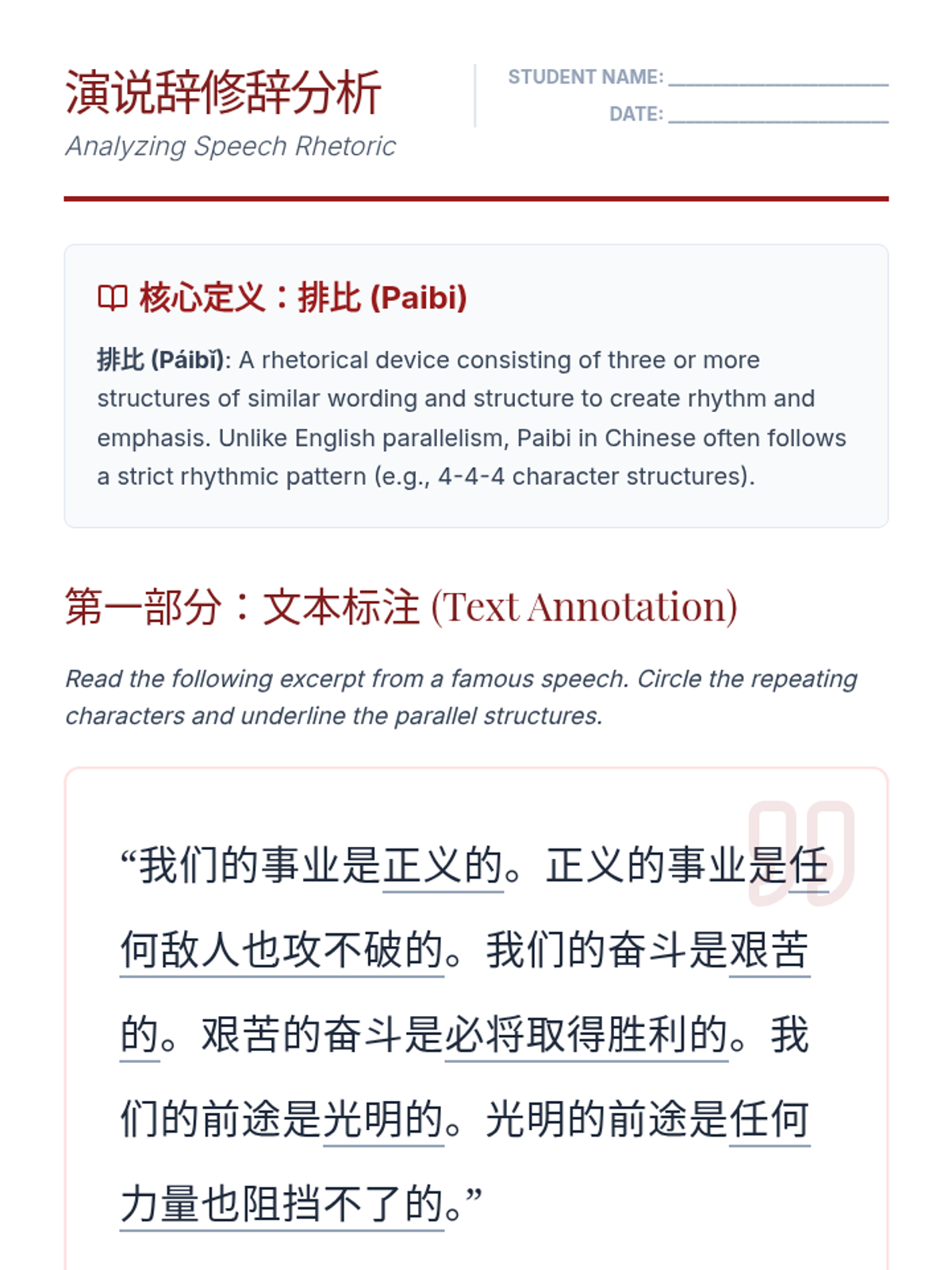 Students analyze the rhythm and rhetorical structure of famous Chinese speeches, focusing on the use of parallelism (Paibi) and repetition to engage an audience.