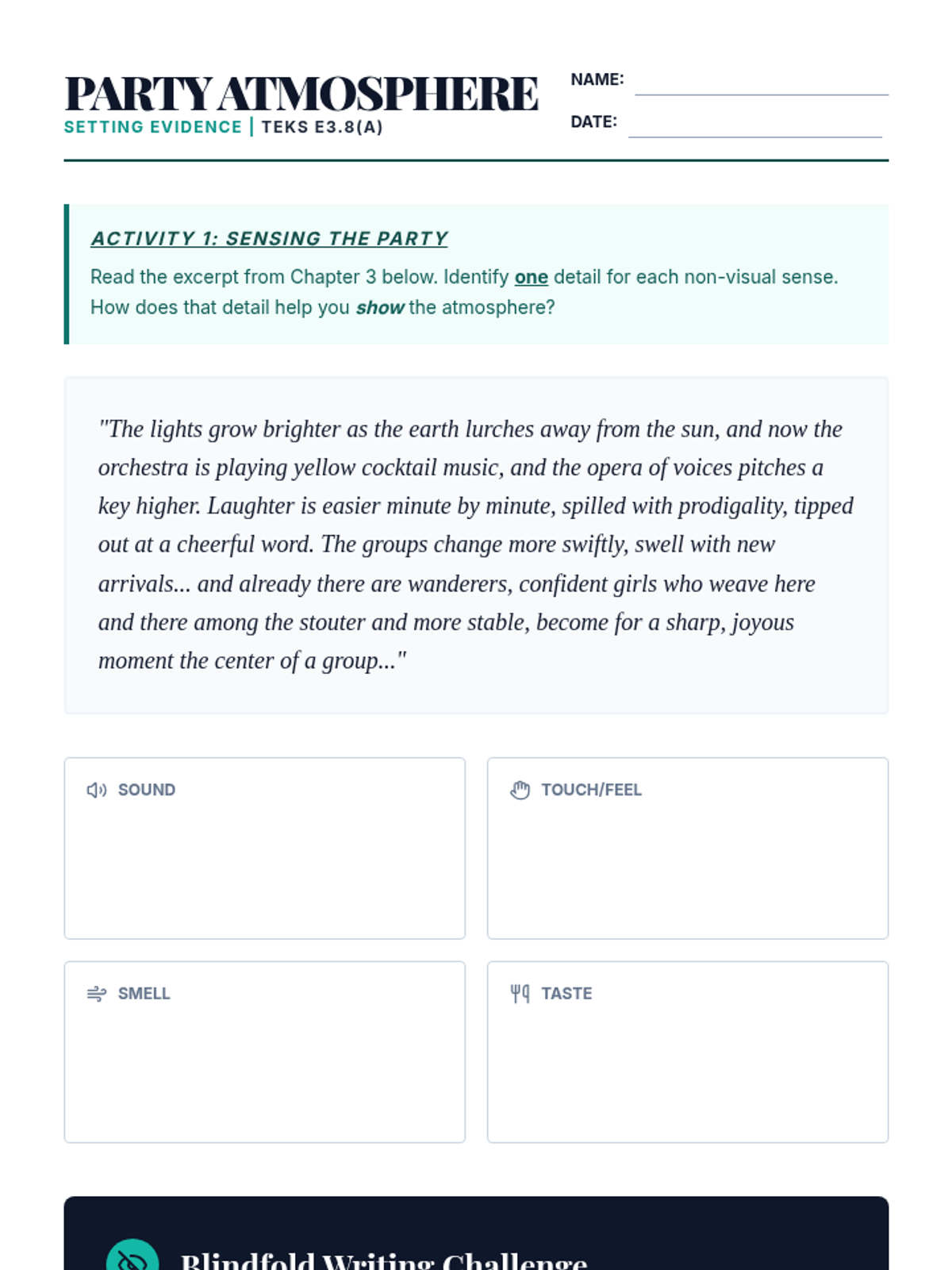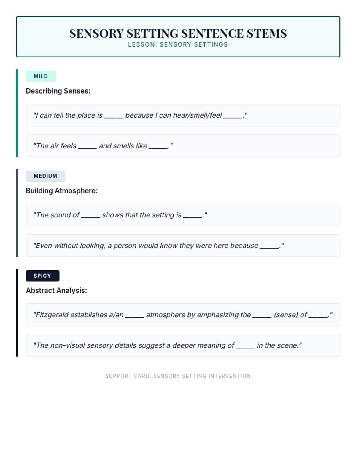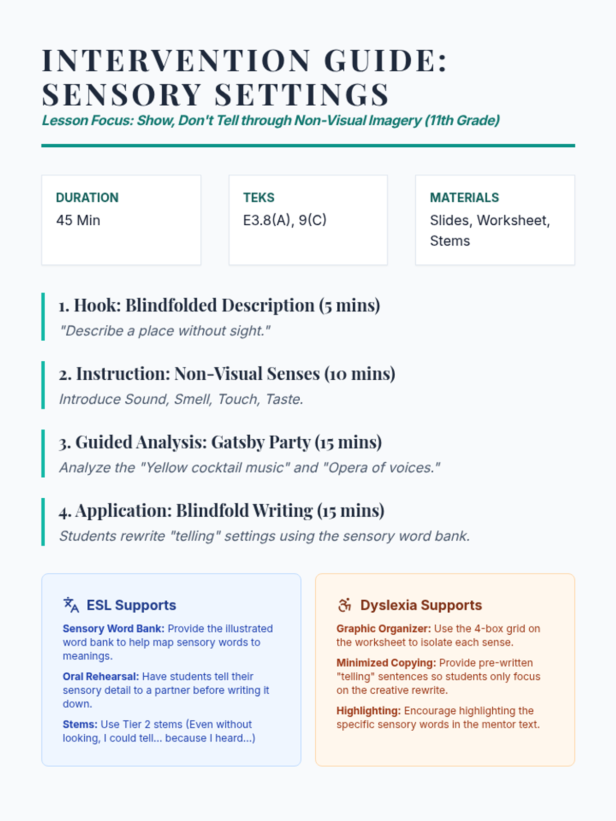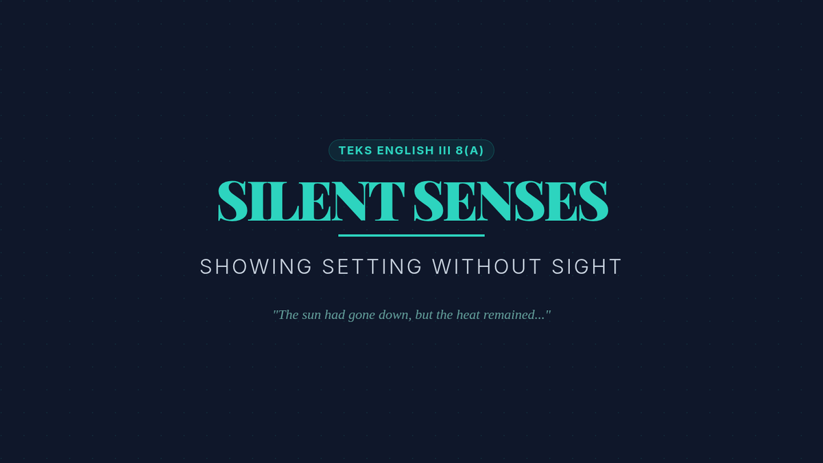 A 45-minute intervention lesson focusing on 'Show, Don't Tell' in setting descriptions. Students will practice using sensory details—sound, smell, touch, and taste—to build atmosphere without relying on visual descriptions. Aligned with TEKS E3.8(A) and 9(C).