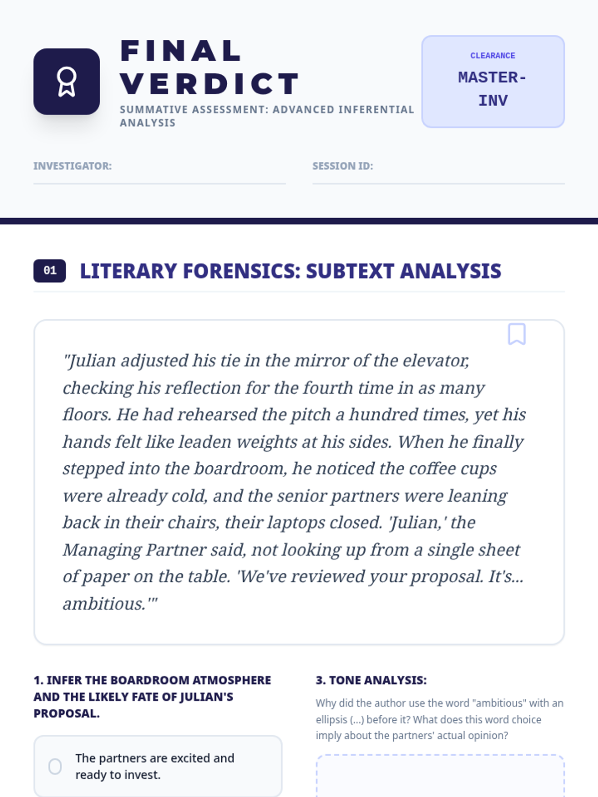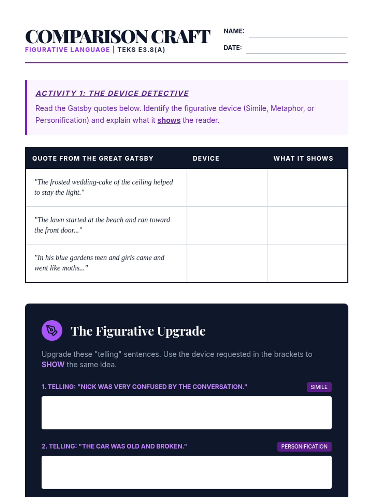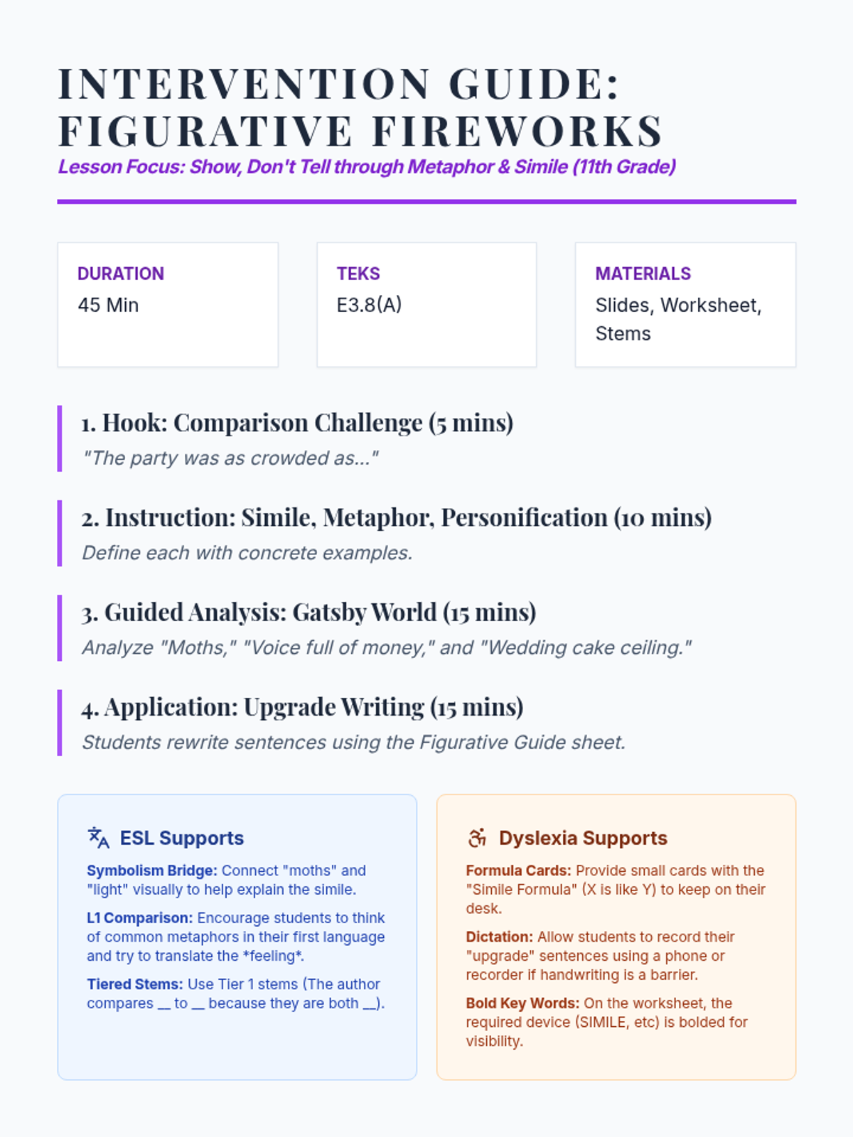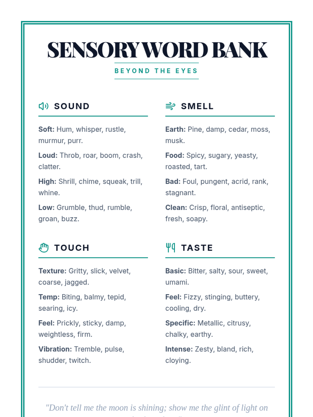 A 45-minute intervention lesson focusing on 'Show, Don't Tell' in setting descriptions. Students will practice using sensory details—sound, smell, touch, and taste—to build atmosphere without relying on visual descriptions. Aligned with TEKS E3.8(A) and 9(C).