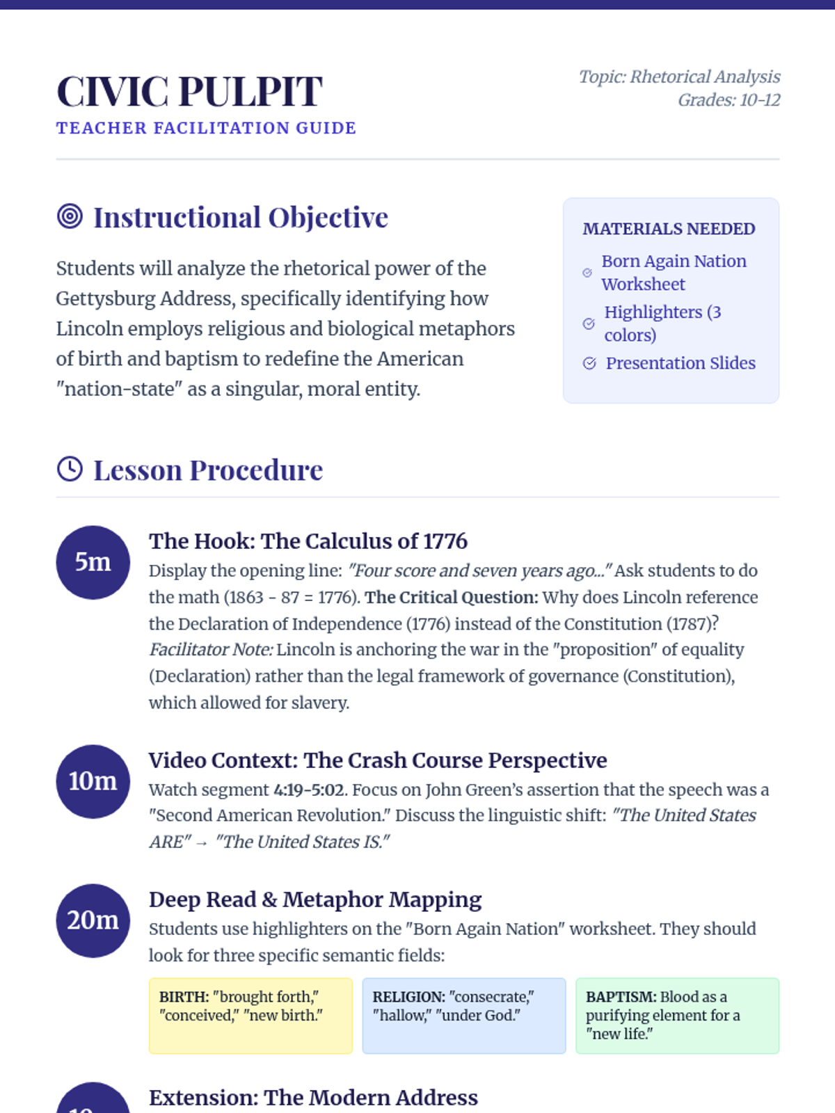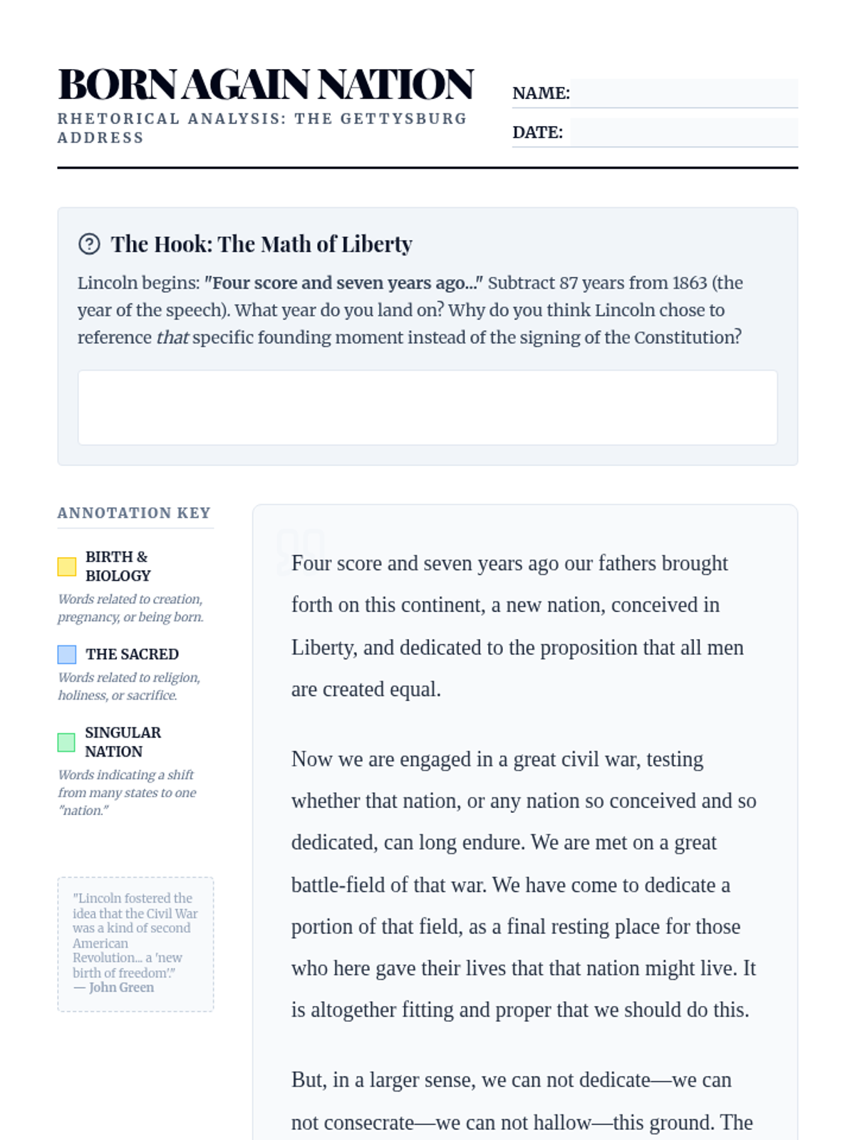 A rhetorical analysis of Abraham Lincoln's Gettysburg Address, focusing on its religious metaphors, the concept of a 'new birth of freedom,' and its role in redefining American national identity.